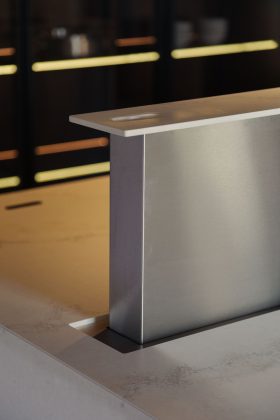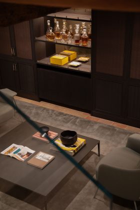"Il living si sviluppa in un’area dove trova posto un divano centrale e due mobili identici: uno è pensato per ospitare la TV e la libreria a tutta altezza, mentre l’altro con ante chiuse che rientrano, dà spazio a un concetto di home office. Al dining si accede dalla cucina e dal living e comprende un tavolo e un'armadiatura con parte centrale a vetrina tutto sempre de L’Ottocento". Particolare risulta proprio il tavolo Meridiana, realizzato in rovere nero laccato poro aperto.