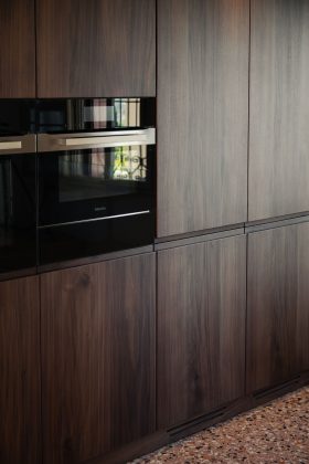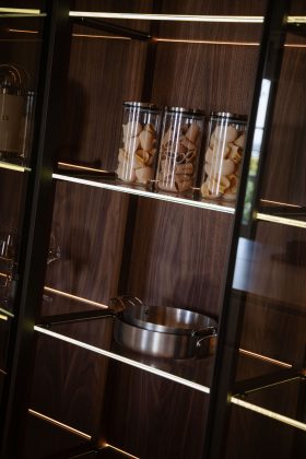 "Le armadiature del modello Archetipo, a tutta altezza, sono realizzate in Noce Canaletto e attrezzate con ante rientranti, vani dispensa e mensole. Accanto alle colonne per frigo e forni, ecco le vetrine con mensole illuminate che conferiscono leggerezza all’ambiente."