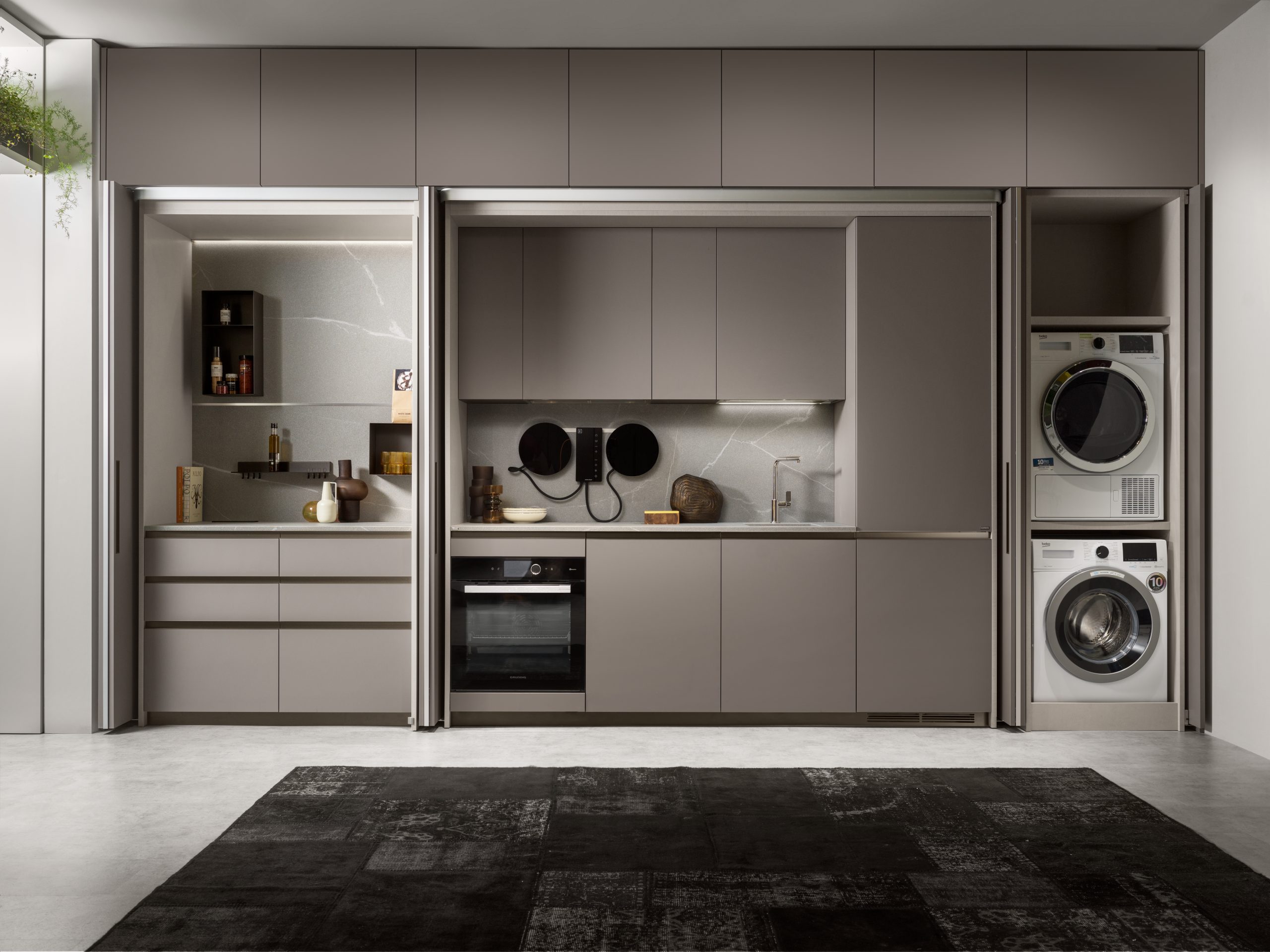 L'incredibile versatilità del progetto BoxLife di Scavolini - realizzato in collaborazione con lo Studio di Design Internazionale Rainlight e il suo direttore creativo Yorgo Lykouria - trasforma gli spazi e propone nuove funzioni grazie all’incredibile sistema di armadi attrezzati con ante a scomparsa, progettabili in soluzioni lineari, ad angolo o a golfo. Concepito sull’idea di nascondere per organizzare, il sistema di Scavolini integra varie funzioni: oltre alla cucina Boxi, prevede anche la zona lavanderia, qui presentata con sistema di apertura per armadio Switch e composta da asciugatrice e lavatrice a colonna ed un vano superiore. In questa soluzione le ante della armadiatura sono in Fenix Grigio Londra Scav861 con sistema di apertura pieghevole rientrante.