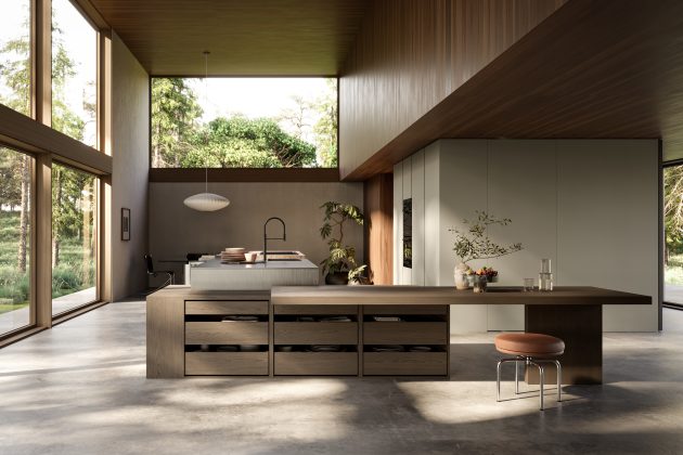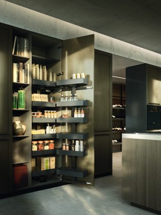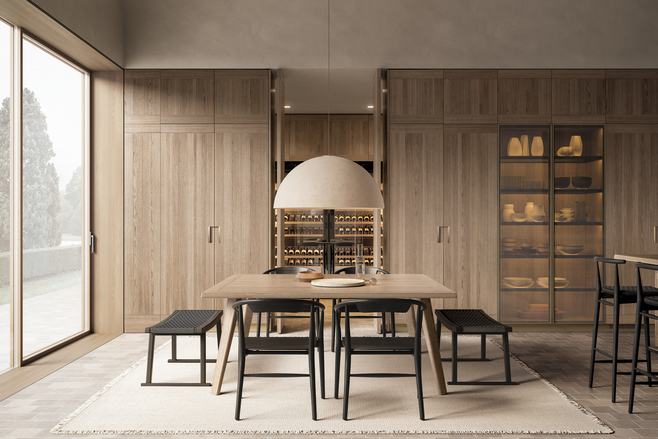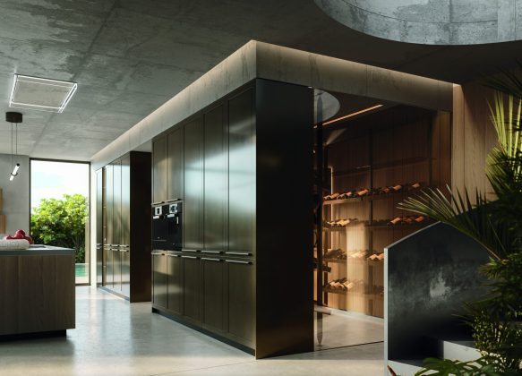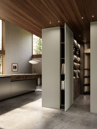 Un blocco colonne a tutta altezza nasconde una cambusa con winery, accessibile tramite la colonna walk-in di fronte al tavolo-penisola. È la proposta realizzata da Doimo Cucine nell’ambito del Progetto D12, che si connota per l’anta D12 spessa 12 mm realizzata con anima in alluminio. La cambusa è in impiallacciato Premium olmo Michelangelo ed è organizzata con vani e con una cantina.