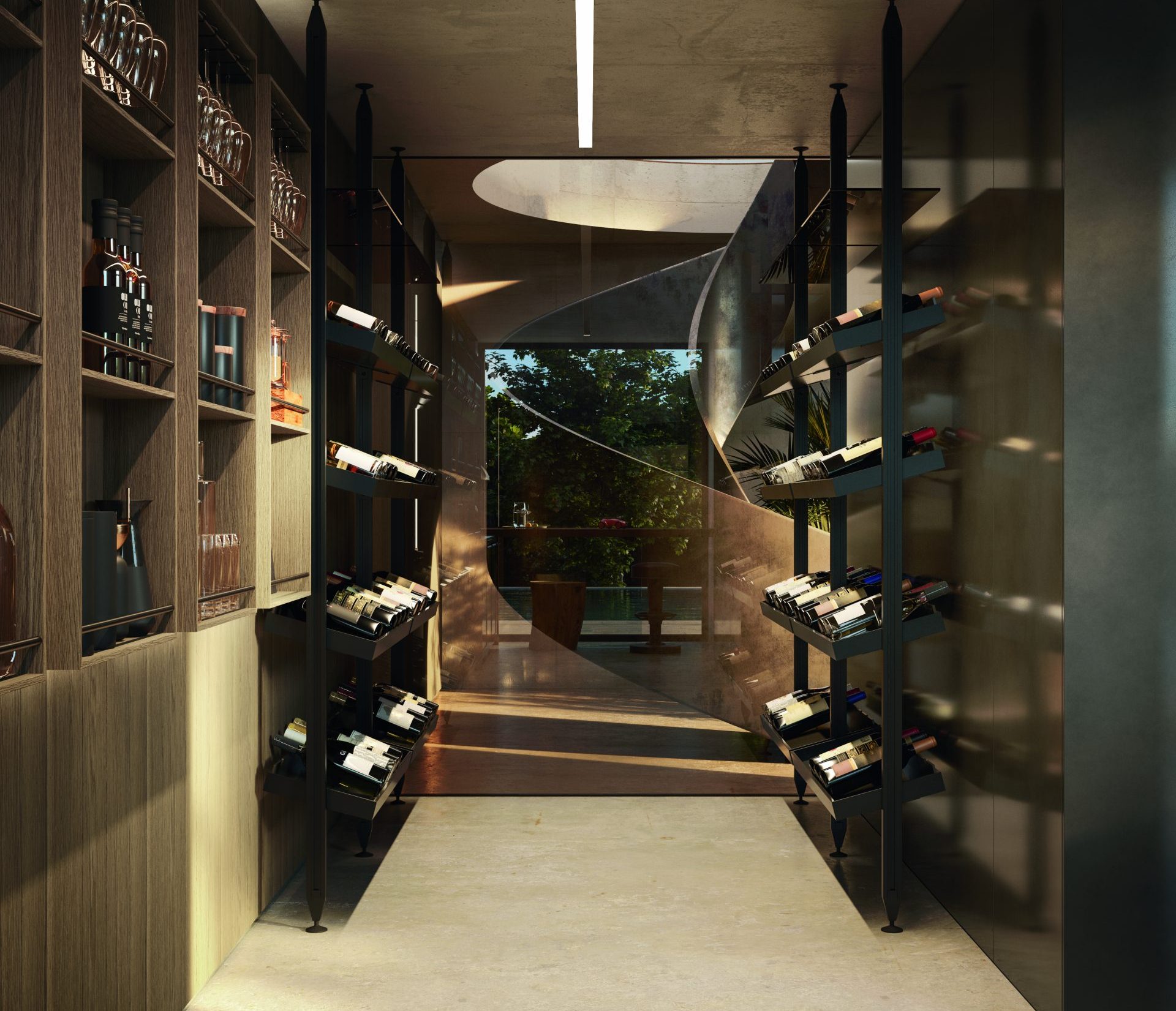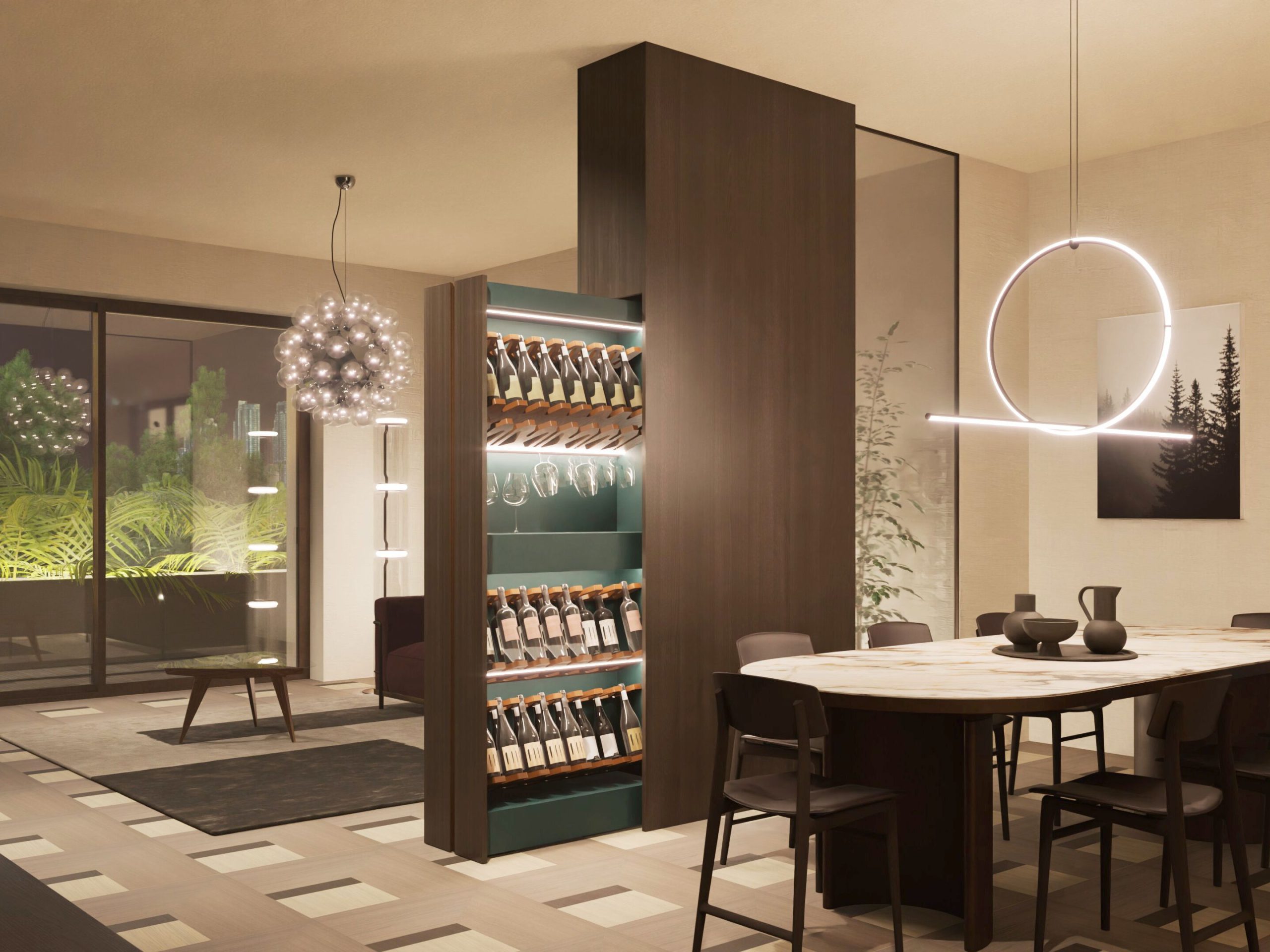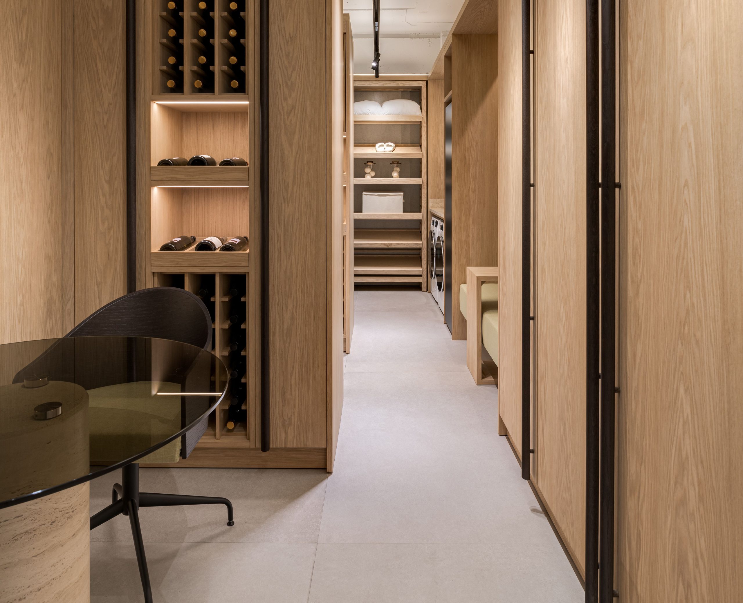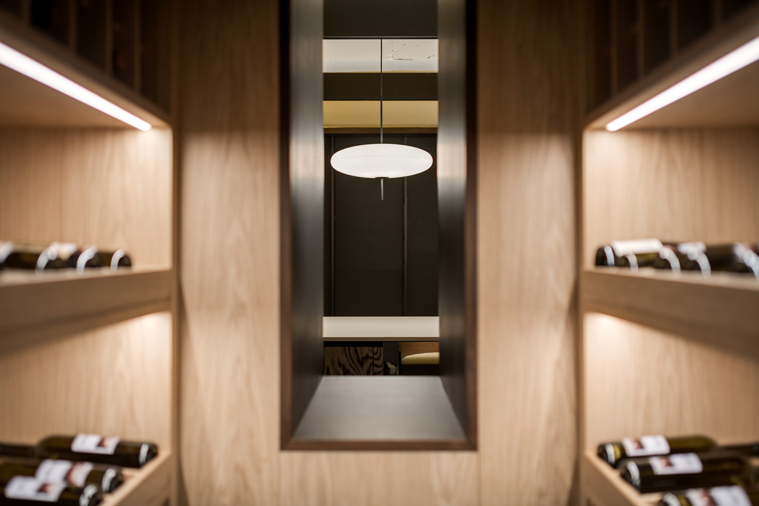 Si nasconde alla vista lo spazio “cantina” attrezzato con gli elementi Vina della Duet Collection di Arclinea, luogo ideale per la conservazione delle bottiglie. Lo spazio cantina inserito tra alle colonne è accessibile attraverso la doppia porta Frame System, che si integra alla parete. In questa soluzione -realizzata nell'ambiente allestito con il modello Principia (design Antonio Citterio) - Vina occupa i tre lati del vano creando un vero ambiente dalla massima accessibilità.