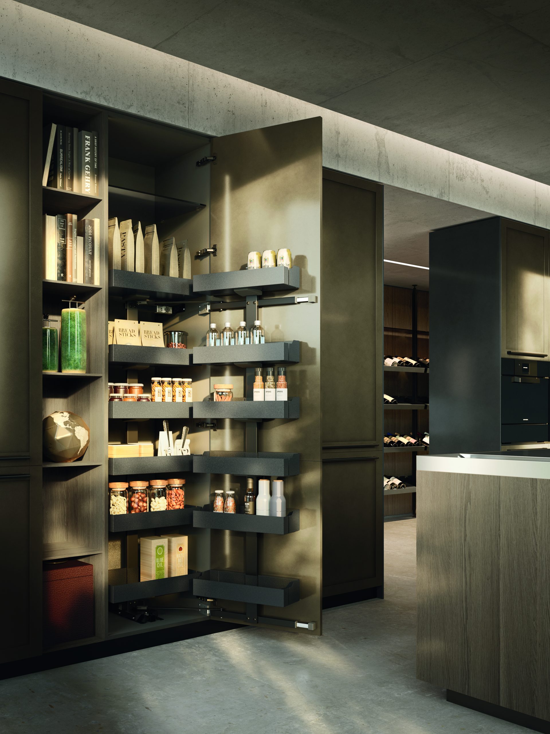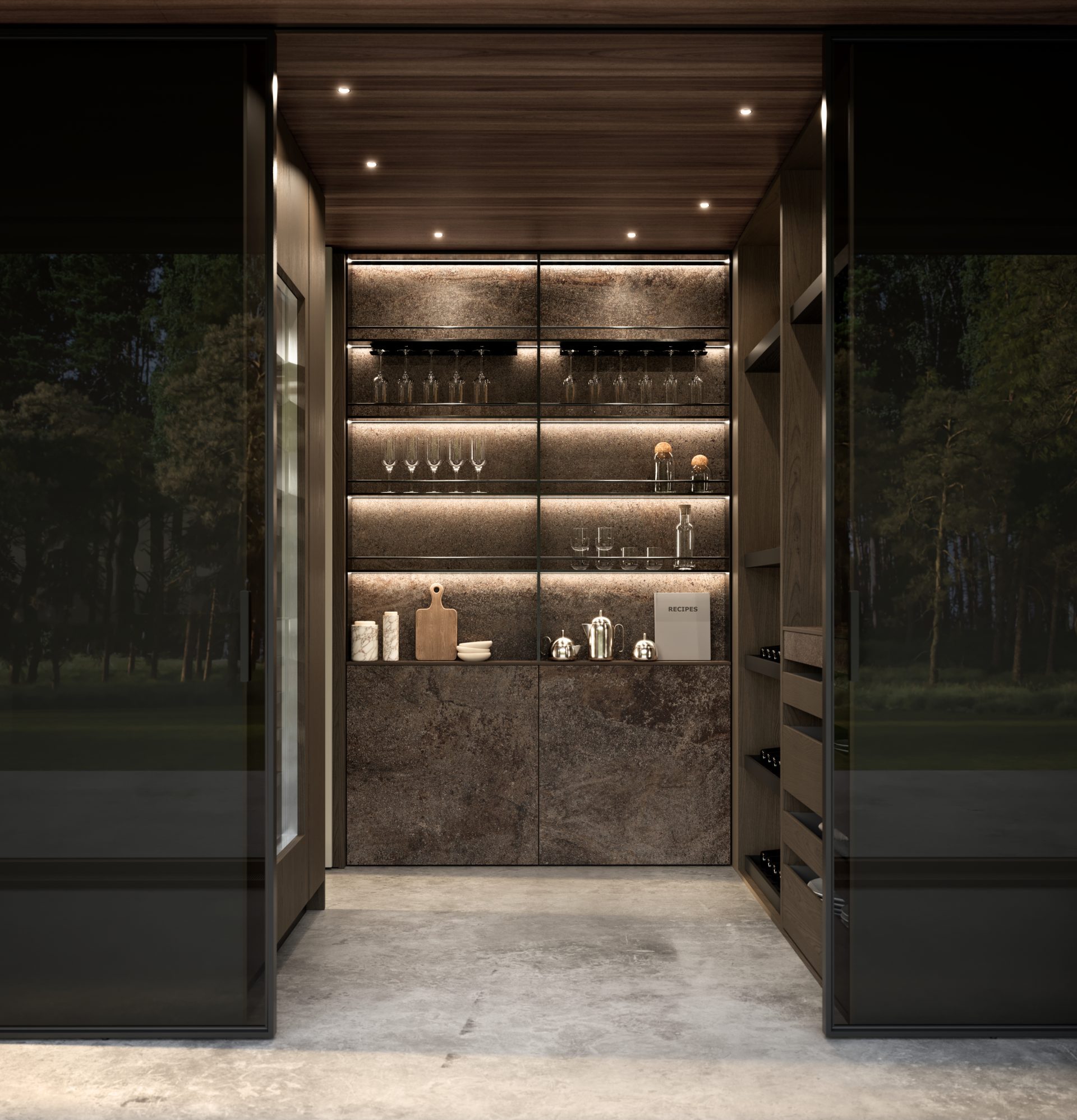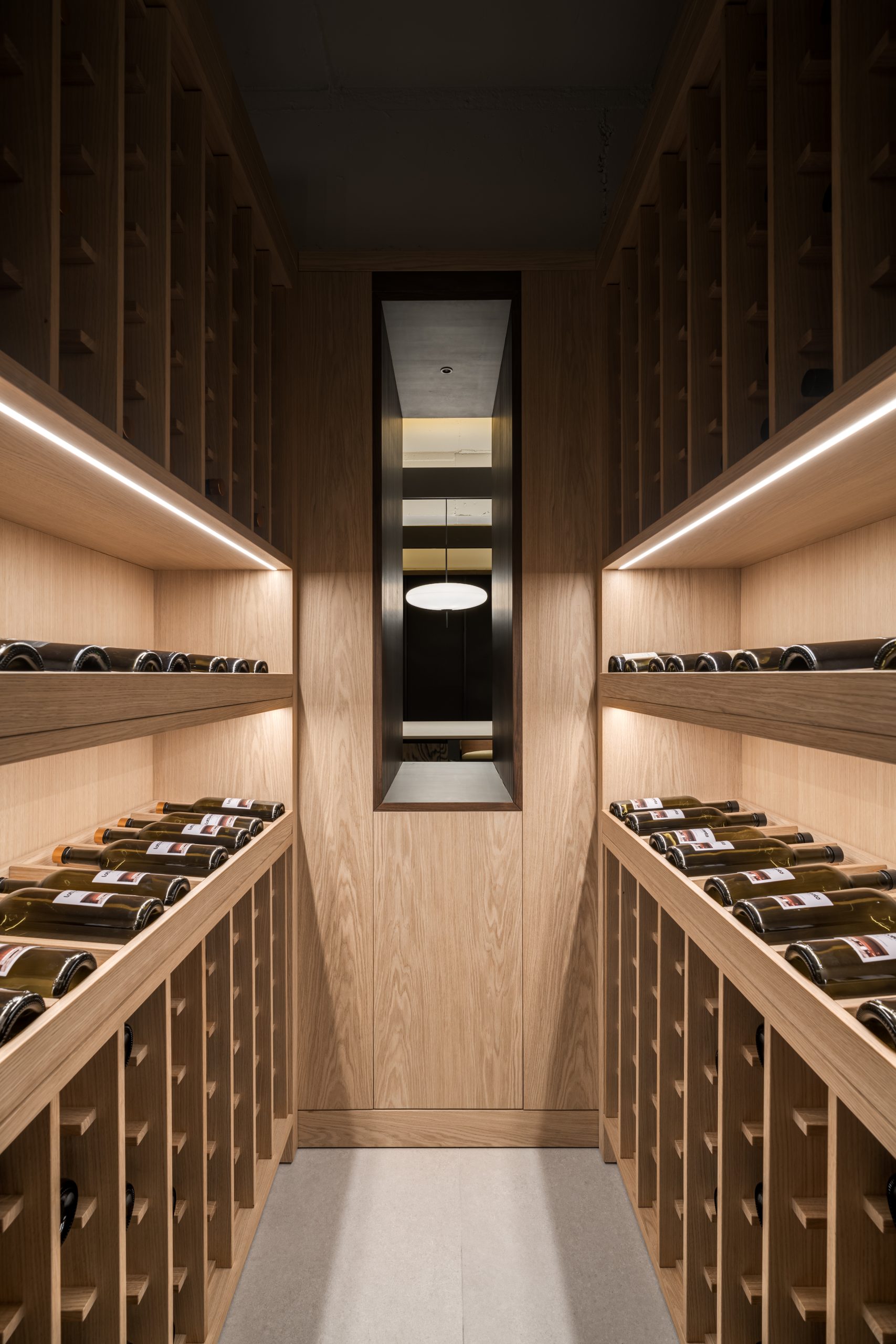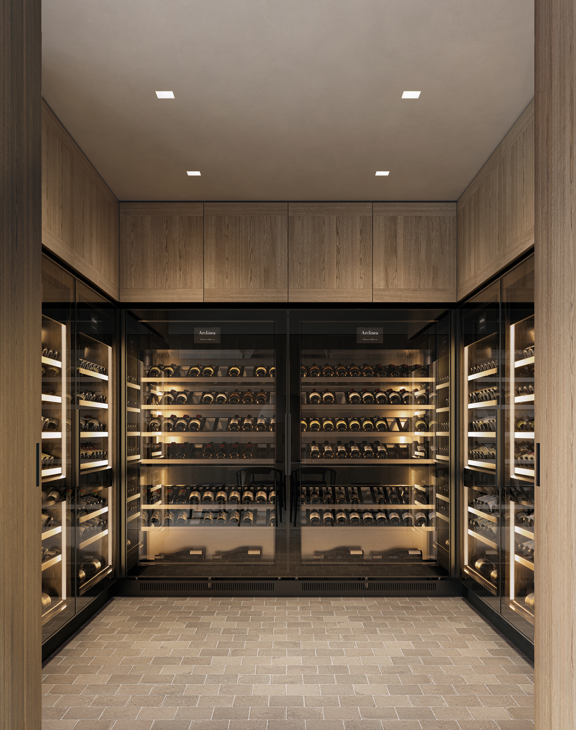 Si nasconde alla vista lo spazio “cantina” attrezzato con gli elementi Vina della Duet Collection di Arclinea, luogo ideale per la conservazione delle bottiglie. Lo spazio cantina inserito tra alle colonne è accessibile attraverso la doppia porta Frame System, che si integra alla parete. In questa soluzione -realizzata nell'ambiente allestito con il modello Principia (design Antonio Citterio) - Vina occupa i tre lati del vano creando un vero ambiente dalla massima accessibilità.