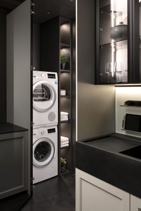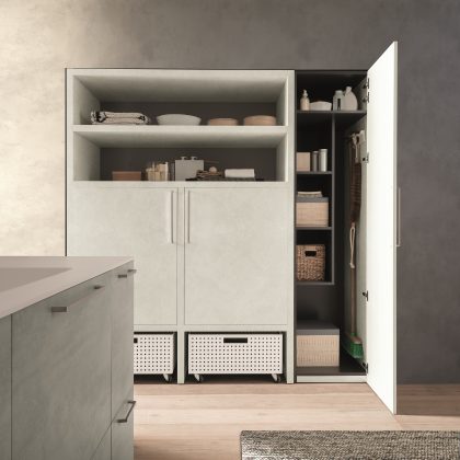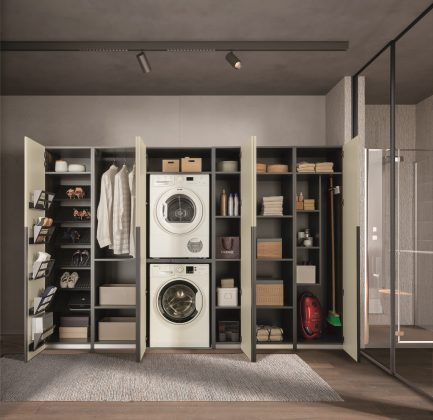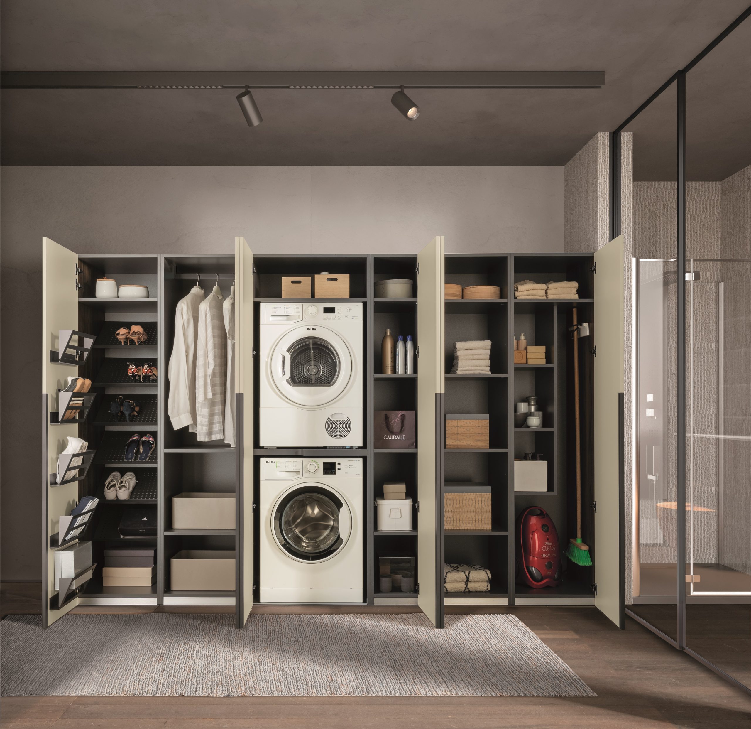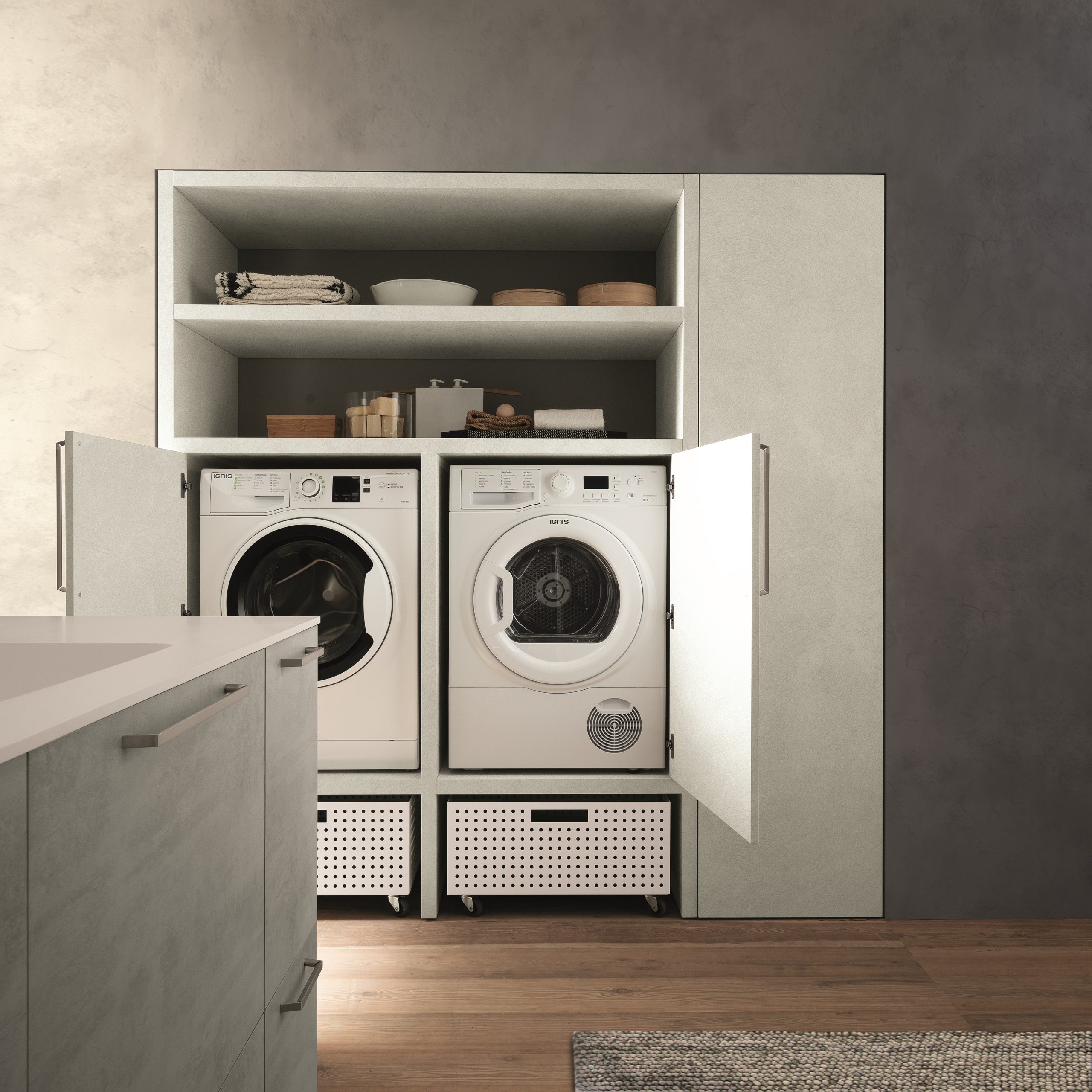 L'incredibile versatilità del progetto BoxLife di Scavolini - realizzato in collaborazione con lo Studio di Design Internazionale Rainlight e il suo direttore creativo Yorgo Lykouria - trasforma gli spazi e propone nuove funzioni grazie all’incredibile sistema di armadi attrezzati con ante a scomparsa, progettabili in soluzioni lineari, ad angolo o a golfo. Concepito sull’idea di nascondere per organizzare, il sistema di Scavolini integra varie funzioni: oltre alla cucina Boxi, prevede anche la zona lavanderia, qui presentata con sistema di apertura per armadio Switch e composta da asciugatrice e lavatrice a colonna ed un vano superiore. In questa soluzione le ante della armadiatura sono in Fenix Grigio Londra Scav861 con sistema di apertura pieghevole rientrante.