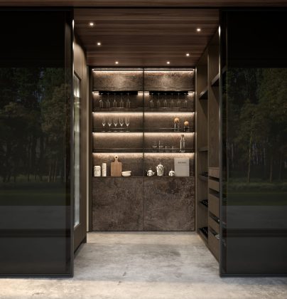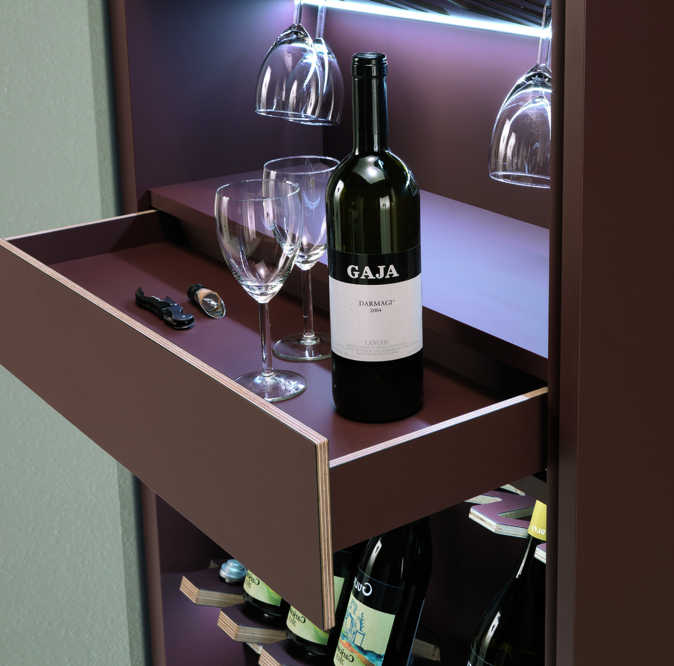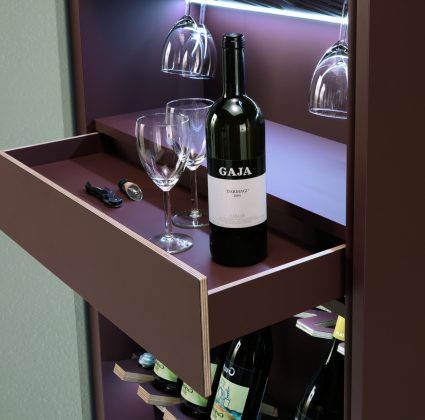 Scompare completamente integrandosi all’interno di una parete: è il modulo cantina scorrevole Bigfoot® Chianti di Protek, che rivela la sua funzione solo quando serve. Il modulo scorrevole terra-soffitto, dalla tecnologia silenziosa e fluida, è dotato di vani per bottiglie da esposizione, che non richiedono refrigerazione, di ripiano per calici e di cassetto con chiusura ammortizzata per accessori degustazione. Tra le opzioni aggiuntive, la possibilità di integrare luci, prese elettriche, serratura elettronica e motorizzazione gestibile con telecomando o App. Disponibilie in due