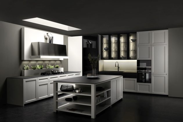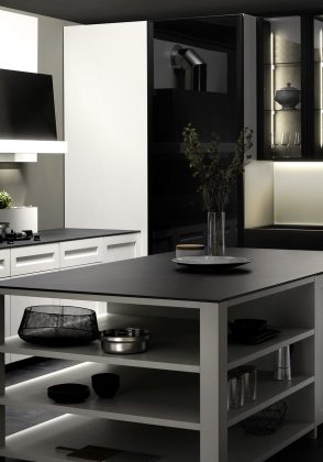 Per incontrare le esigenze i gusti del cliente, L’Ottocento prevede la realizzazione su misura di piccoli ambienti funzionali come cantine e lavanderie, che vengono create ad hoc e in continuità stilistica e progettuale con la cucina. Ne è un esempio l’ambiente cantina realizzato completamente in legno di rovere e collegato alla cucina (FOTO IN APERTURA); le due pareti opposte integrano scaffalature portabottiglie intervallate da un vano centrale a giorno con ripiani sagomati per l’esposizione dei vini e completo di luci integrate.
