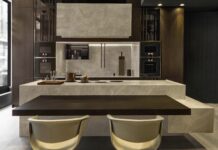 L'arredo cucina Marina 3.0, sempre di Febal Casa, si caratterizza per i nuovi telai in alluminio nero oppure champagne che realizzano librerie concepite come scaffalature. Design di forte presenza anche per le speciali maniglie e per i monoblocchi in laminato di forte spessore per cottura e lavaggio.