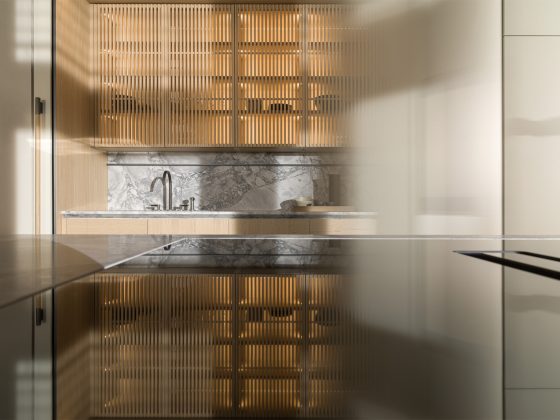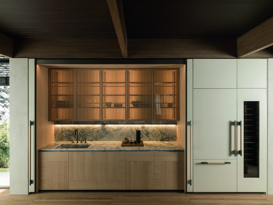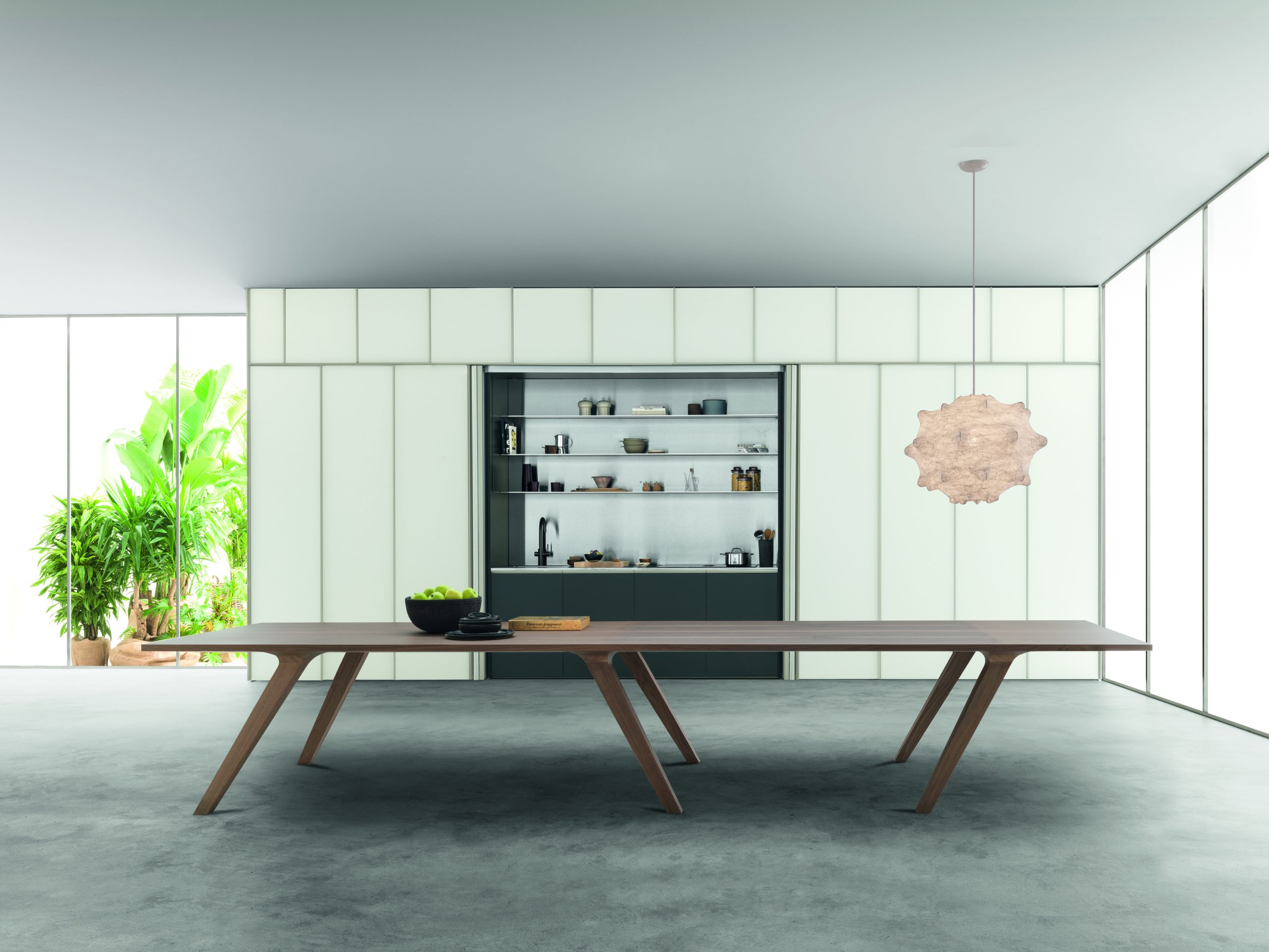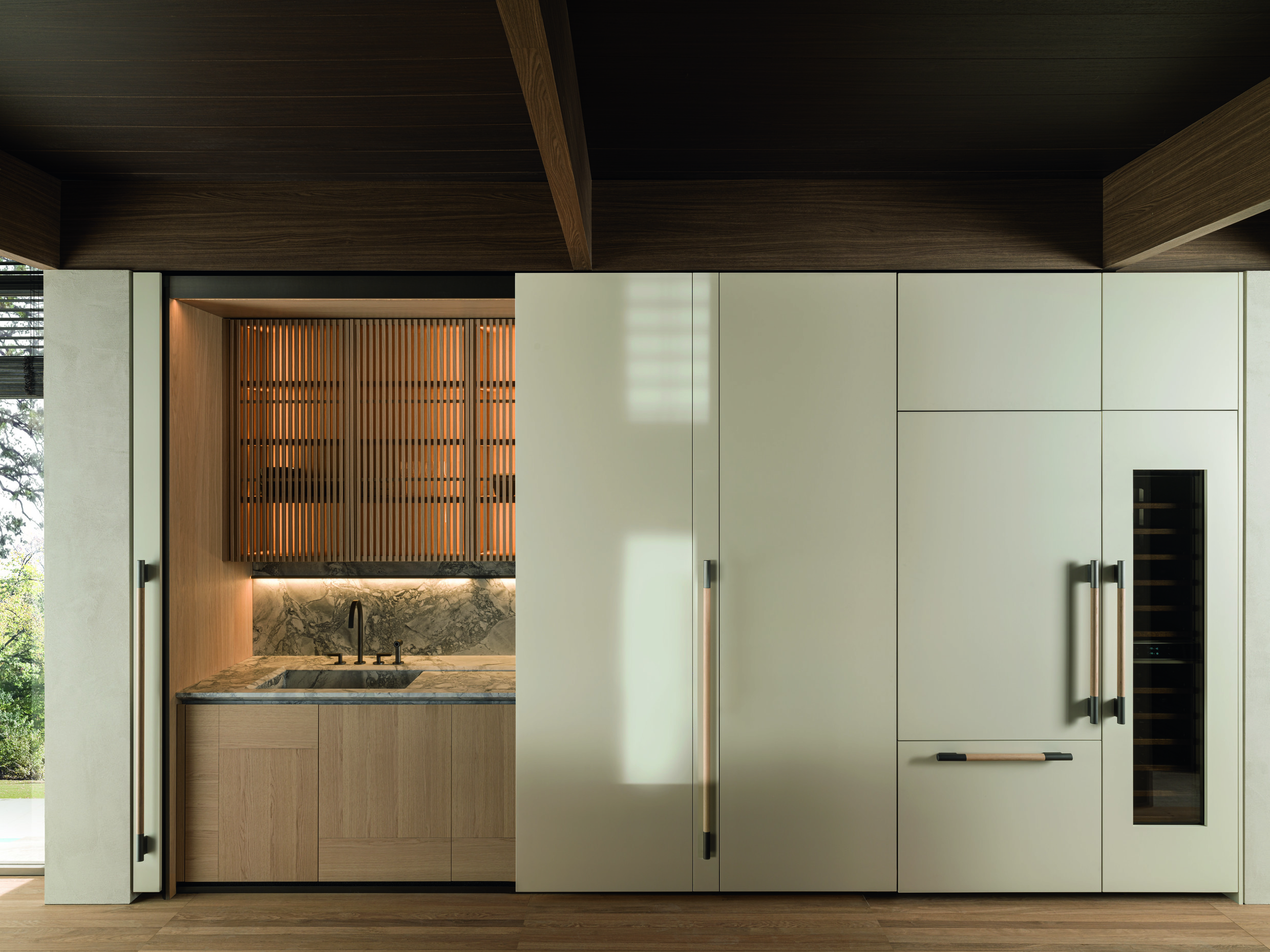 Una delle prime soluzioni a scomparsa lanciate e modello iconico disegnato da Dante Bonuccelli, Tivalì è prodotta, sempre da Molteni&C Dada Engeneered, nella nuova versione Tivalì 2.0, box-armadio che racchiude tutte le funzioni di una cucina. Le ante brevettate che si ripiegano, scorrono e scompaiono nei vani laterali sono valorizzate dalle maniglie Post in rovere massello Sunrise e, in questa proposta, sono finite in laccato opaco Perla. Materiali e lavorazioni pregiate connotano gli interni, dalle basi con ante in legno naturale ai pensili Strip con listelli in legno e pannello in vetro retrostante fino a top e schienale in marmo Super White.