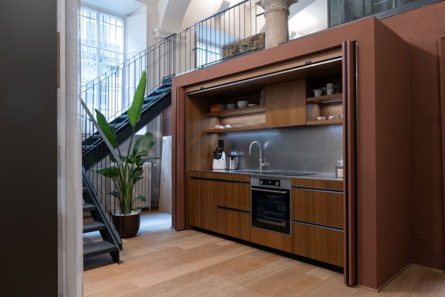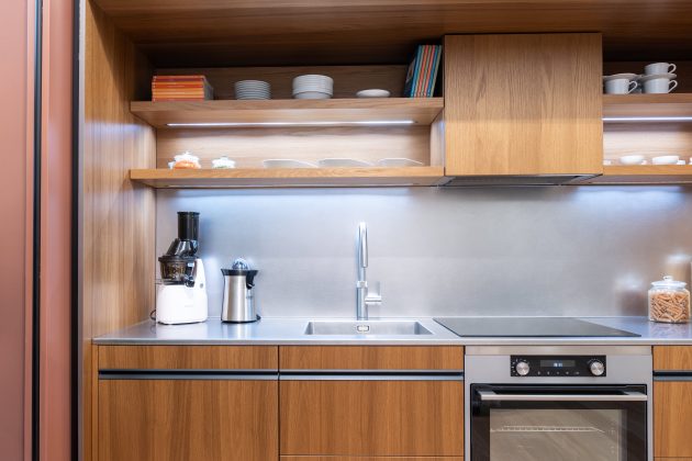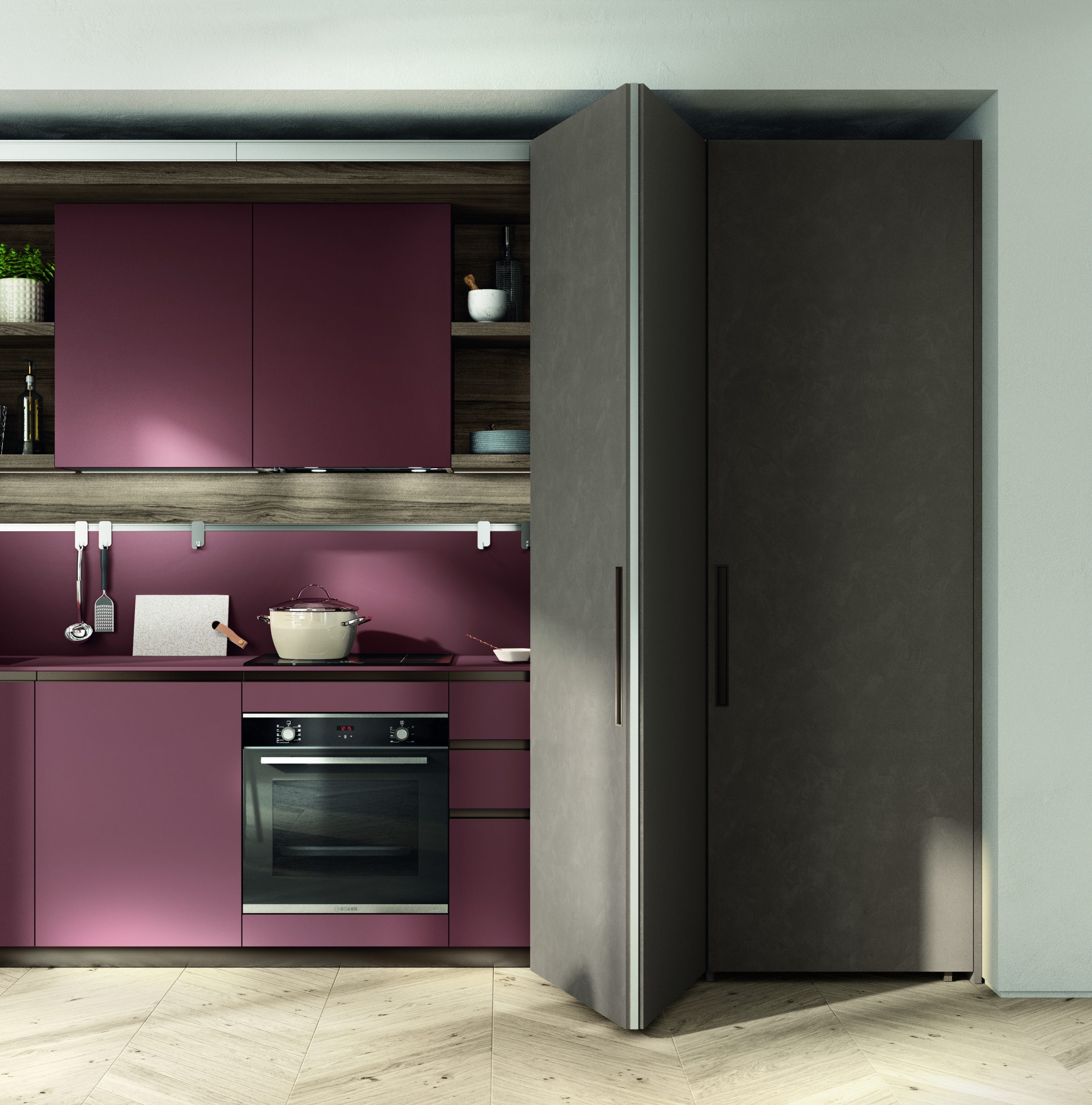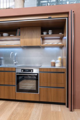Il modello cucina Sintesi di Effeti e le ampie ante con meccanismo Revego realizzano una cucina-armadio compatta e completa, un box attrezzato con basi, cappa e mensole in legno di Rovere Termizzato, forno sottopiano, schienale e top in acciaio Vintage che include una vasca saldata e integra il piano a induzione. Le ante esterne sono in una delicata nuance rosa, creata a campione; il meccanismo di apertura Revego consente di aprire ante singole o doppie e di farle “scomparire” all’interno della struttura per ottimizzare lo spazio.