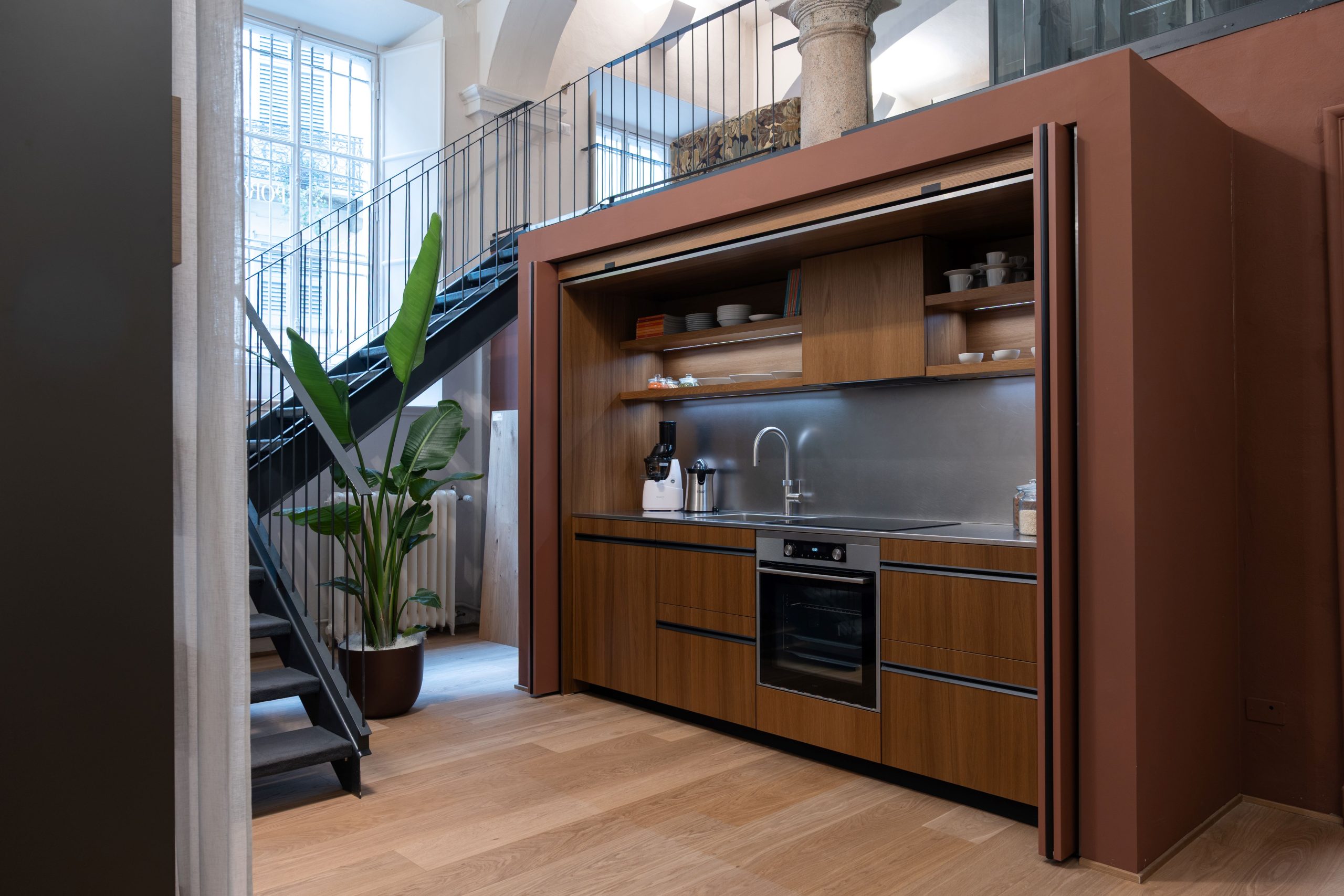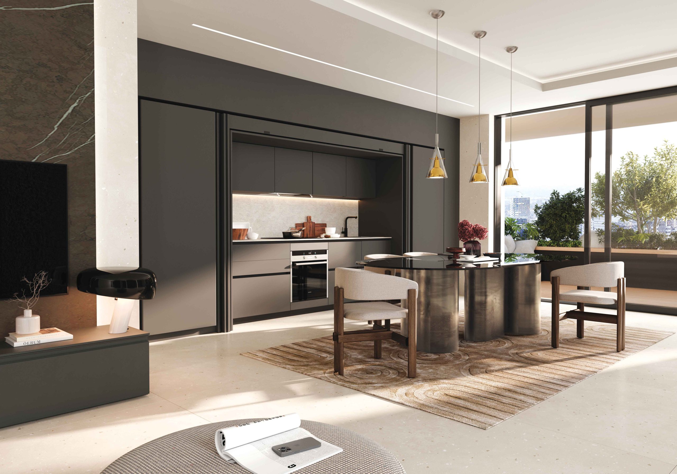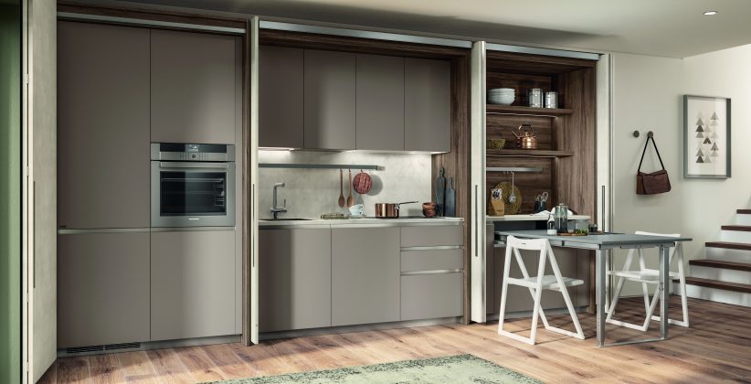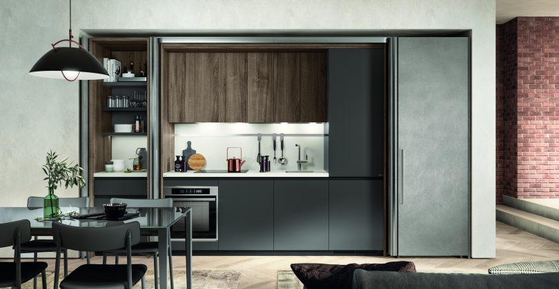 Sembrano vere "magic box" le grandi armadiature che si aprono diventando cucine complete e che al momento opportuno si chiudono e tutto scompare. Ecco così nuovi ambienti giorno mutevoli dal punto di vista estetico e funzionale, in continuo cambiamento, da vivere in modo diverso durante la giornata. Si gioca quindi con un nuovo concetto di casa sempre in trasformazione, in cui lo stile elegante si sposa alla ricerca della massima efficienza compattata in uno spazio minimo.