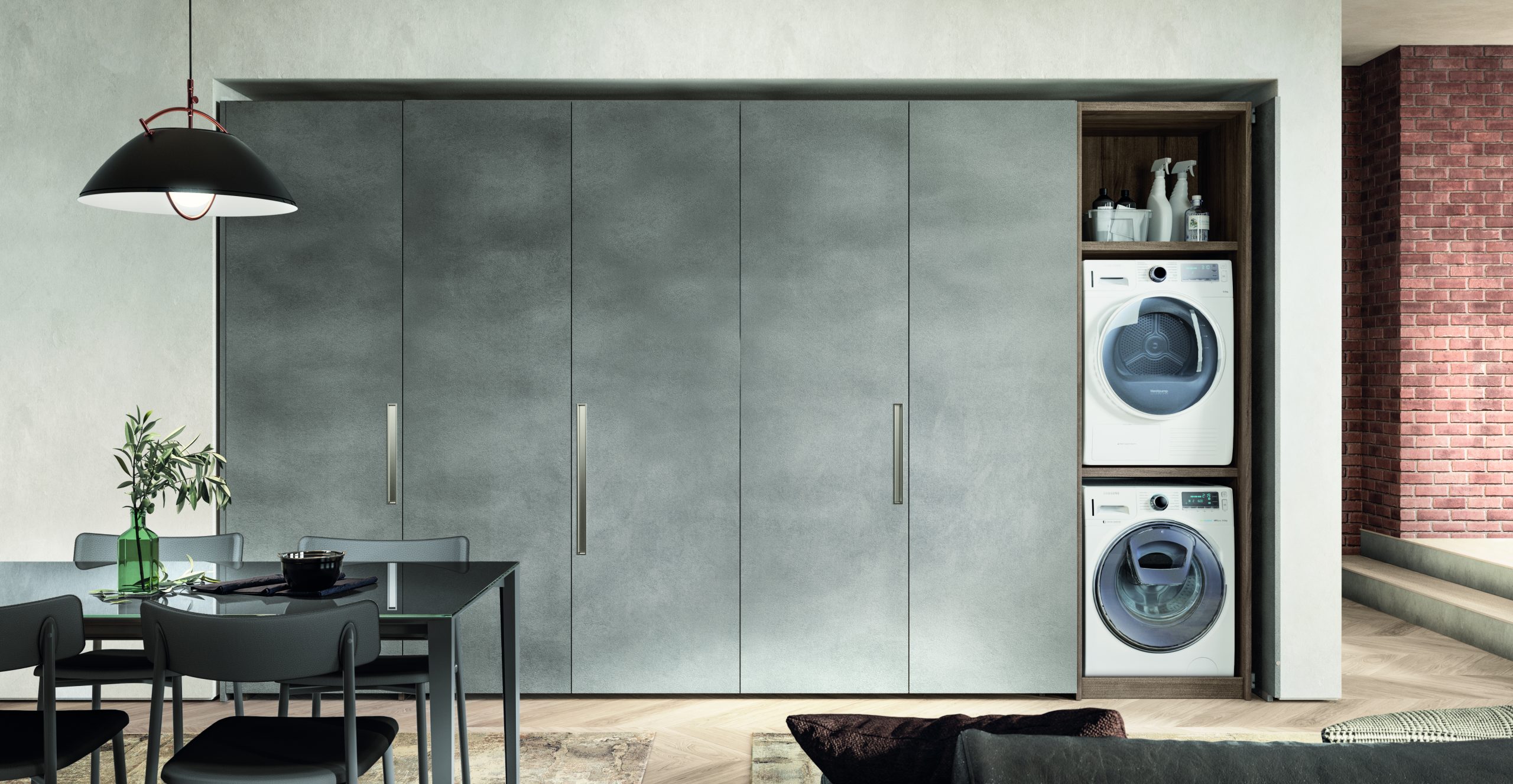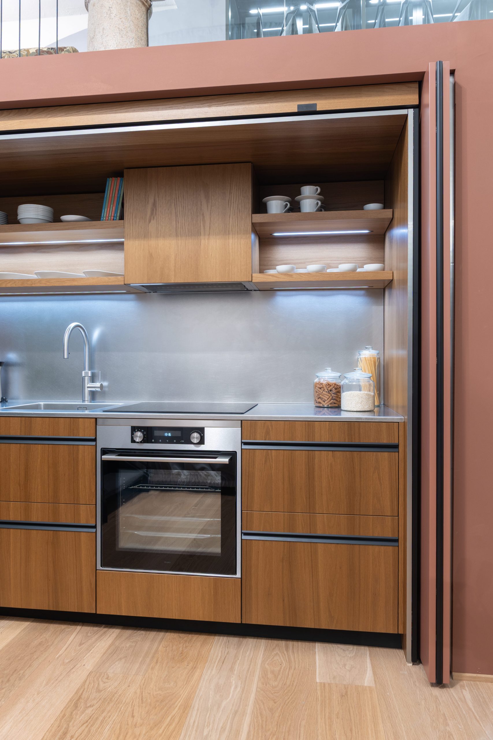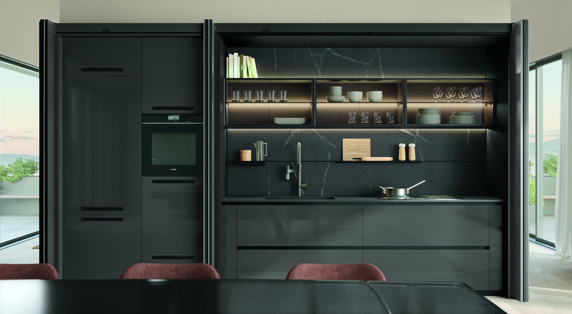 Sembrano vere "magic box" le grandi armadiature che si aprono diventando cucine complete e che al momento opportuno si chiudono e tutto scompare. Ecco così nuovi ambienti giorno mutevoli dal punto di vista estetico e funzionale, in continuo cambiamento, da vivere in modo diverso durante la giornata. Si gioca quindi con un nuovo concetto di casa sempre in trasformazione, in cui lo stile elegante si sposa alla ricerca della massima efficienza compattata in uno spazio minimo.