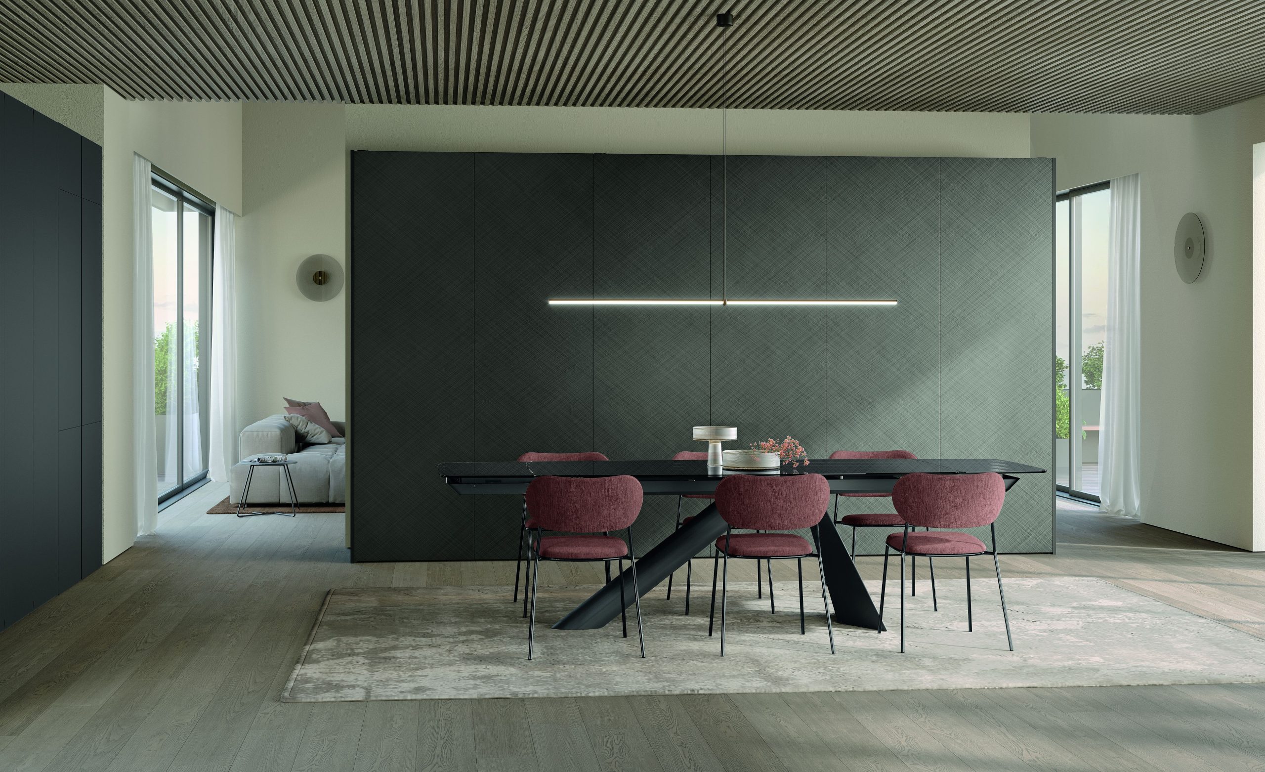 Skin versione Timeless (design C+S Architects) di Elmar è presentata come un’armadiatura neutra costituita da colonne alte 256 cm ed elementi superiori alti 60 cm. Dentro si cela una cucina completa: cottura e lavaggio sono inseriti nel modulo Folding centrale, un box apri-e-chiudi che offre una postazione di preparazione e cottura completo, con basi in laccato antracite, top in acciaio Scotch Brite e boiserie con schienale acciaio e sottilissime mensole finitura alluminio. Lateralmente, colonne dispensa ed elettrodomestici. Di fronte, il tavolo di @Home System.