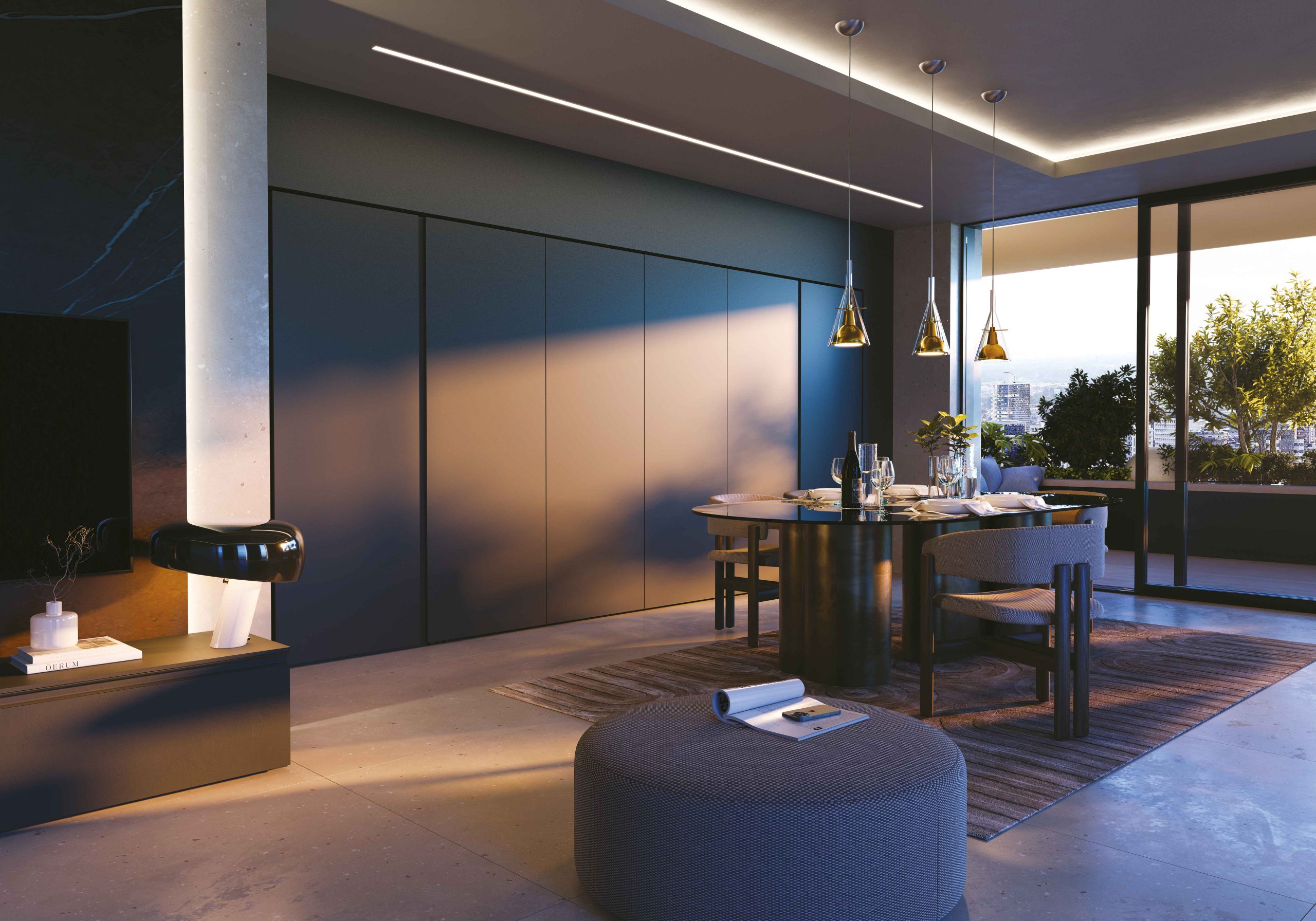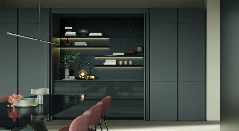 Pratica de La Casa Moderna, nella soluzione 2516, è la risposta a chi cerca una cucina che pone in primo piano la funzionalità: le colonne con ante scorrevoli a scomparsa nascondono/rivelano, un’area operativa organizzata e completa, con lavello, piano a induzione e luci integrate. Le ante esterne a scorrimento silenzioso prive di maniglie a vista rafforzano l’impatto di un designmsofisticato; aprendosi trasformano l’ambiente moltiplicando le funzioni. Quando chiuse, arredi area pranzo e living tornano essere protagonisti.