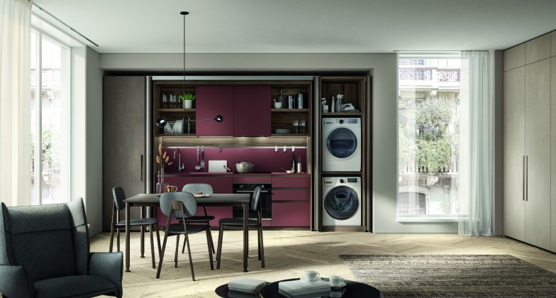 Pensato secondo l’idea di “nascondere per contenere”, il rivoluzionario sistema d’arredo globale BoxLife - progettato da Rainlight Studio - di Scavolini è studiato per includere la cucina e addirittura la lavanderia, la zona letto, il guardaroba e la zona studio. Un sistema capace di racchiudere le funzioni di un intero spazio abitativo, che insiste sul concetto di box facendolo proprio per rivoluzionando l'idea di habitat statico in spazio dinamico. Nelle foto, BoxLife di Scavolini rappresenta perfettamente il concetto di nascondere e organizzare al meglio lo spazio integrando la cucina Boxi ed anche una zona lavanderia, nella colonna laterale. Particolare risulta la soluzione con la cucina Boxi in Fenix® Rosso Jaipur, mentre le ante esterne sono in Argilla Granada e Delhi.