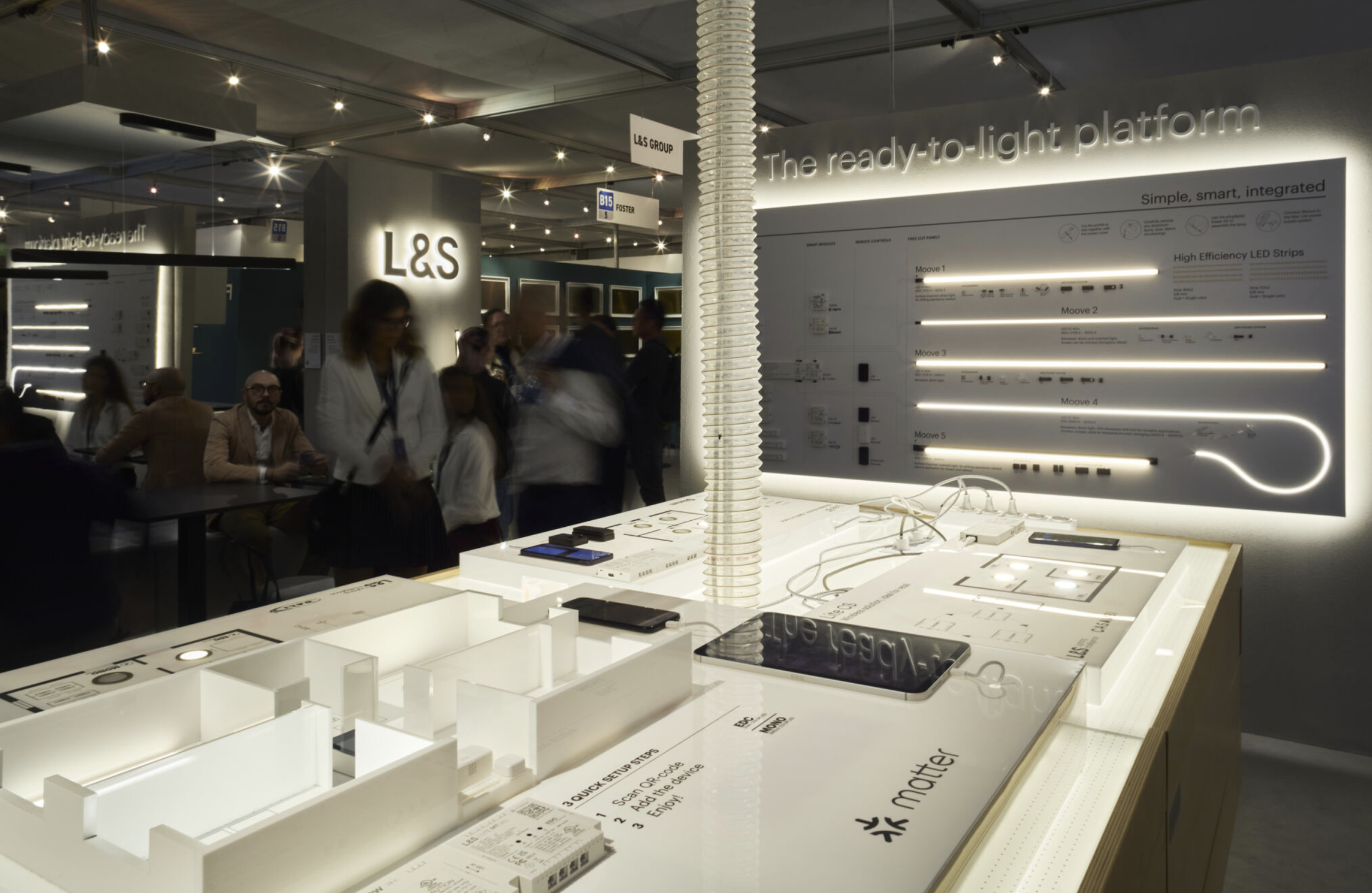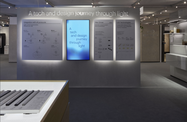 Al centro dello stand, il workdesk per toccare con mano Mec Lite, la piattaforma di alimentazione e controllo ready-to-light che integra tutti i principali protocolli per la smart home - DALI, Casambi, Matter, Zigbee e Bluetooth. Un sistema modulare di alimentatori e moduli, pensato per rendere il controllo della luce intuitivo e personalizzabile, anche da remoto e facilmente adattabile a diverse applicazioni e progetti.
