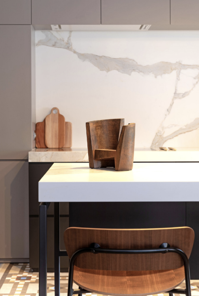 Calacatta Michelangelo (collezione I Naturali) di Laminam si distingue per le venature che virano dal grigio chiaro al color tortora. La finitura Soft Touch scelta per il top cucina e il backsplash del progetto in foto - Appartamento Paseo San Juan a Barcellona - è un’evoluzione della finitura lucidata e si traduce in una superficie levigata priva di riflessi, morbida al tatto. Le grandi lastre utilizzate contribuiscono a definire un’estetica in equilibrio tra gli elementi preesistenti e un design contemporaneo curato nei dettagli.