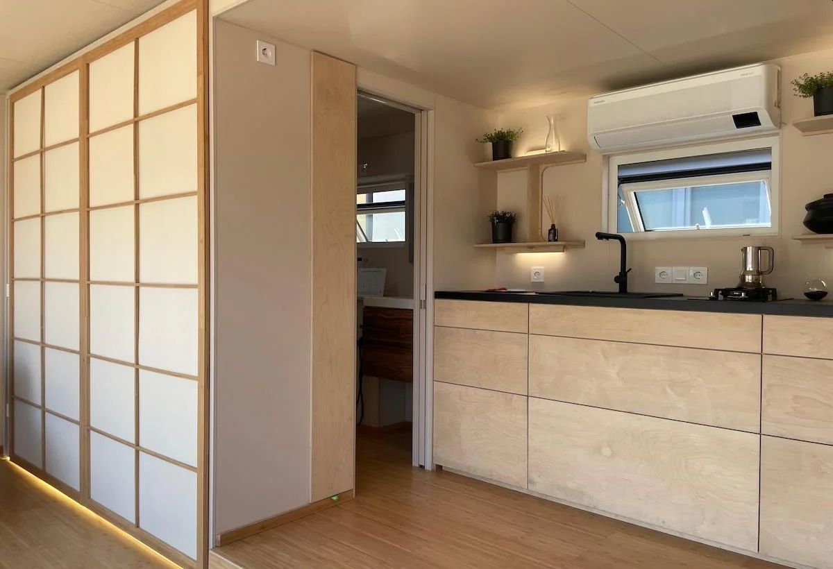 Tra i vari progetti sostenibili realizzati, "ve ne racconto uno che li raccoglie tutti - continua Bazzicalupo - dedicato all’idea di ‘libertà sostenibile’: è LT_02, modulo abitativo ultraleggero e mobile con comfort da casa stabile, frutto di una ricerca che intreccia libertà, tecnologia soft e design essenziale, trasportabile su carrello standard ed espandibile fino a 25 mq. Nella versione più equipaggiata, è autosufficiente (off-grid), a impatto ambientale quasi zero, e invita a una vita essenziale senza rinunciare a comfort e qualità". Nella tiny house, la cucina è finita con materiali sostenibili: il top in è in Paperstone e le ante con struttura interna in alluminio sono rivestite in multistrato di betulla. Armadiature e scorrevoli giapponesi e in bambù e cotone grezzo creano all'occorrenza ambiti separati; i pavimenti sono in bambù.