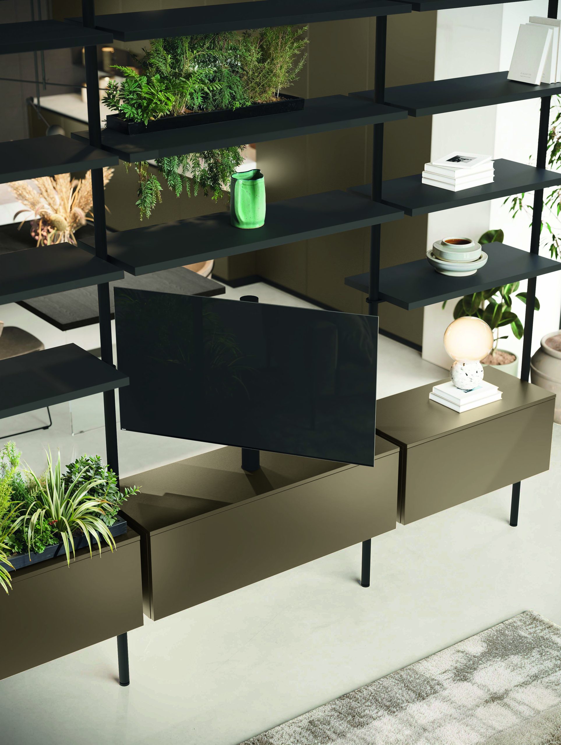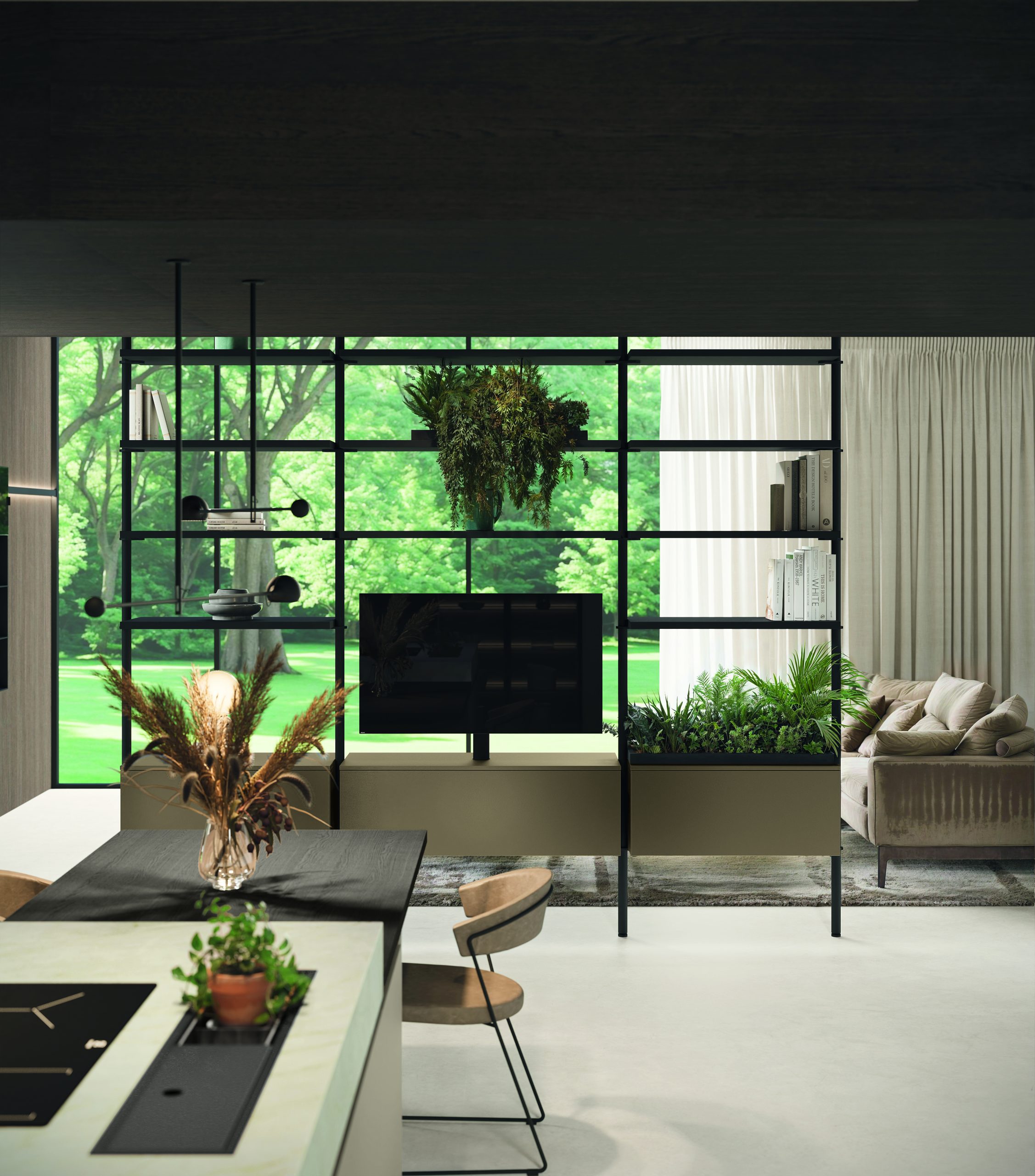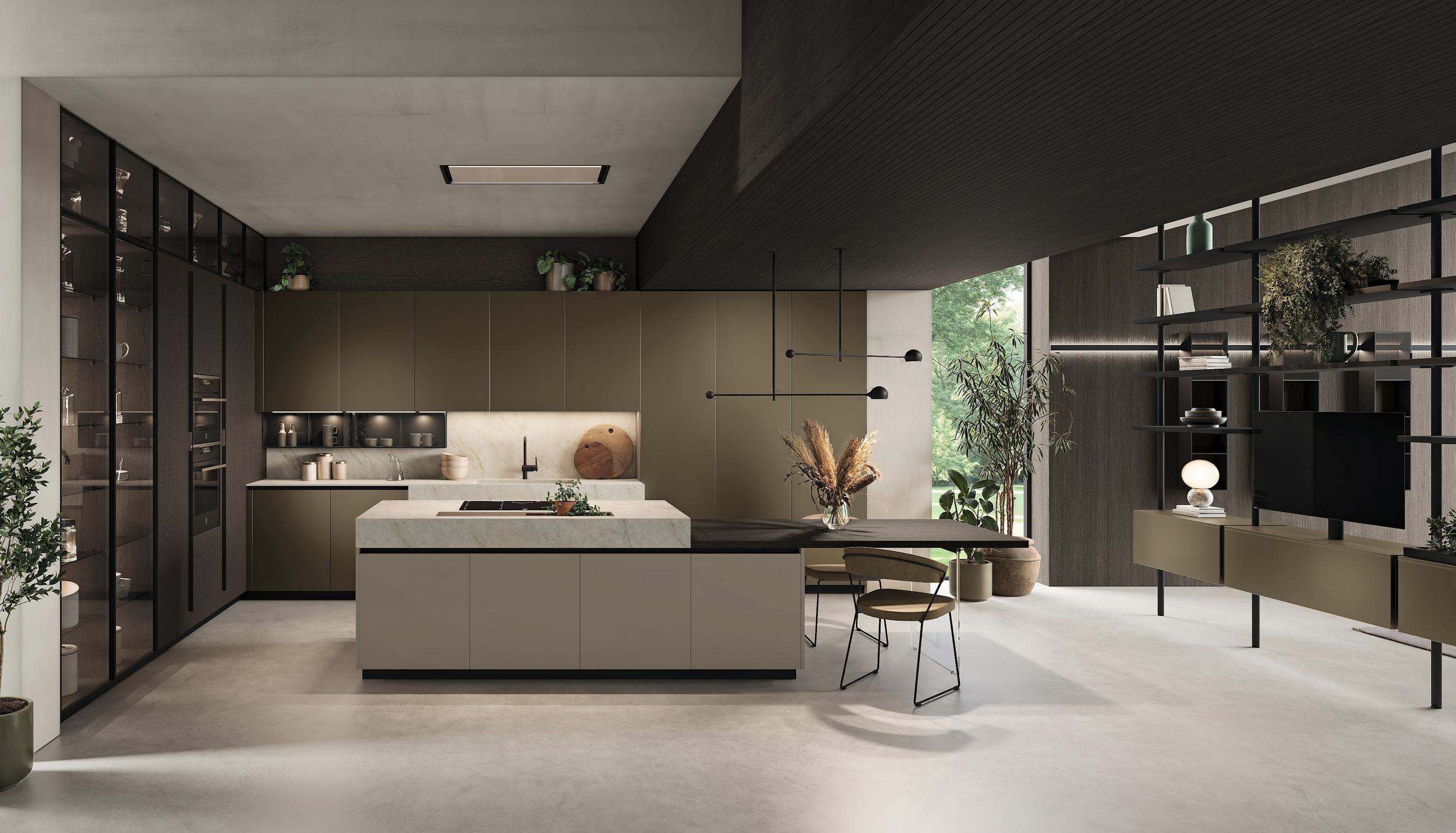 Protagonista della composizione, l’isola Metropolis con ante in Pet Ginseng opaco incarna la purezza del volume monolitico. Le superfici continue e vellutate catturano la luce in modo discreto, amplificando l’impressione di spaziosità. L’isola non è solo centro operativo, ma anche luogo di relazione e convivialità, ponte ideale tra cucina e living. A completare la scena, la libreria divisoria palo Cyclos con mobile sospeso porta TV introduce una cesura misurata, un filtro visivo che separa senza dividere. La sua struttura leggera e modulare definisce le aree funzionali mantenendo la percezione di un unico spazio fluido e coerente. Metropolis di Stosa è il simbolo di un nuovo modo di abitare, dove il confine tra preparare, vivere e condividere si fa sempre più sottile.