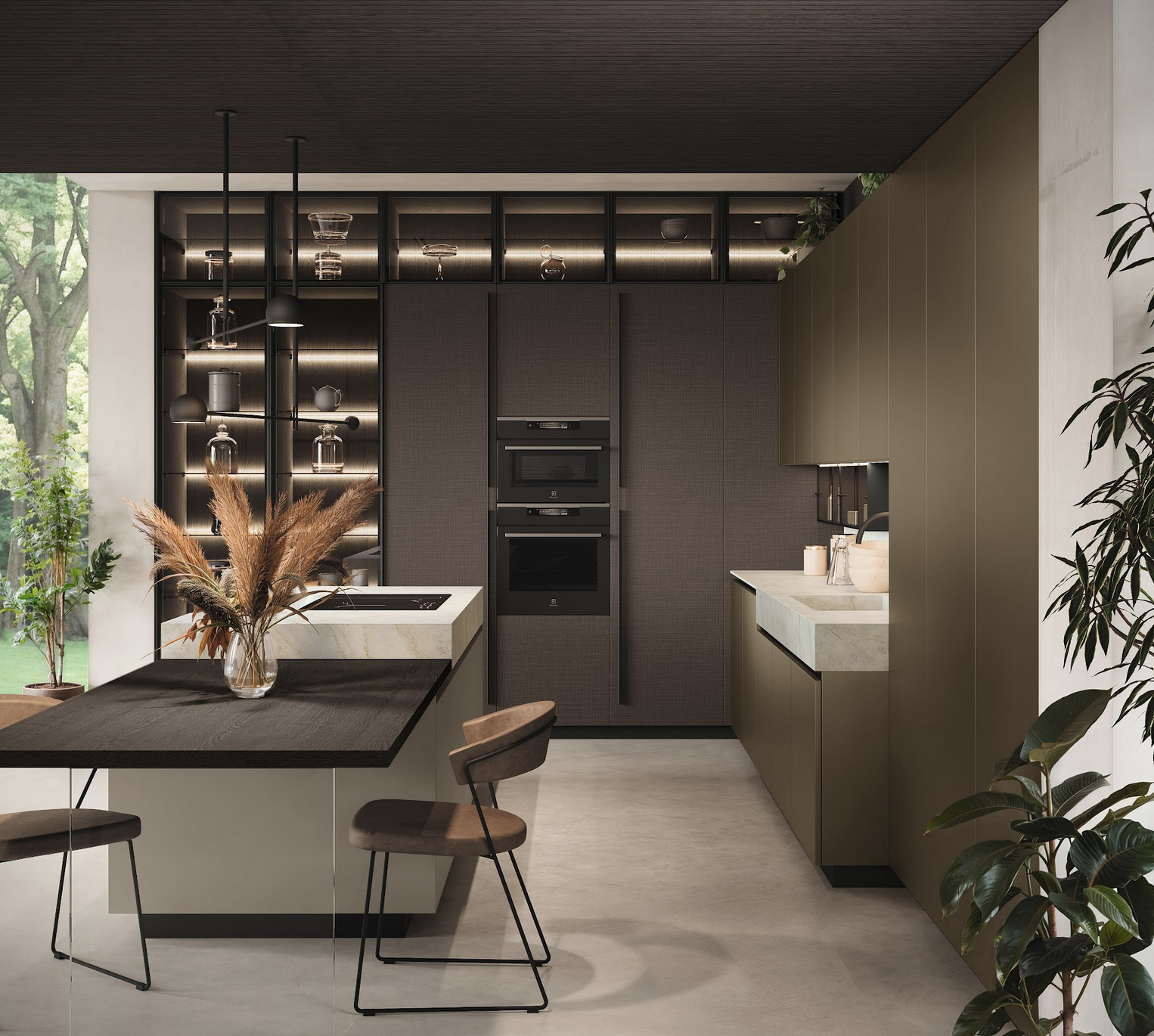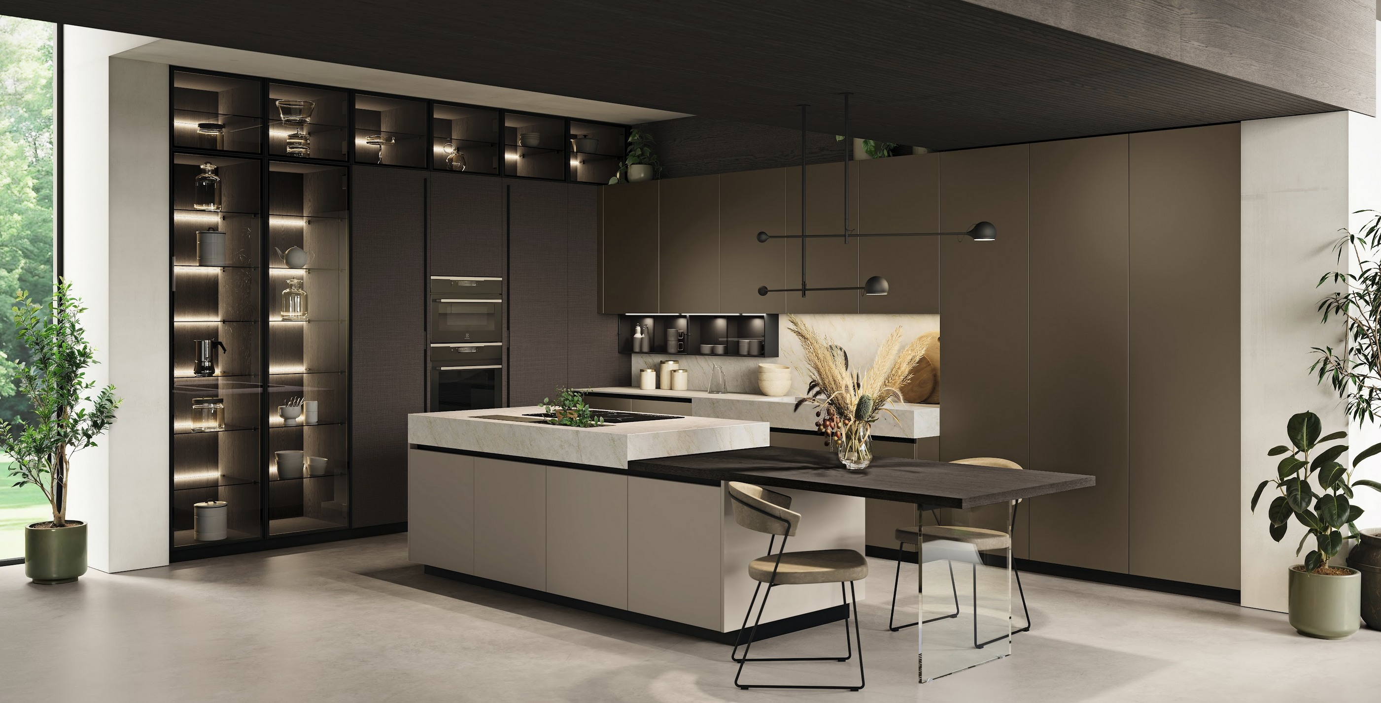 Stosa propone un sistema a giorno che prolunga la cucina verso il living interpretando con raffinatezza il concetto di fluidità domestica e trasforma lo spazio in un unico, coerente paesaggio d’interni. Le colonne Metropolis rappresentano un esempio di eleganza integrata alla funzionalità: da un lato, le vetrine con ripiani retroilluminati e telaio Slim nero e vetro trasparente bronzo; dall’altro, le ante in finitura Rovere Moro dialogano con le basi in Pet finitura Copper Brown, costruendo un ritmo architettonico che alterna pieni e vuoti, opaco e lucente, calore e razionalità.