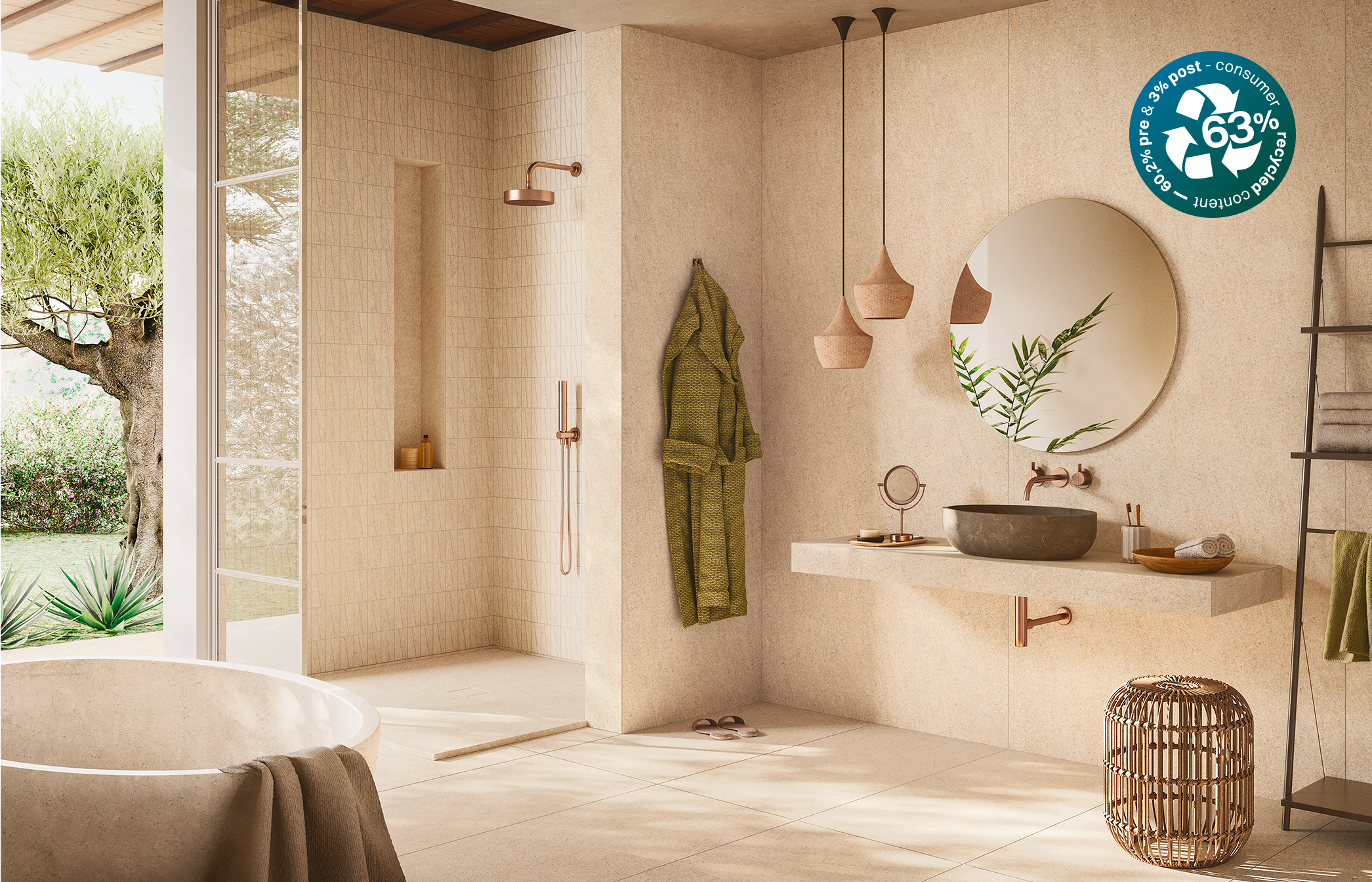 The ReSource family includes three collections: ReConcrete, ReStone, and ReGea. 63.2% of each ReSource product is composed of pre- and post-consumer recycled materials, distributed as follows: 39.8% natural raw materials, 48.6% materials reintroduced into the production process, 11.6% regenerated fired fractions, and an additional 3% post-consumer content from the glass of decommissioned solar panels.