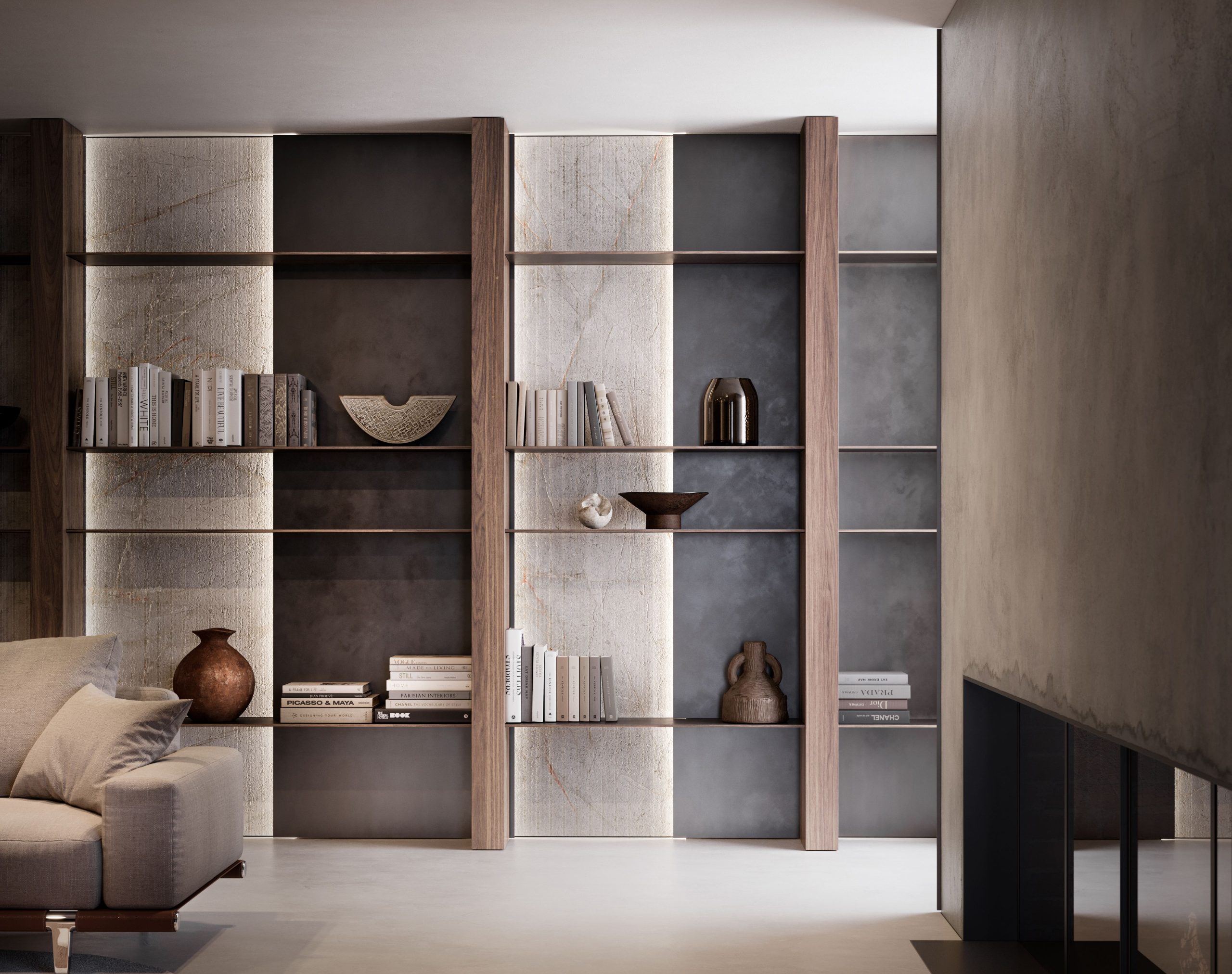 Nella composizione sono inserite le colonne terra-cielo Blade Edge in metallo Antracite Dust, la cui apparente continuità si interrompe per accogliere nicchie verticali retroilluminate in marmo Appennino e aggiungono profondità e dinamismo alla composizione.ed estetica si fondono in un equilibrio perfetto, garantendo un'esperienza abitativa di alta qualità, in linea con l'idea di lifestyle che da sempre contraddistingue Modulnova.