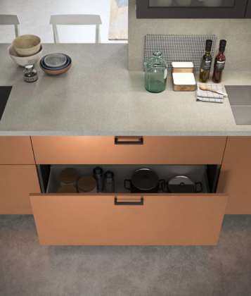 Sistema per la cucina e il living progettato dall'architetto Ulisse Narcisi, R1 Evoluzione offre una vasta scelta di materiali speciali. Tra questi, la finitura in Metallo Liquido Rame qui adottata per l'isola con piano di lavoro in grès porcellanato che supporta un tavolo snack realizzato in E-wood Quercia sagomato ad L. A parete, basi in Rovere Moka e pensili in laccato Corda Opaco.