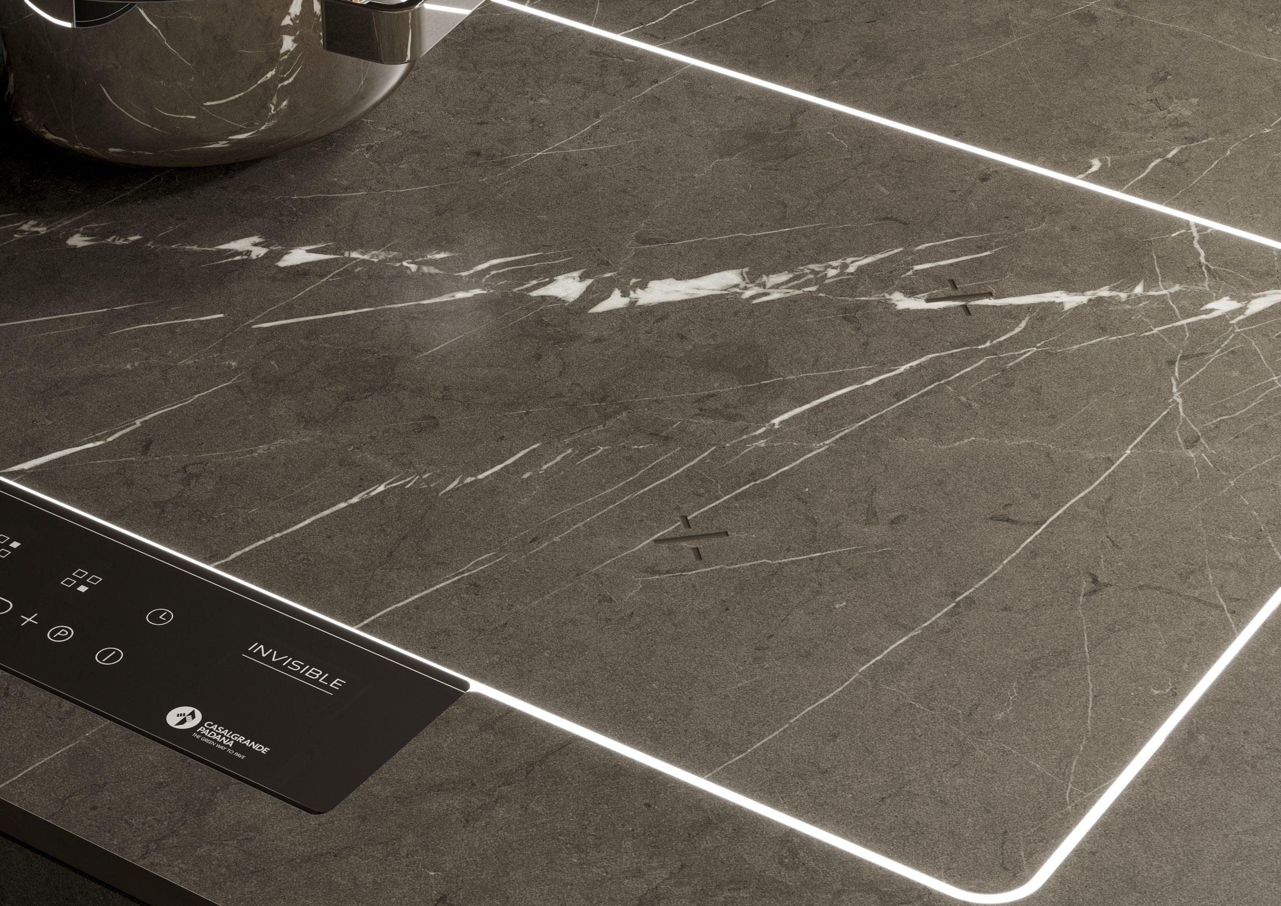 Invisible è un piano di cottura ad induzione dal design raffinato, che viene integrato sotto al top in gres e che si pregia di luce perimetrale. E' dotato di quattro zone di cottura con funzione bridge per le pentole lunghe e di telecomando touch integrato, per una nuova era in cucina.