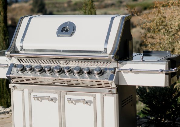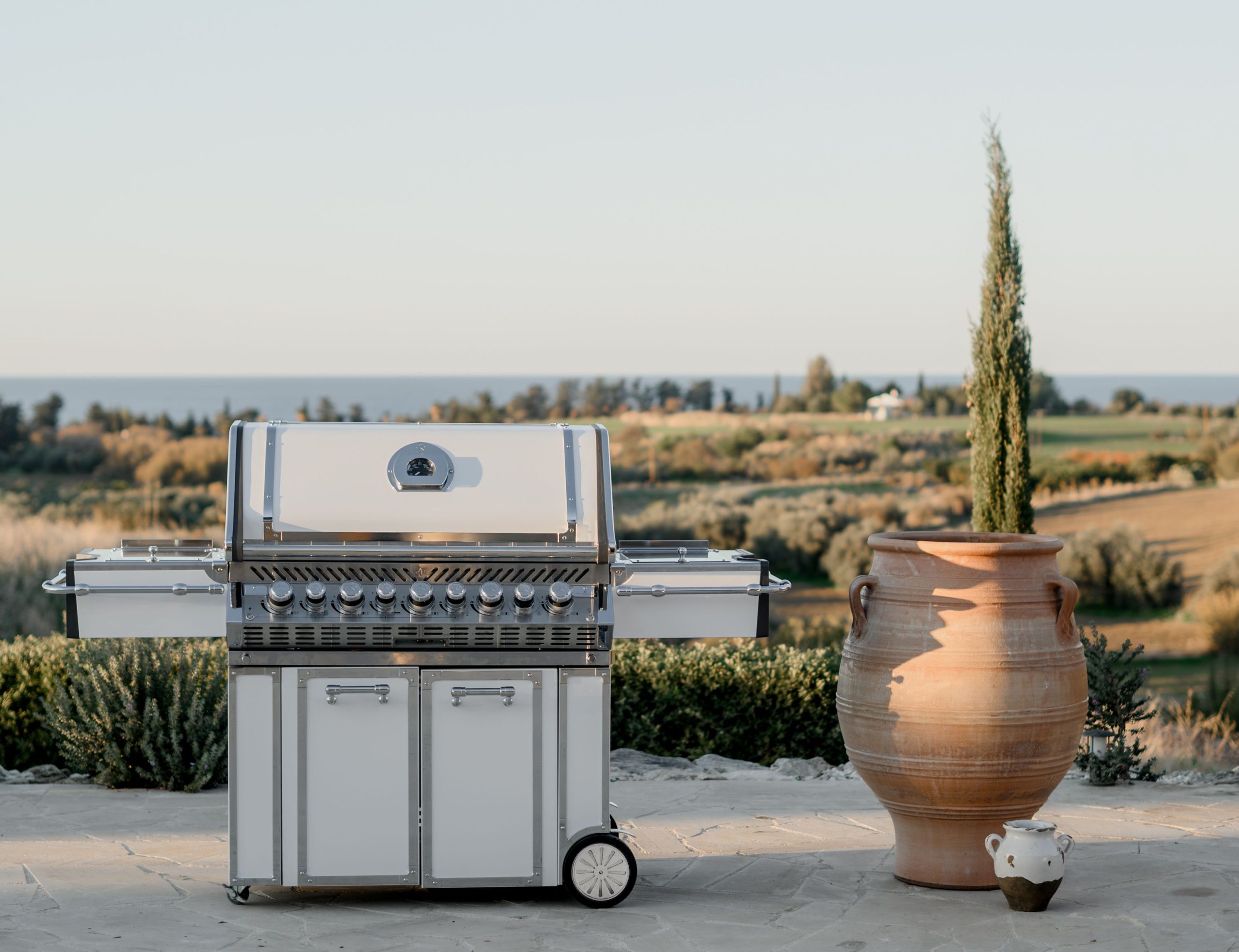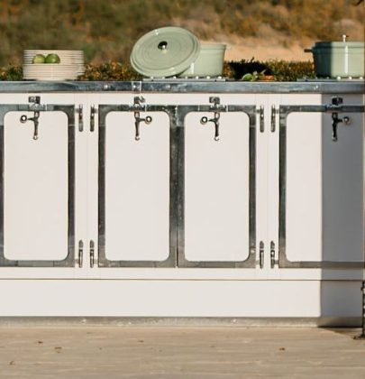 Nella parte inferiore, l’isola ospita un frigorifero a due cassetti, una cantinetta per i vini e generosi vani contenitivi. Alle due estremità, piani a sbalzo permettono di accomodarsi su sgabelli, trasformando la cucina in un arredo anche anche per i momenti di convivialità e relax all’aria aperta. Accanto all’isola, il barbecue OG Professional 100, in versione freestanding.