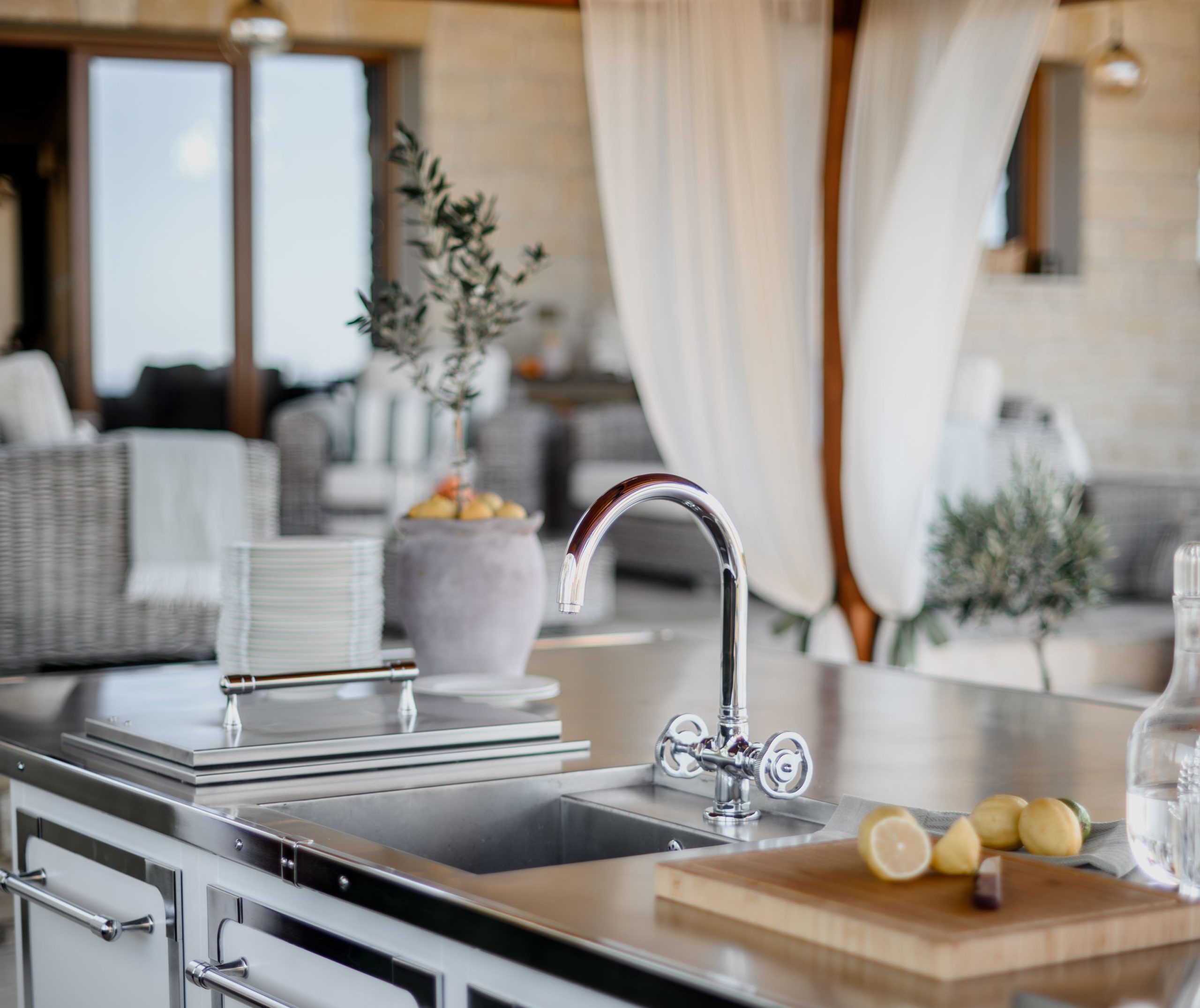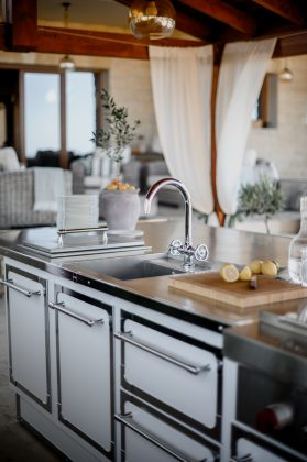 Realizzata nella finitura bianco opaco Lily White, la cucina creata custom da Officine Gullo per questa casa a Cipro si sviluppata come un'isola di 5 metri; è completamente realizzata in acciaio AISI 316 ed è quindi ideale per l’utilizzo in esterno grazie alla sua eccezionale resistenza alla corrosione e agli agenti atmosferici.