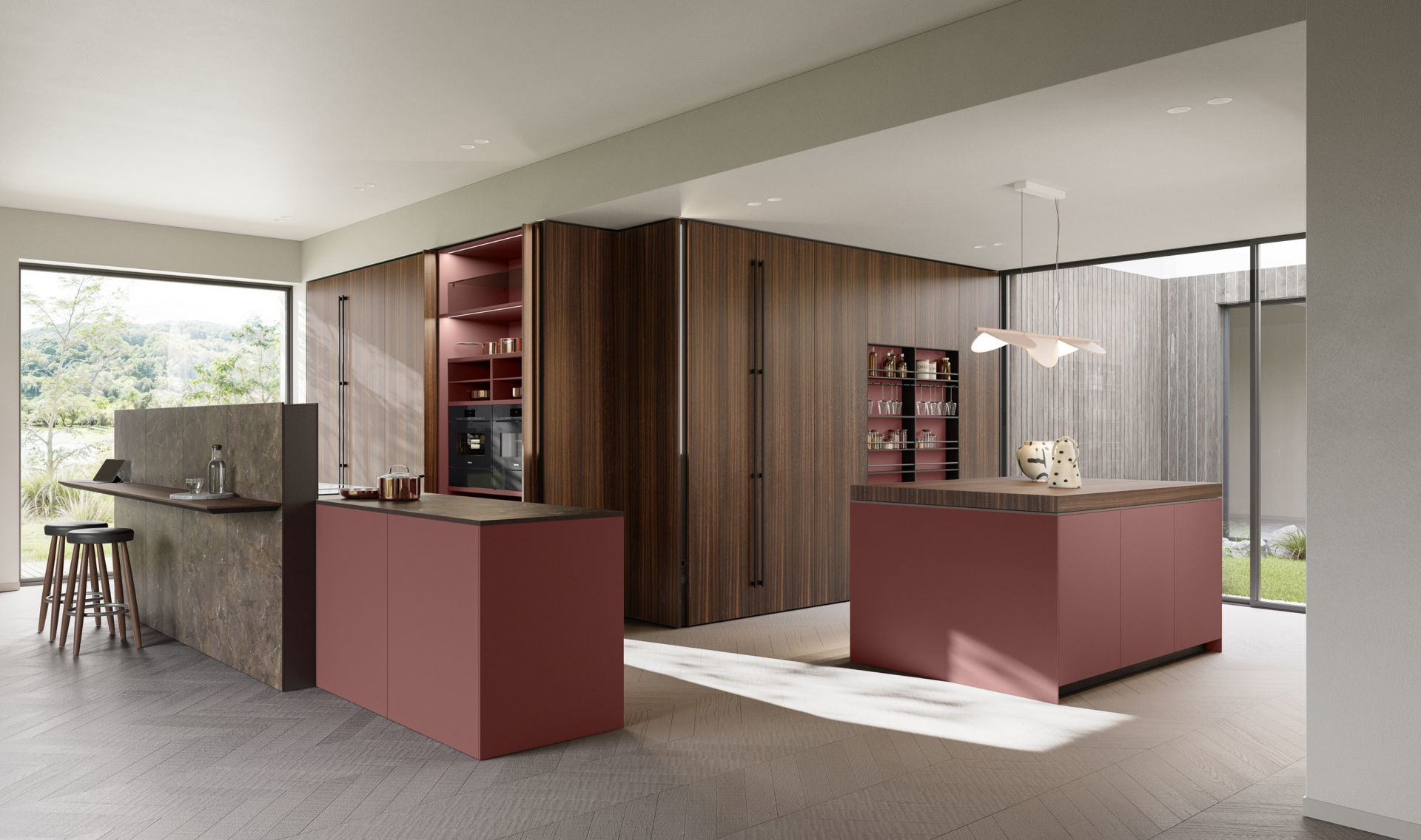 Superficie ottenuta con nanotecnolgie e dal tocco soft, il Fenix nel color Rosso Japur riveste i frontali delle due isole appartenenti ad uno dei nuovi progetti cucina di Copatlife. La grande isola principale si completa con lo speciale setto divisorio Separé e con il top finititi in MDi Inalco Umbra Marron, impiegato anche per il top della seconda isola. Quest'ultima è dotata di piano scorrevole Snack Sliding Side (spesso 6 cm), in legno di Eucalipto termocotto. A contrasto con le due isole, le pareti di colonne in legno di Eucalipto termocotto, con interni attrezzati che riprendono la finitura rossa.