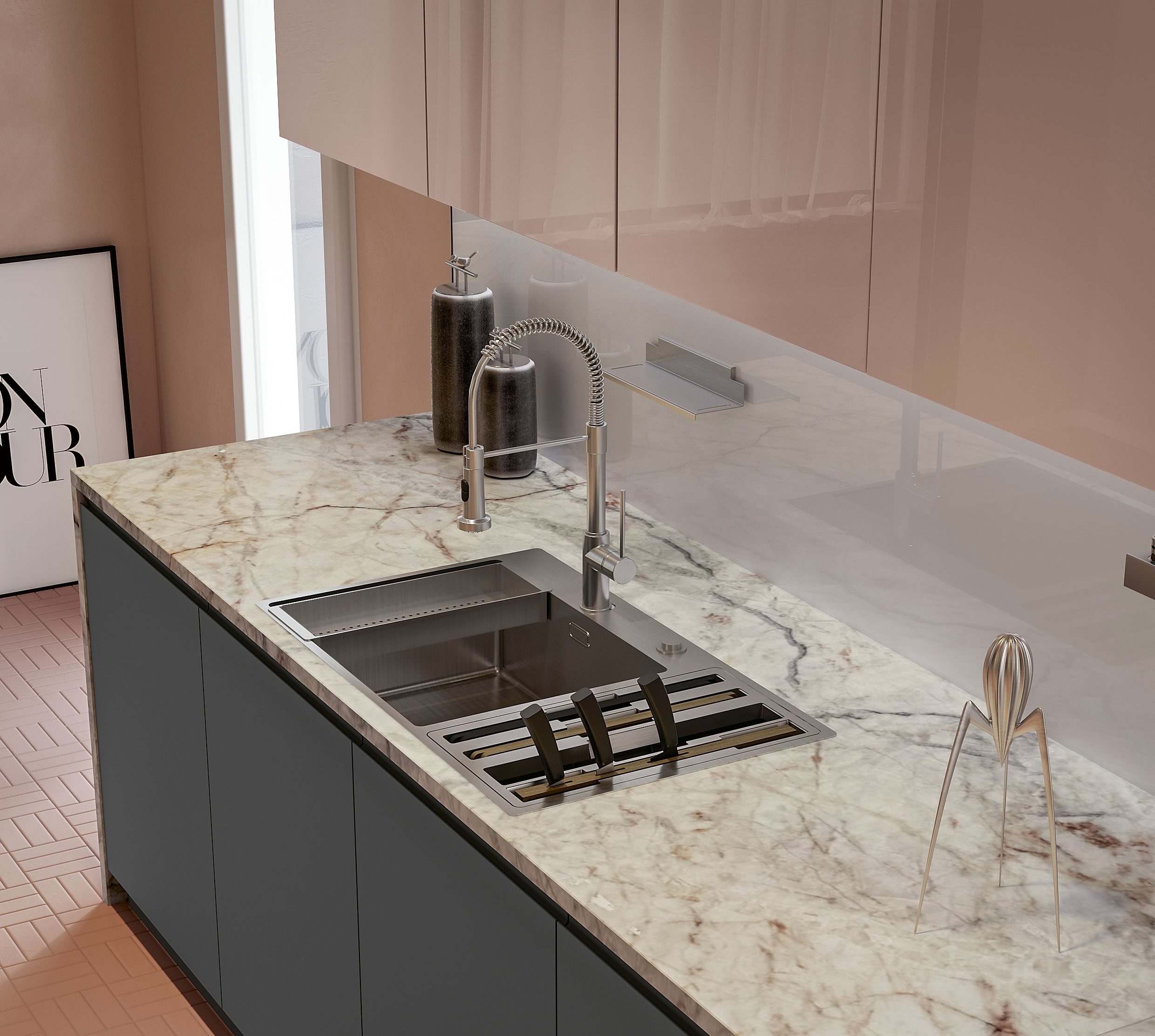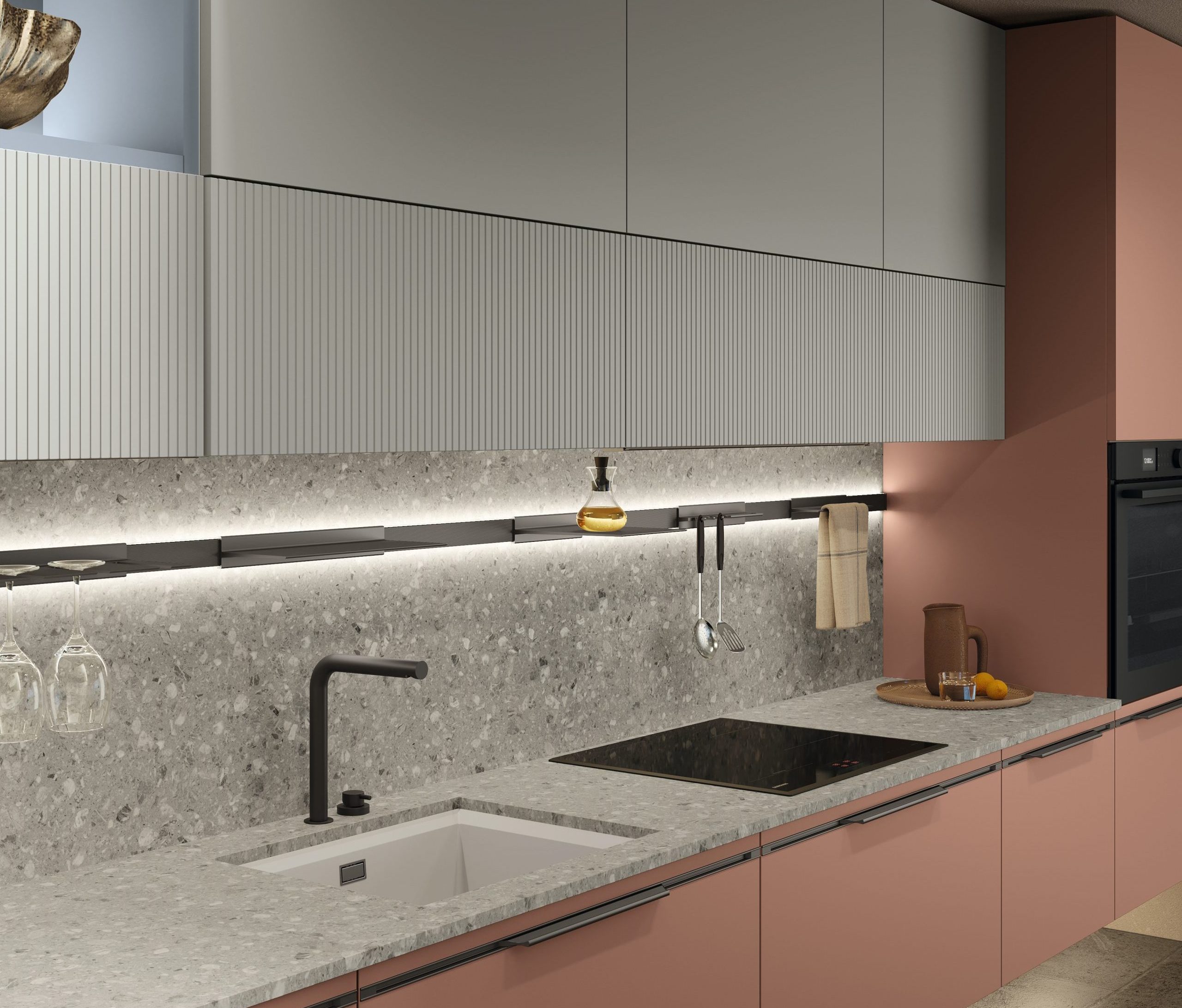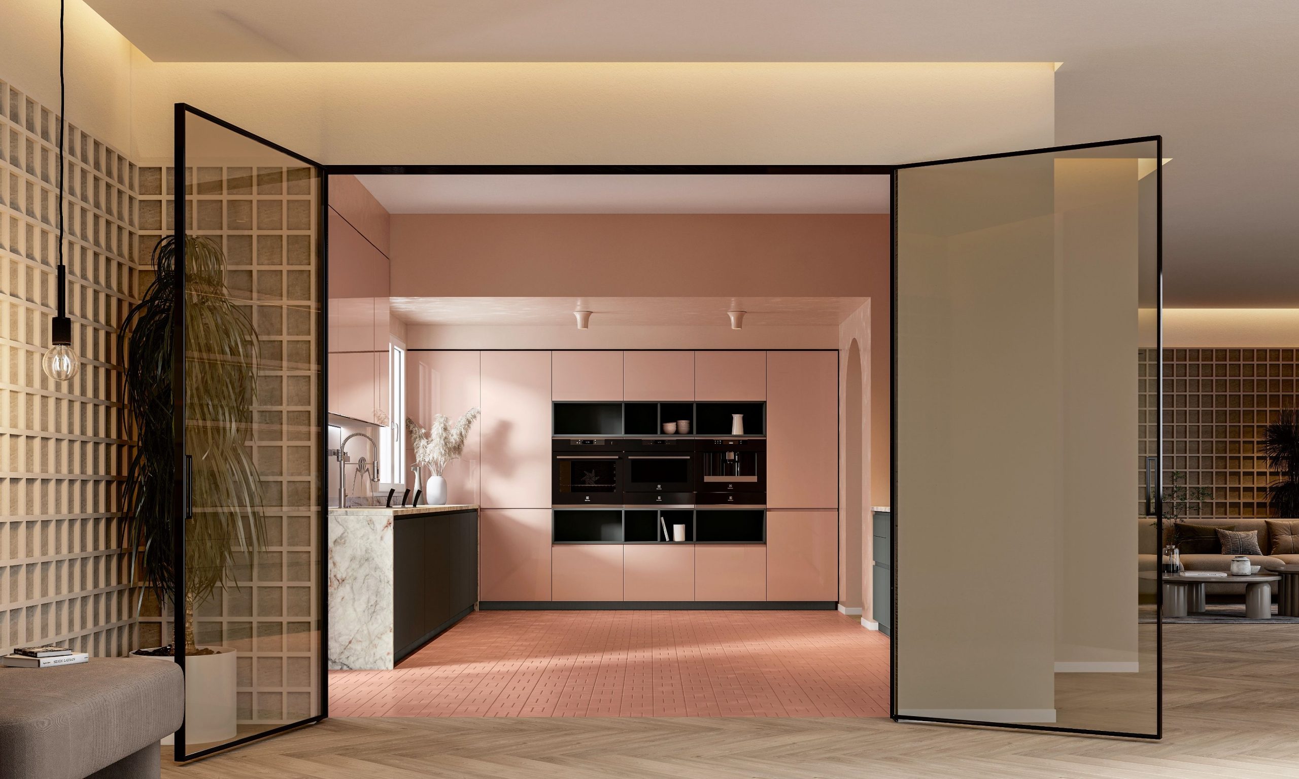 È la tenue gradazione rosa cipria a definire lo spazio arredato da Arrex Le Cucine con il sistema di ante Gea, una delle colorazioni della serie Color Selection Arrex, ispirata alla natura. Colonne e pensili rosa sono en pendant con top in marmo Fior di Pesco (spes. 3 cm) e il pavimento, mentre basi e vani a giorno al centro delle colonne sono in PET Ardesia. Particolare lo schienale luminoso Magneto Glass in vetro lucido bianco accessoriato e retroilluminato con Led. L’anta Gea è proposta, oltre che in Pet, anche in tonalità laccate raccolte in quattro mood.