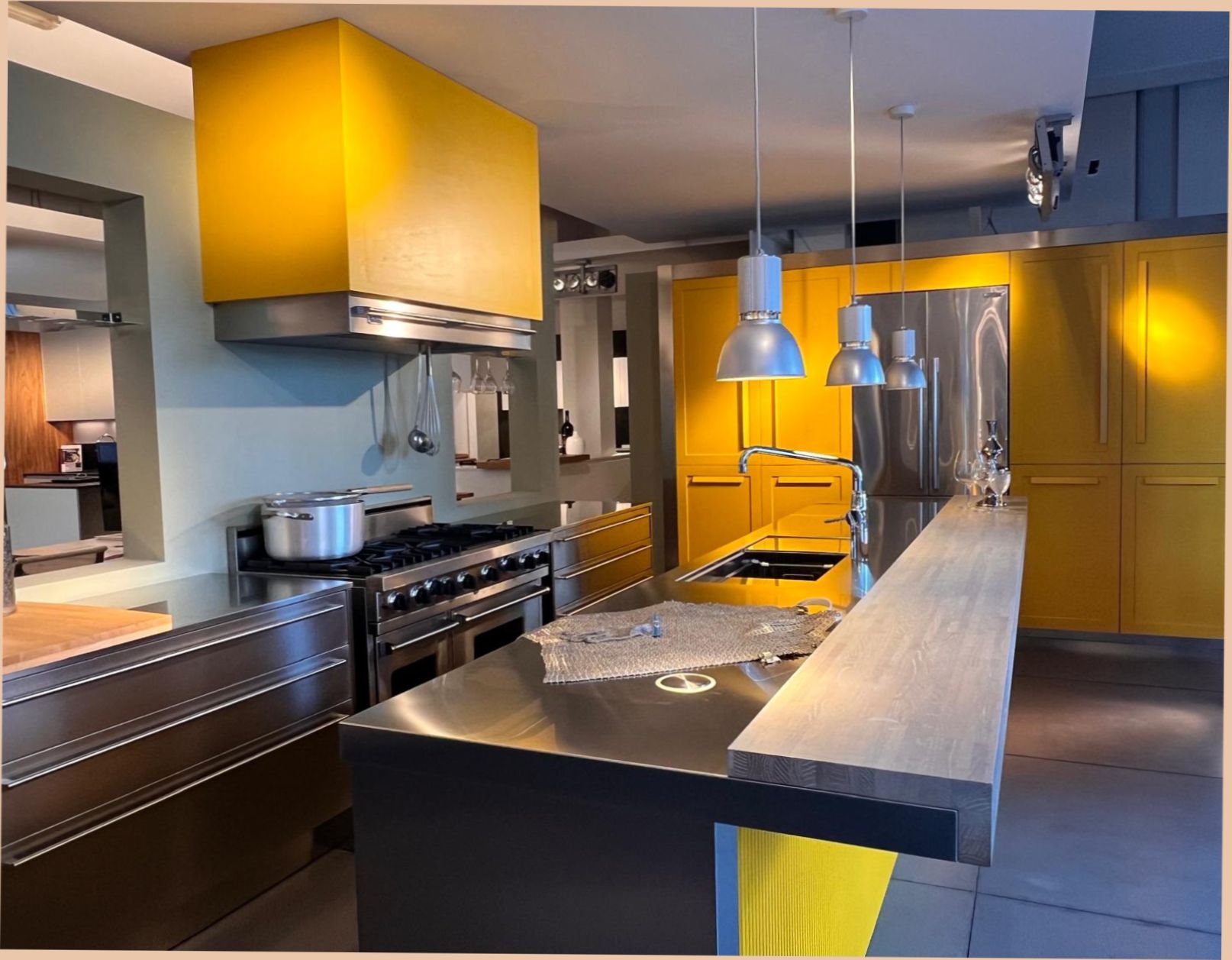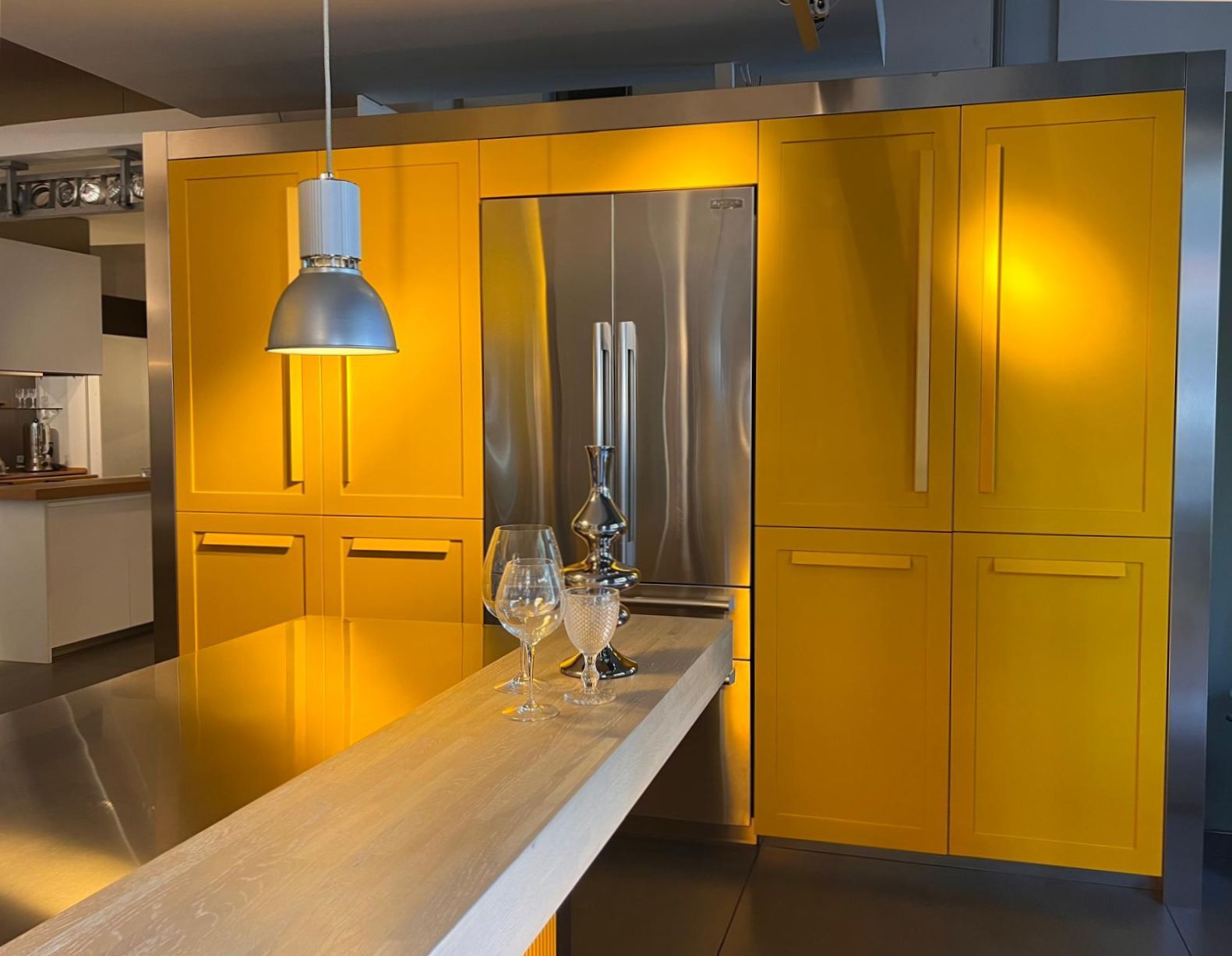 In questa soluzione il modello Impronta di Effeti si accende di un colore pop come il giallo di una gradazione intensa, che illumina l’ambiente conferendo allo spazio energia e carattere. Le ante gialle a cornice vestono con eleganza le colonne a tutta altezza e si accordano ai frontali della cappa e del bancone in un dialogo cromatico dinamico. Al giallo si oppone l’acciaio inox delle basi a parete e dell’isola, degli elettrodomestici e dei piani di lavoro, mentre il piano snack in legno spazzolato introduce una nota tattile e materica.