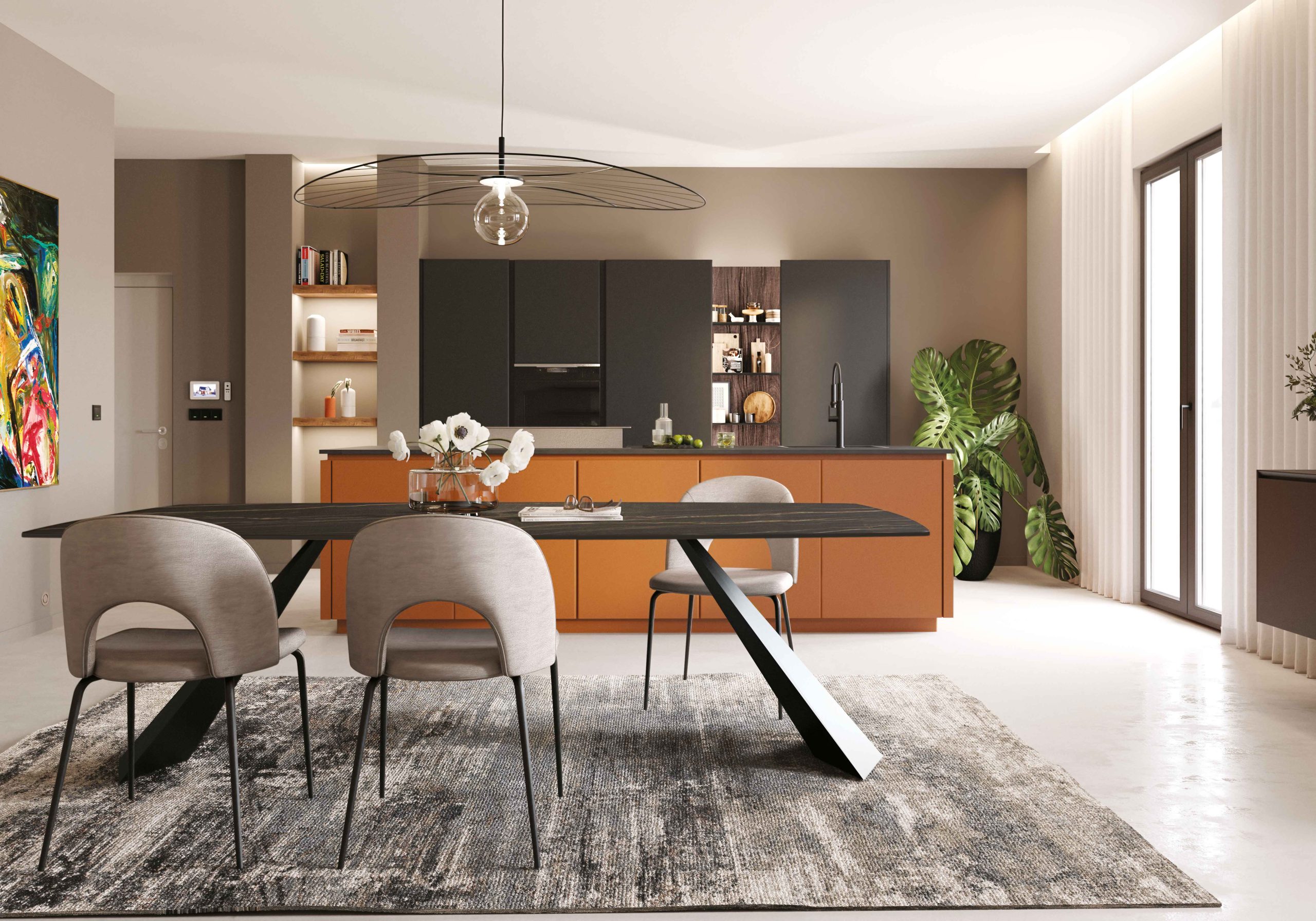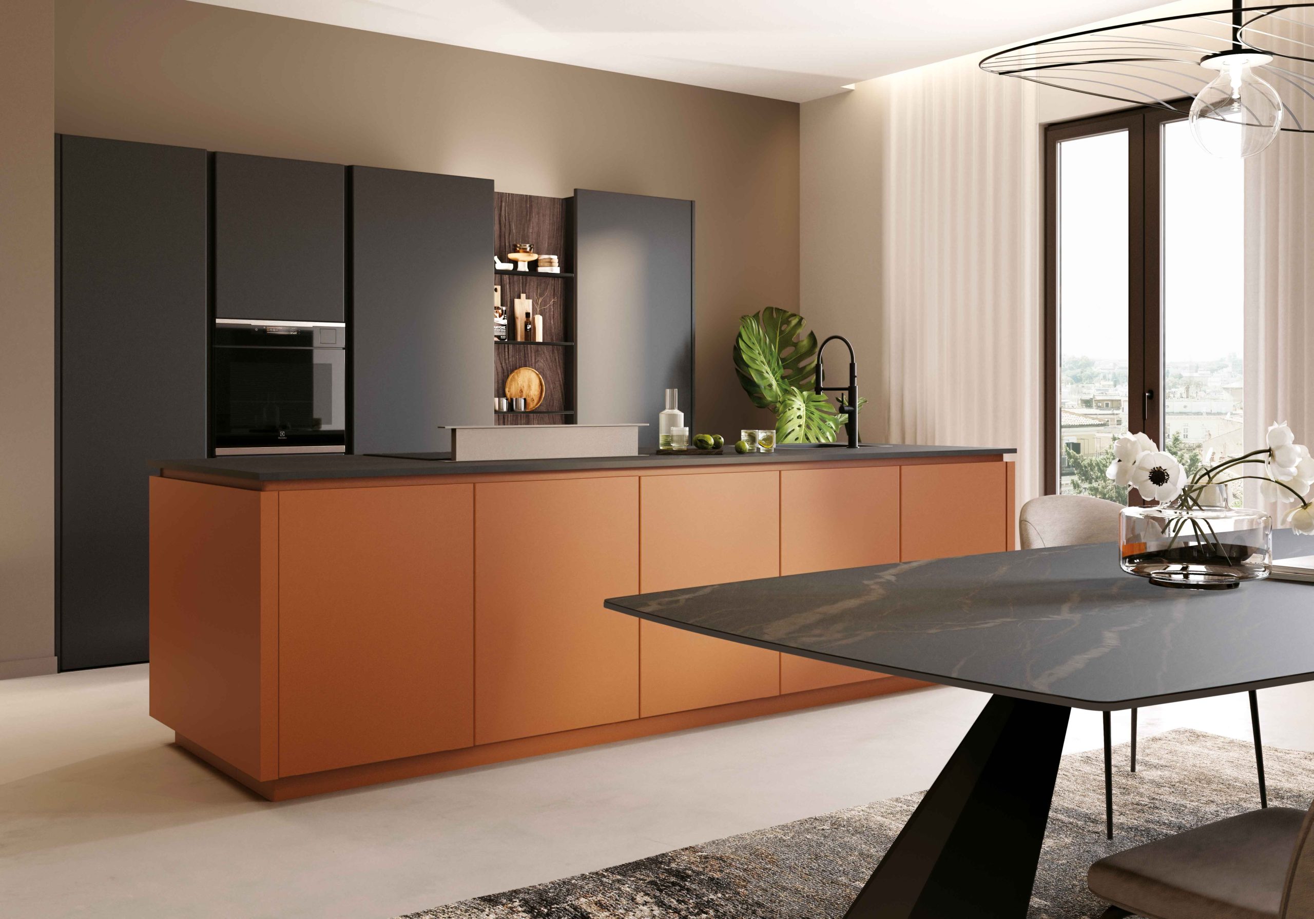 Gioca sull’elegante abbinamento tra arancio e grigio antracite la cucina realizzata con il modello Pratica de La Casa Moderna. L’ampia isola da 310x99 cm è finita con ante e fiancate terminali in laccato opaco arancio, apertura con gole in laccato opaco in tinta, top in laminato con zoccoli abbinati. Il blocco colonne con ante a terra da 60 e 75 cm è invece in finitura seta con fiancate a vista in tinta; l’apertura a gola delle ante si abbina agli zoccoli in tinta e alle gole. Nelle colonne si integra la boiserie che arriva fino a terra e finita con schienale in nobilitato, mensole in HPL nero opaco e luci