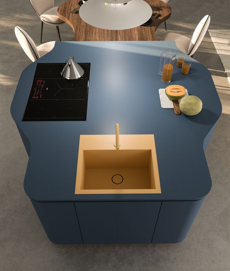 di Penelope, di Aran Cucine, soluzione dalle linee pop che vede protagonista l’isola in HPL Blu Berta Ker opaco, materiale tecnico di forte effetto estetico e ad alte prestazioni. Il design d’impatto dell’isola è dato dalle linee curve di ante e top blu, e si completa con il basamento, le gole e gli zoccoli Titanio e con il tavolo snack in HPL Rovere Rubra Alevè. In netto contrasto, il giallo di due elementi di Elleci: il rubinetto Kent oro e il lavello nella finitura Clay con piletta oro.