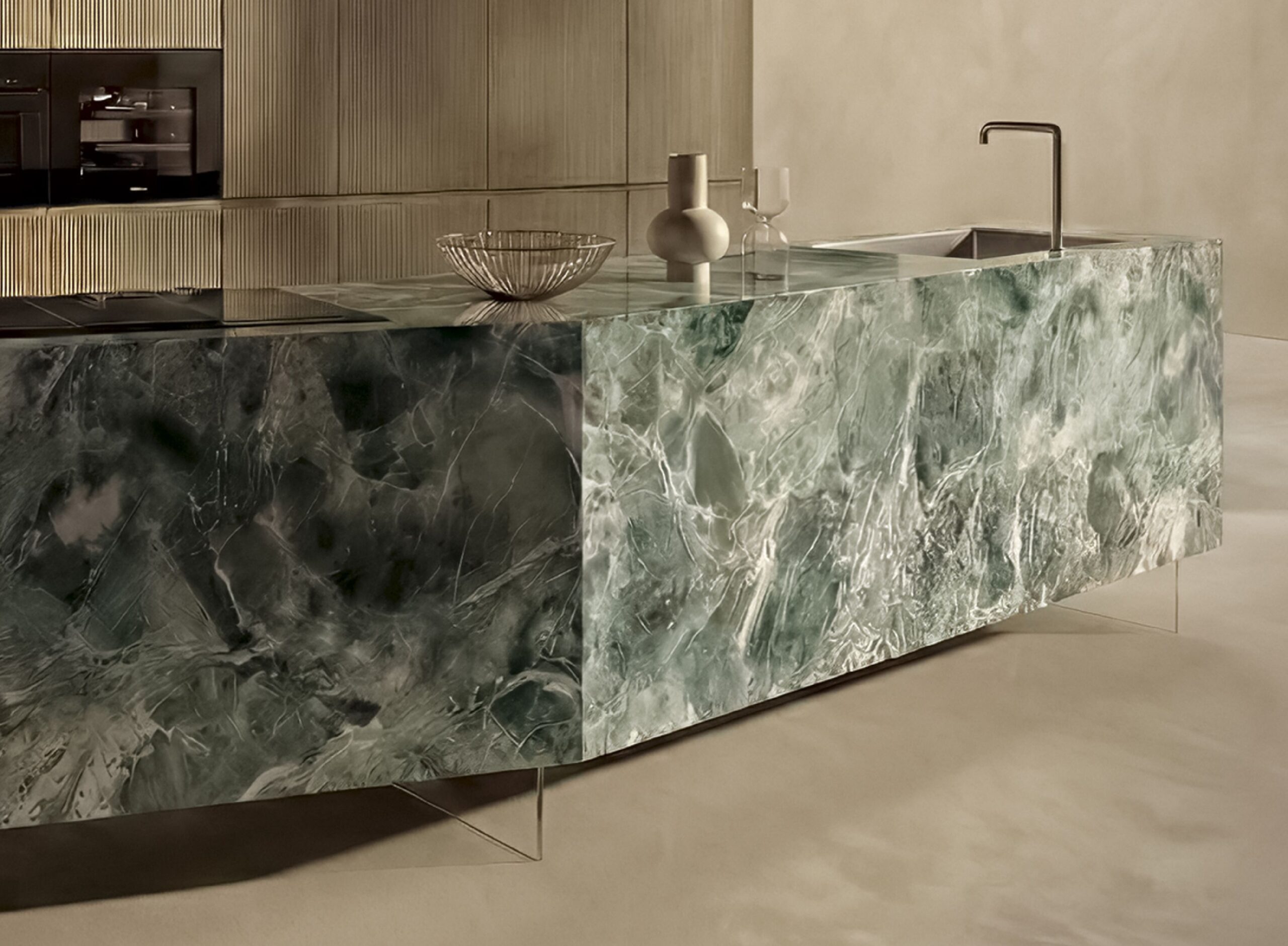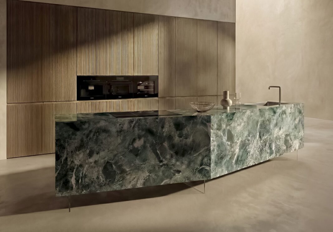 Un'importante tappa evolutiva per Lago, che al Salone del Mobile - Pad. 24, Stand D06 - e nel Lago Flagship Store Milano, in via Durini 5, presenta la cucina 36e8 Formae (design Daniele Lago), modello che esplora nuove possibilità progettuali superando la tradizionale configurazione lineare che da sempre caratterizza le cucine del brand. Ecco quindi un'isola dalla forma angolata e dinamica, che mantiene la totale pulizia formale grazie all’assenza di maniglie, alla continuità di finitura sulle superfici e a venature che scorrono senza interruzioni tra frontali e piano. In questa soluzione, l'isola di grandi dimensioni dal movimento geometrico diventa così un volume monomaterico e scultoreo anche grazie al particolare effetto marmo del vetro XGlass Verde Alpi Lucido impiegato per top, fiancate e frontali. Cifra distintiva del linguaggio Lago è anche il tema progettuale della sospensione: l'isola pare infatti fluttuare grazie ai sostegni in vetro temperato trasparente, che alleggeriscono il carattere monolitico del volume. La forma dell’isola diventa un invito al dialogo, al movimento attorno alla cucina, trasformandola in uno spazio capace di attivare relazioni più fluide e conviviali.