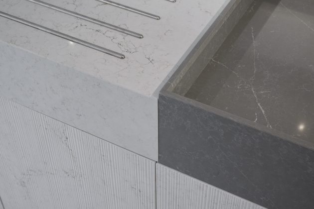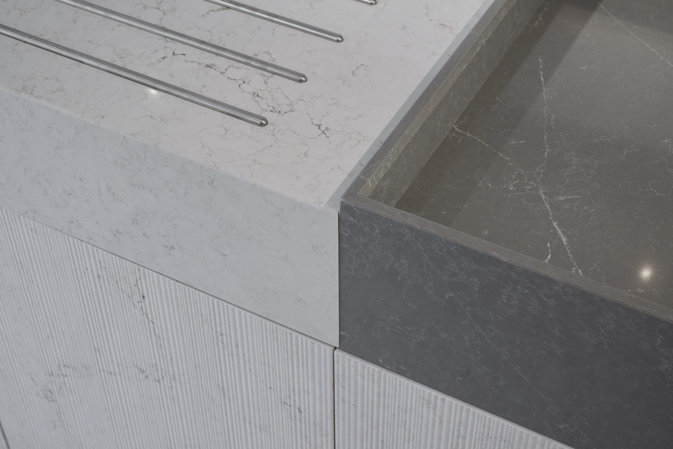 Through-grained veining, reliefs, and depth of design are ways to make engineered products increasingly similar to natural materials. The most striking example is presented by Marmo Arredo, which is shifting the paradigm of processing thanks to its exclusive partnership with Arke Vitium, a leading company in technologies applied to mineral surfaces. In practice, the Quartzform® slab, in an innovative formulation, is first machined and drilled to the project's specifications and then treated with a texturizing process that allows for the high-precision reproduction of the veining and nuances typical of natural stone.