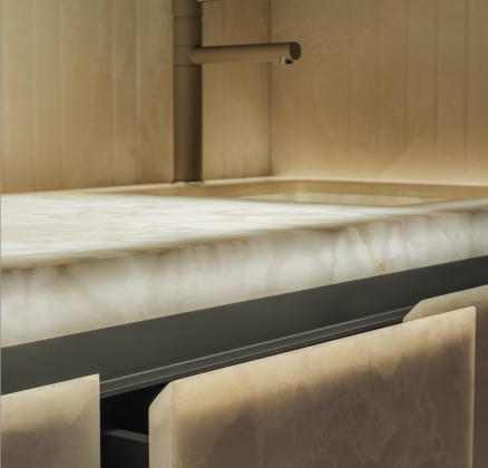 Simeg's extensive stone-working expertise is evident in the products presented at Sicam, particularly in the kitchen coated in LED-backlit white onyx, with rounded doors and worktop.
