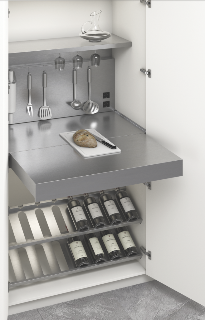 Made in satin-finish stainless steel, the A5-00 pull-out worktop is designed to provide additional support for everyday kitchen tasks. It integrates into any kitchen layout and can be installed on tall units or cabinets with 600, 750, 900, and 1200 mm bases, with 110° hinges, and a minimum depth of 501 mm. The worktop slides out smoothly thanks to a high-capacity aluminum runner system.