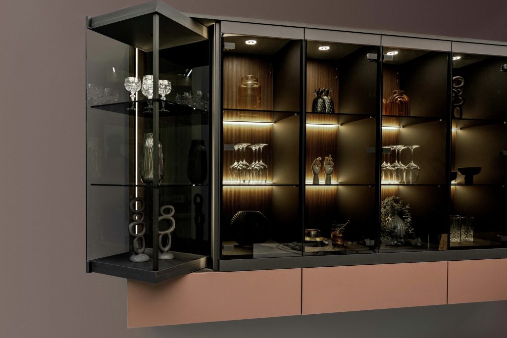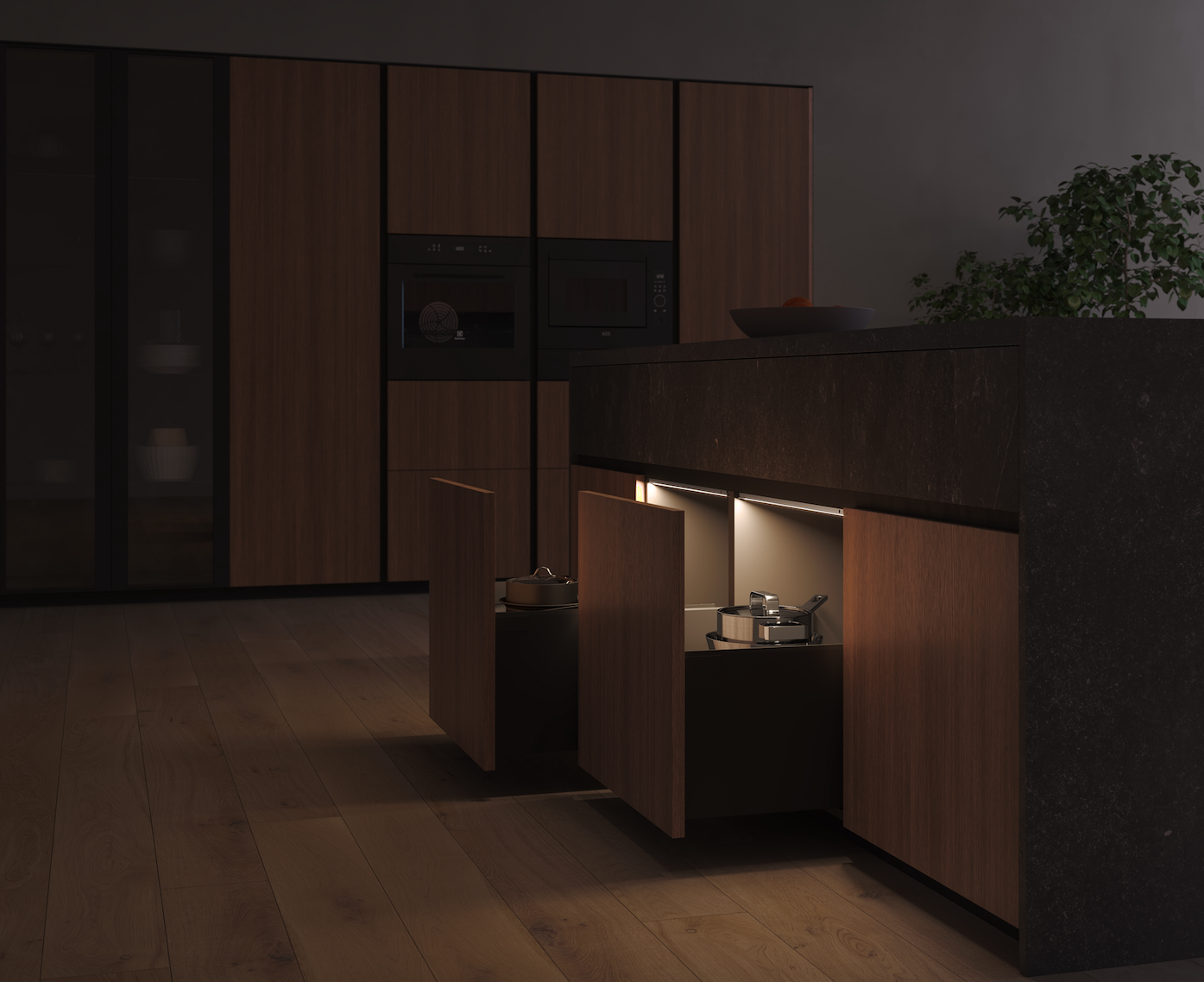 Designed to bring light where it's needed most, the TENDY and TENDY SF lighting profiles precisely illuminate the contents of the pull-out drawers, ensuring visual comfort while avoiding dispersion. The light chamber is designed with a slight inclination to direct the light beam directly towards the drawer opening, naturally following the user's gestures and enhancing the functionality of the cabinet. The lights are turned on and off automatically thanks to the integrated infrared sensor.
