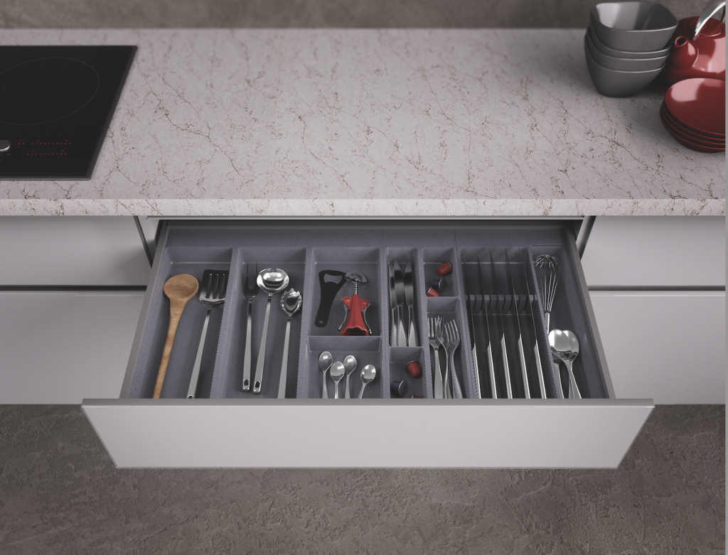 A drawer divider designed to combine design and practicality. 805 Lite is a durable, lightweight, and modular cutlery tray: two trays—one with a double profile and one with a single profile—and a compensator tray that expands the capacity to fill the entire drawer.