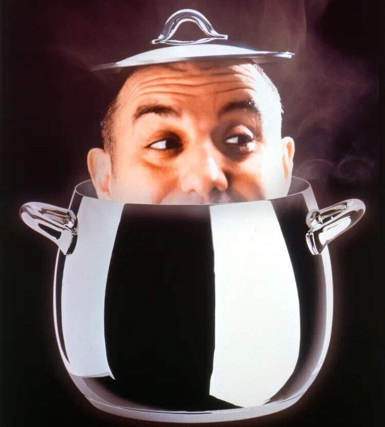 Celebre scatto fotografico che ritrae Stefano Giovannoni all'interno della pentola Mami