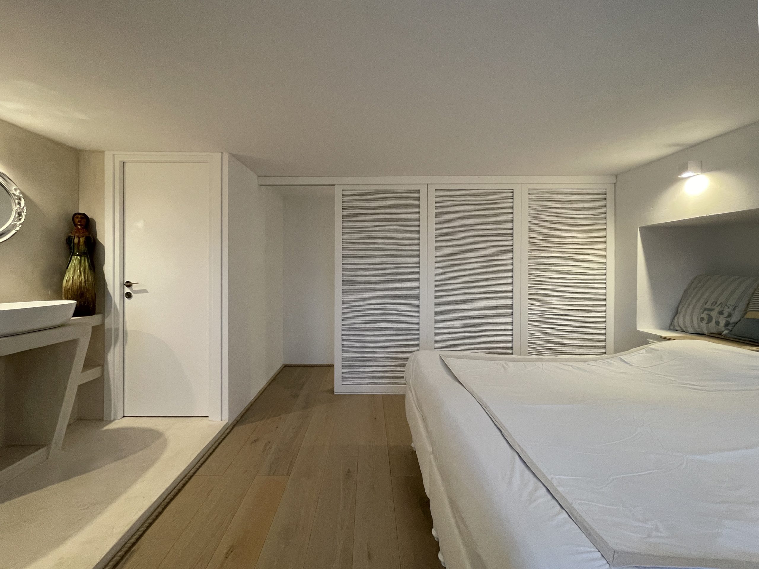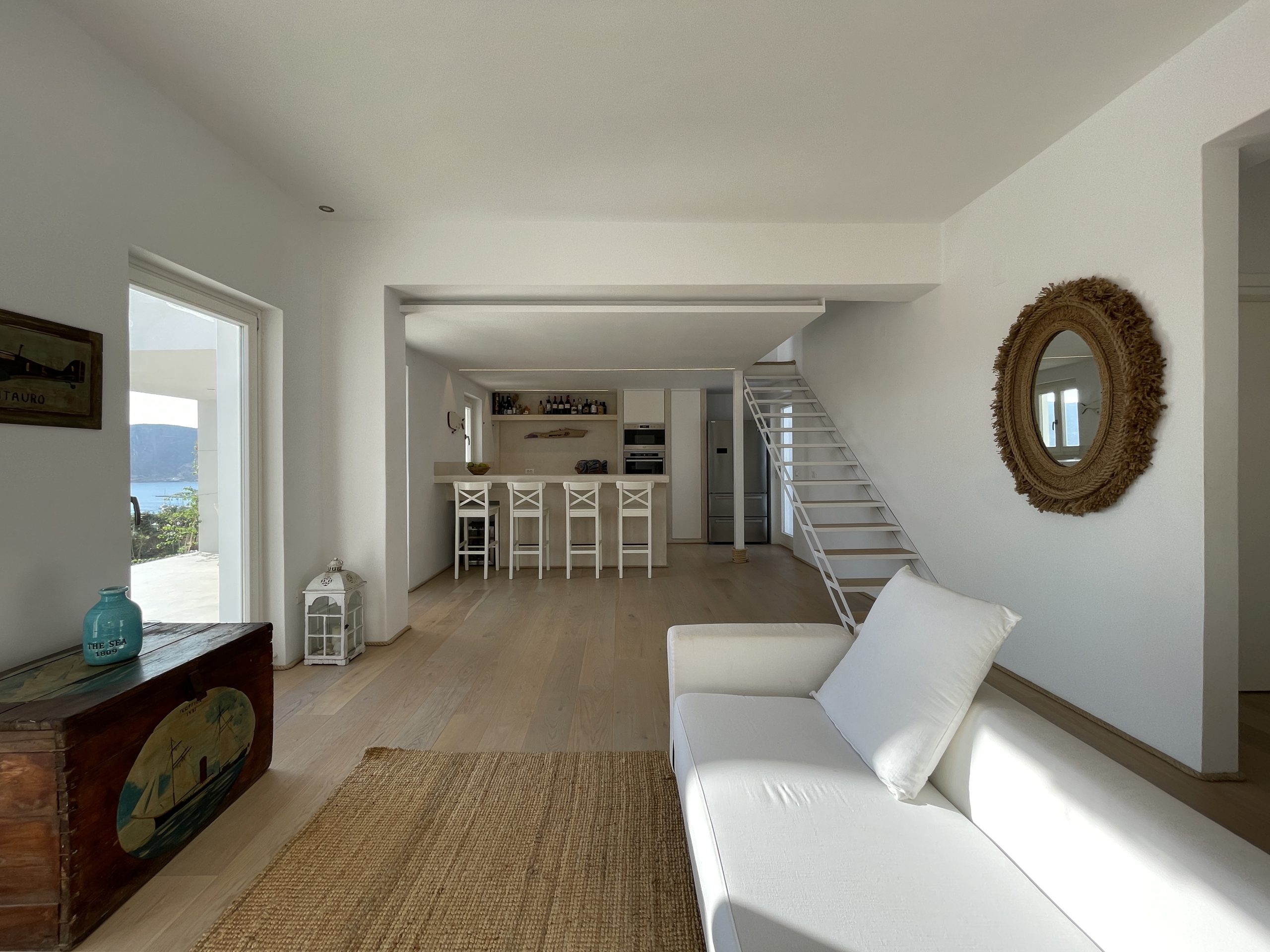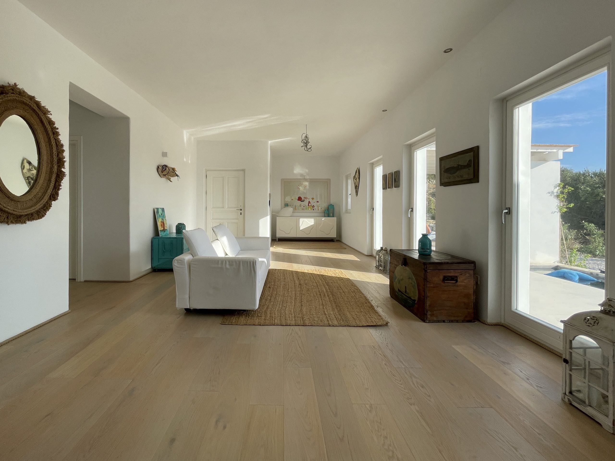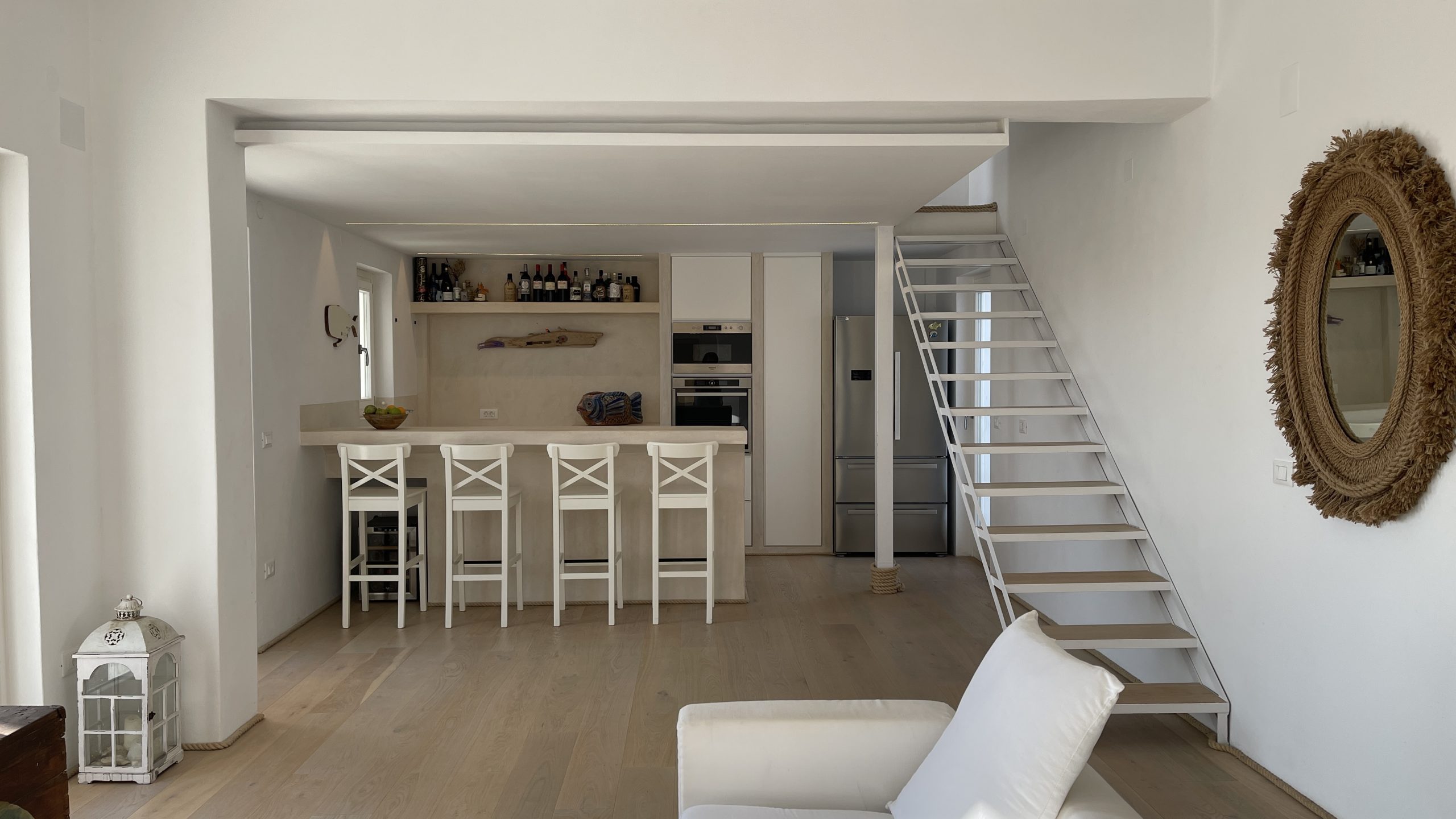 L'abitazione si compone di 2 camere con bagno per i tre figli, una camera padronale con cabina armadio e bagno en suite. "I materiali sono il più possibile naturali: legno per il parquet interno, calce bianca per le pareti, ancora legno dipinto di bianco per i serramenti, tadelakt per il piano delle cucina con ante e cassetti costruiti da un falegname locale. Gli altri arredi, come si unsa nelle case di vacanza in Grecia, sono il risultato di una raccolta di oggetti d’arte e artigianato locale dei proprietari nella loro più che decennale frequentazione dell’isola".