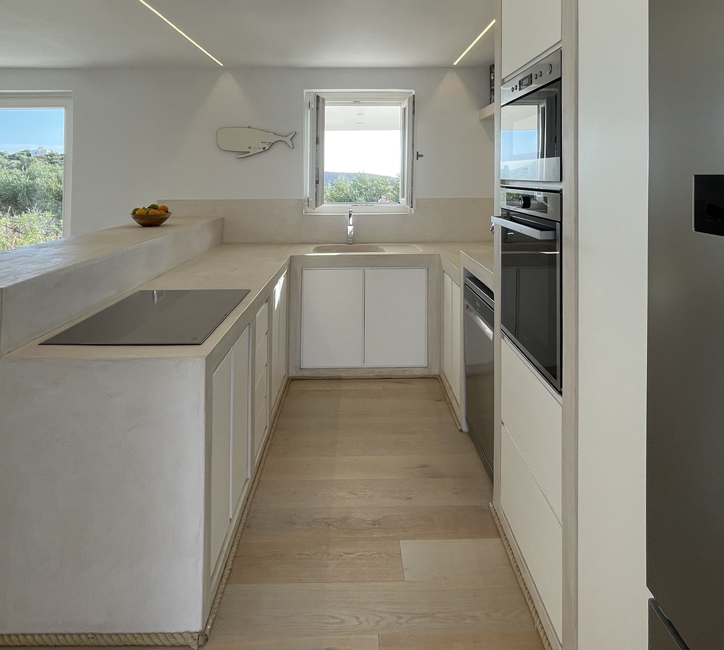"La cucina è stata costruita in loco da un bravo artigiano locale. E' costituita da mattoni rivestiti a calce tadelakt trattata a cera, per la massima naturalità; semplici ante in legno tinteggiate di bianco la completano".