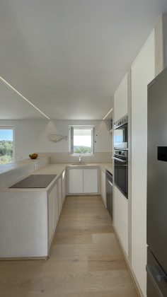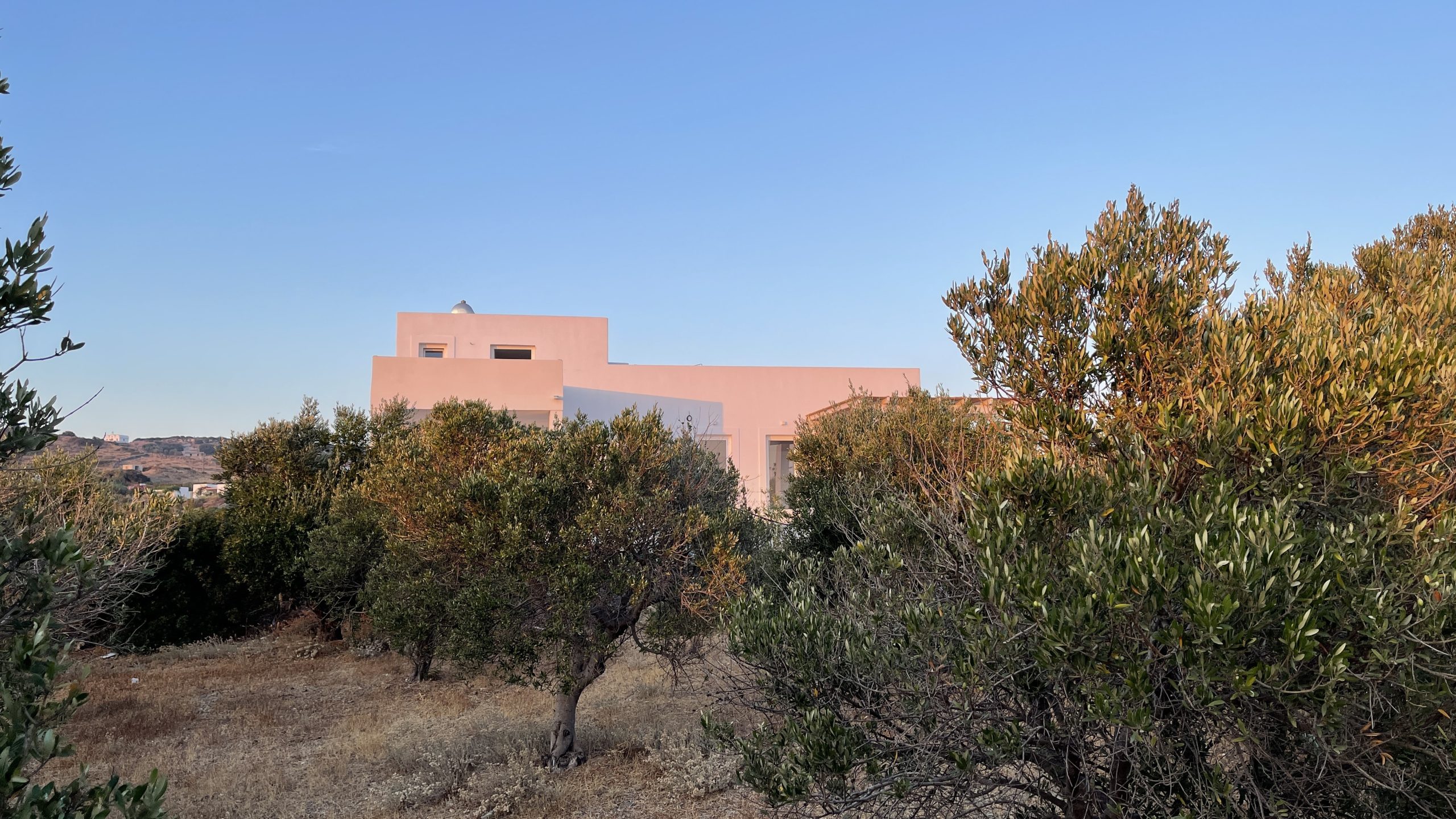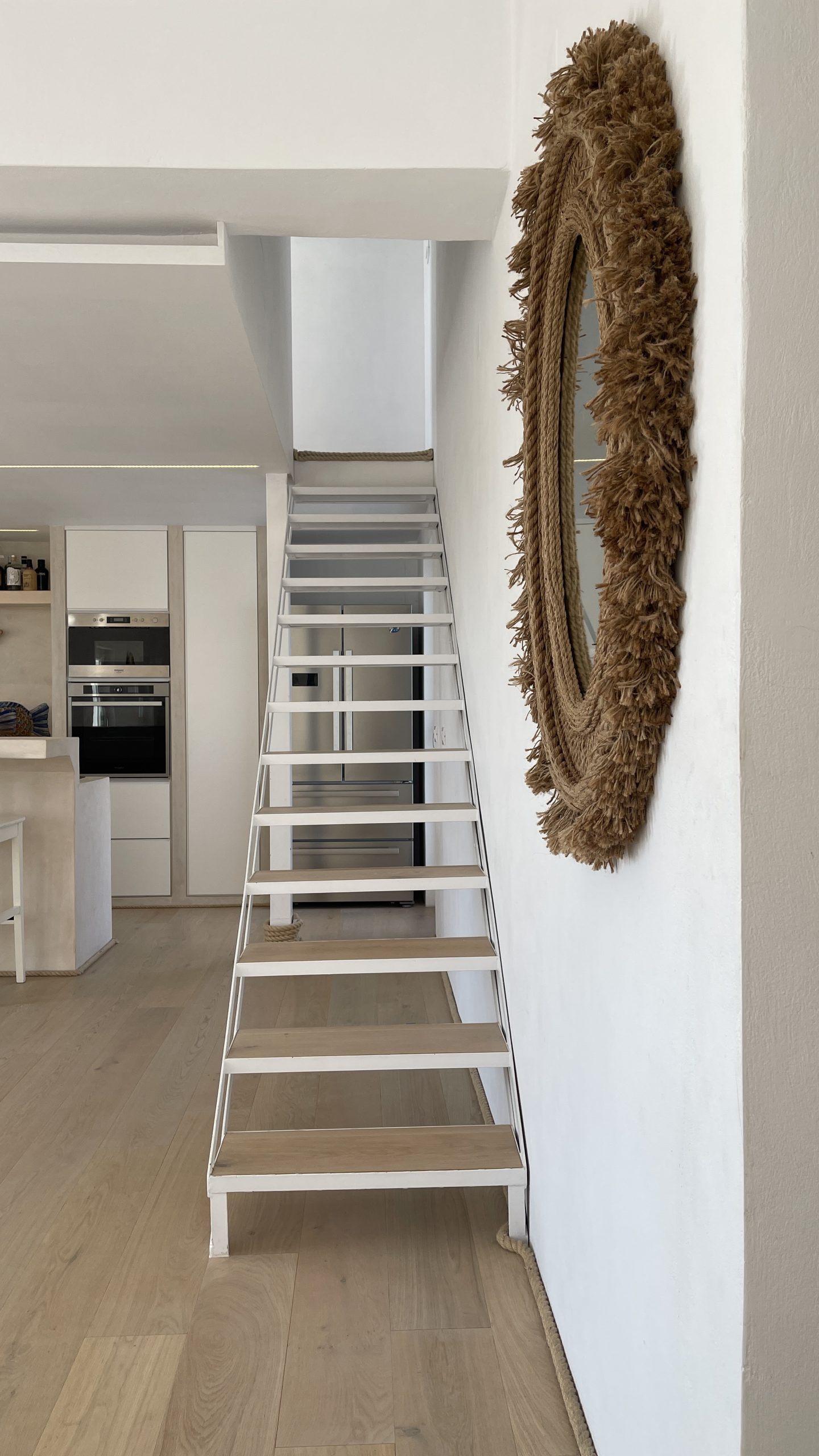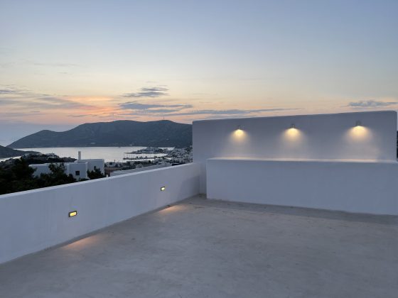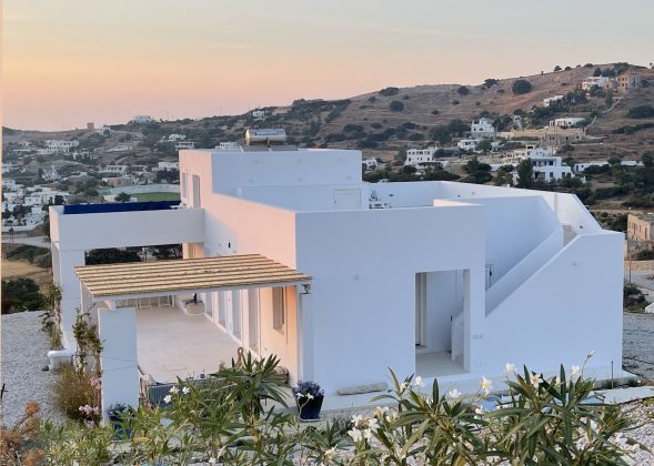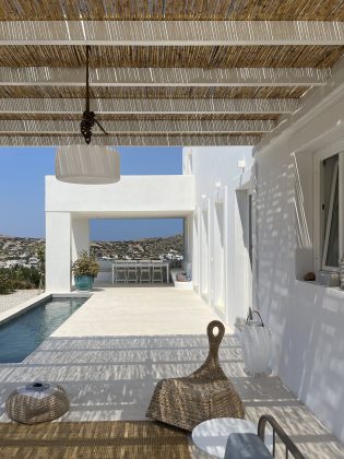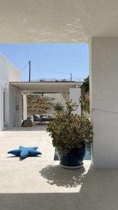L'abitazione si compone di 2 camere con bagno per i tre figli, una camera padronale con cabina armadio e bagno en suite. "I materiali sono il più possibile naturali: legno per il parquet interno, calce bianca per le pareti, ancora legno dipinto di bianco per i serramenti, tadelakt per il piano delle cucina con ante e cassetti costruiti da un falegname locale. Gli altri arredi, come si unsa nelle case di vacanza in Grecia, sono il risultato di una raccolta di oggetti d’arte e artigianato locale dei proprietari nella loro più che decennale frequentazione dell’isola".