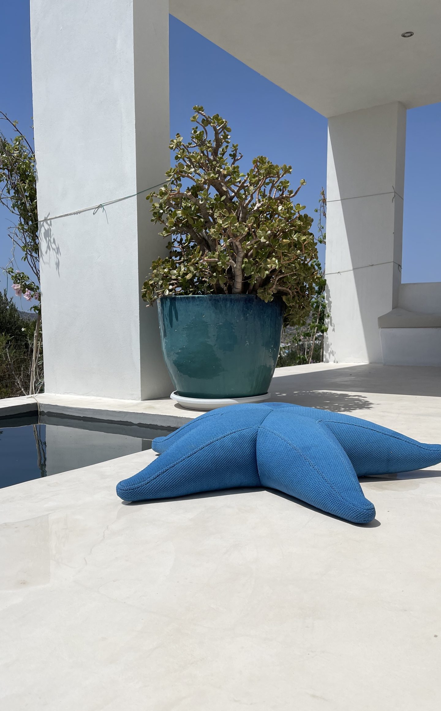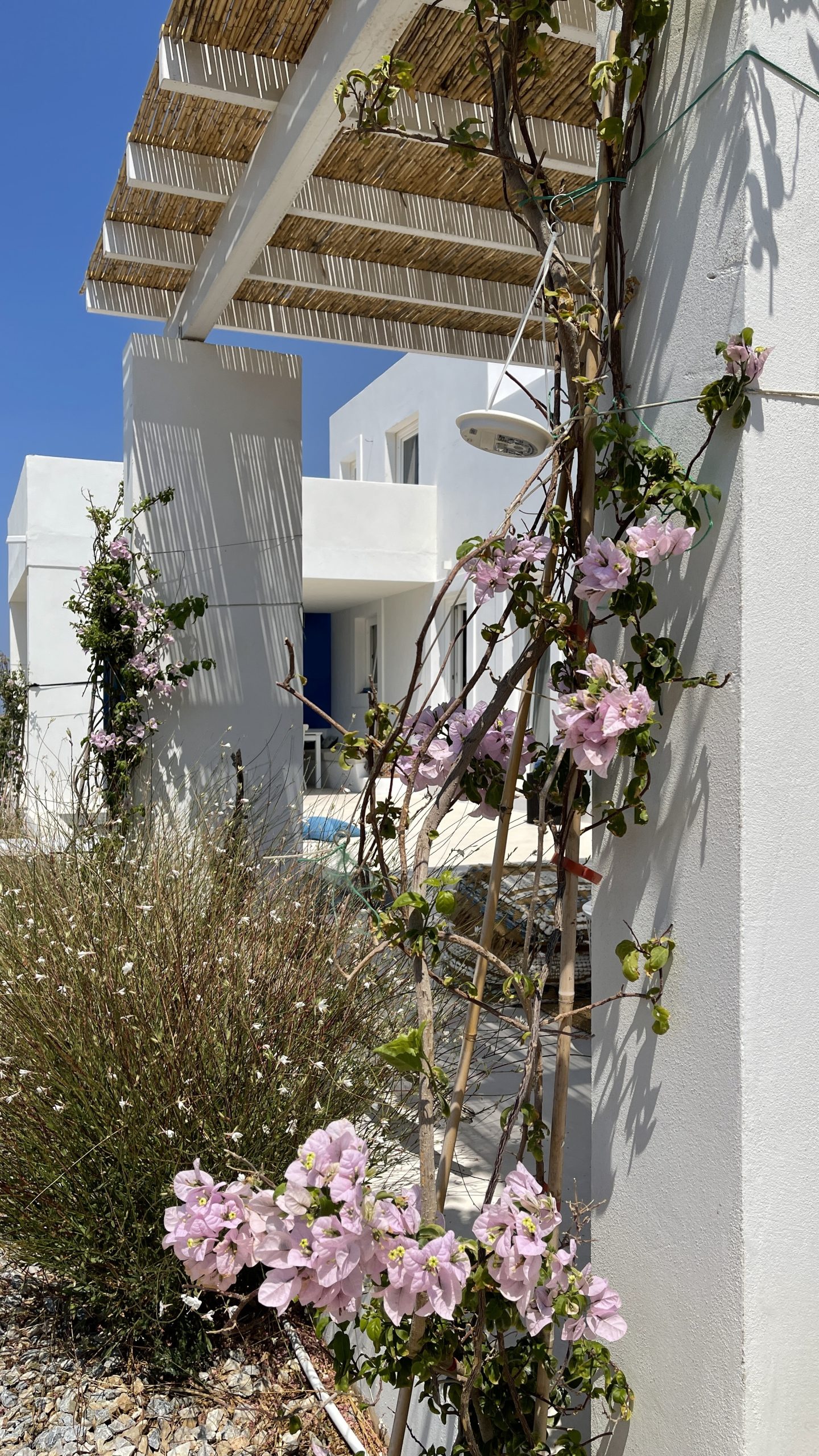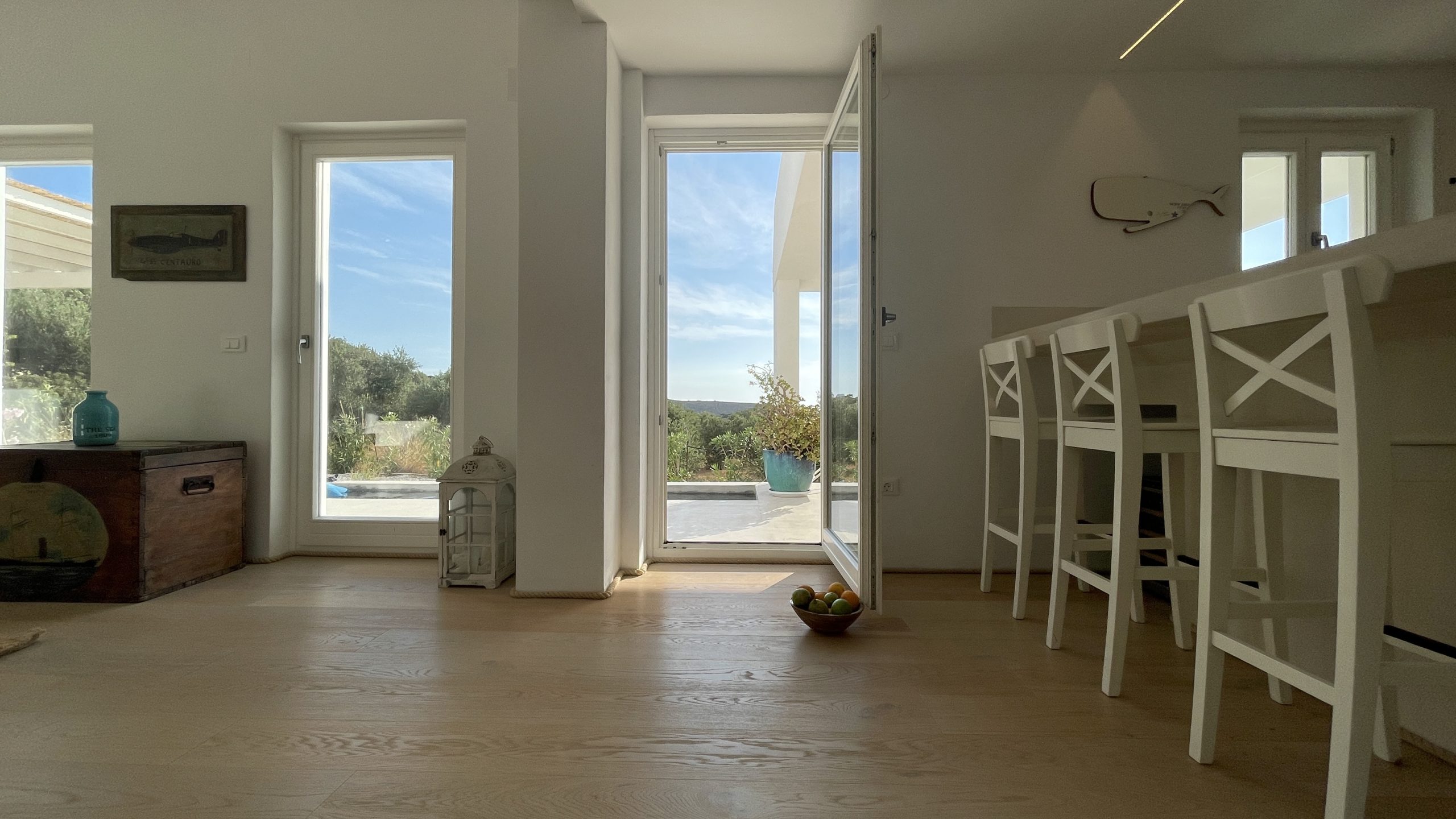 L'abitazione si compone di 2 camere con bagno per i tre figli, una camera padronale con cabina armadio e bagno en suite. "I materiali sono il più possibile naturali: legno per il parquet interno, calce bianca per le pareti, ancora legno dipinto di bianco per i serramenti, tadelakt per il piano delle cucina con ante e cassetti costruiti da un falegname locale. Gli altri arredi, come si unsa nelle case di vacanza in Grecia, sono il risultato di una raccolta di oggetti d’arte e artigianato locale dei proprietari nella loro più che decennale frequentazione dell’isola".