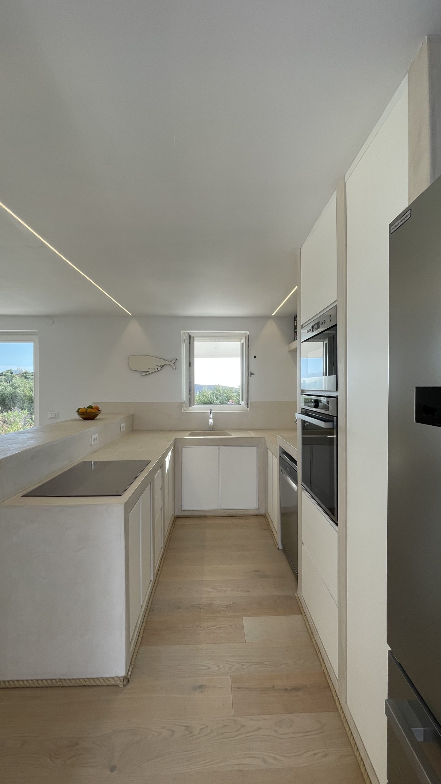 "La cucina è stata costruita in loco da un bravo artigiano locale. E' costituita da mattoni rivestiti a calce tadelakt trattata a cera, per la massima naturalità; semplici ante in legno tinteggiate di bianco la completano".