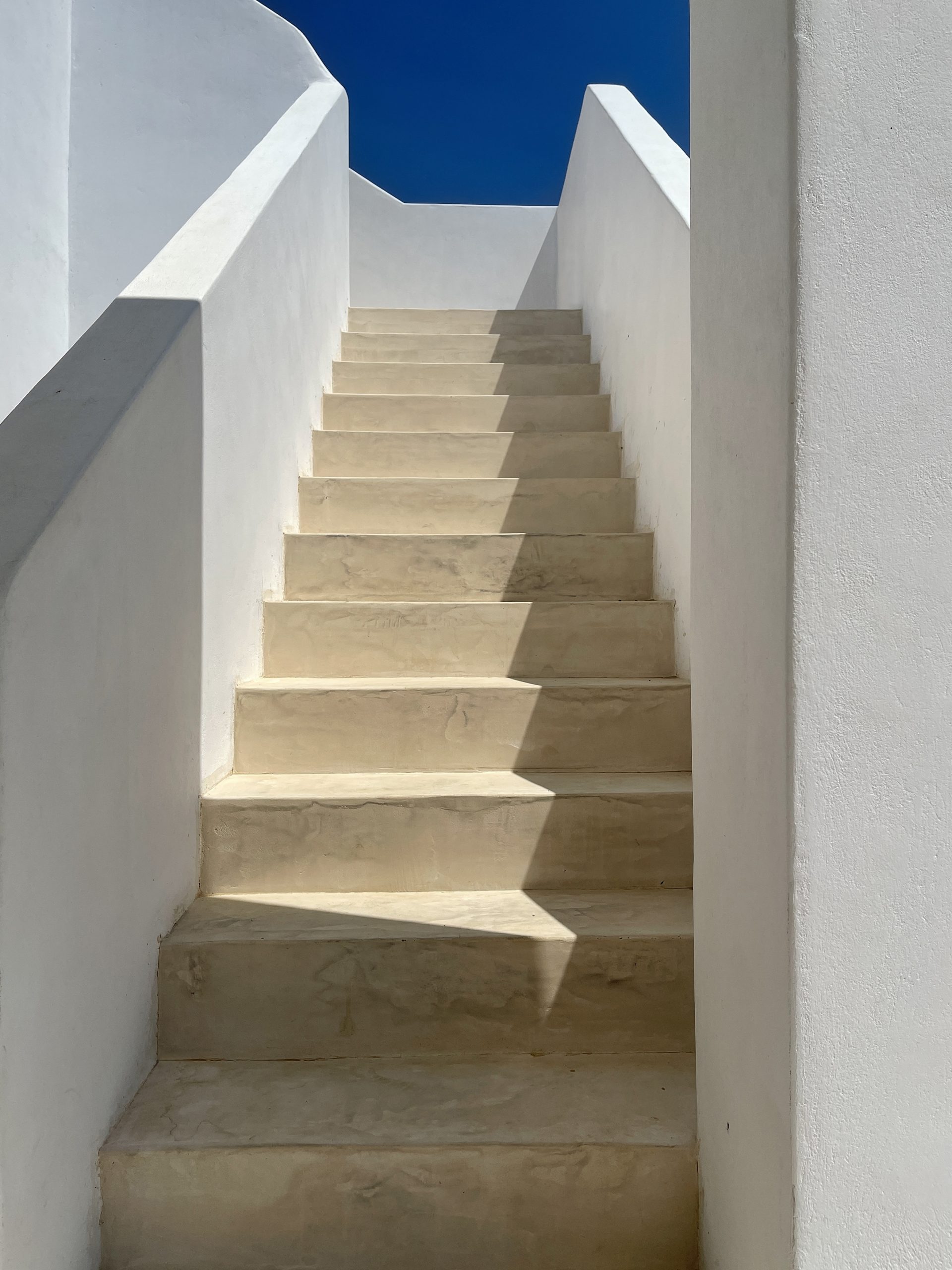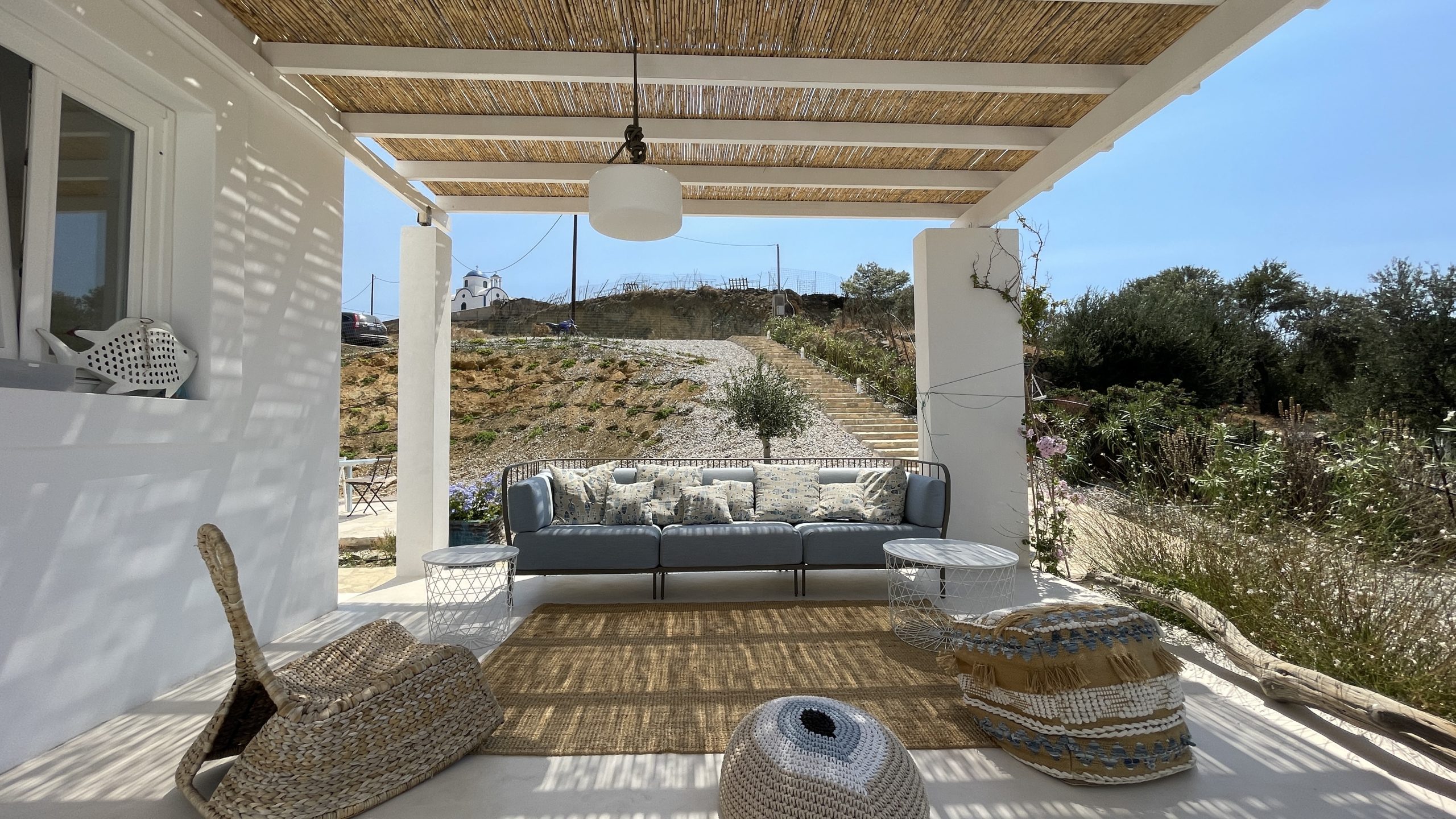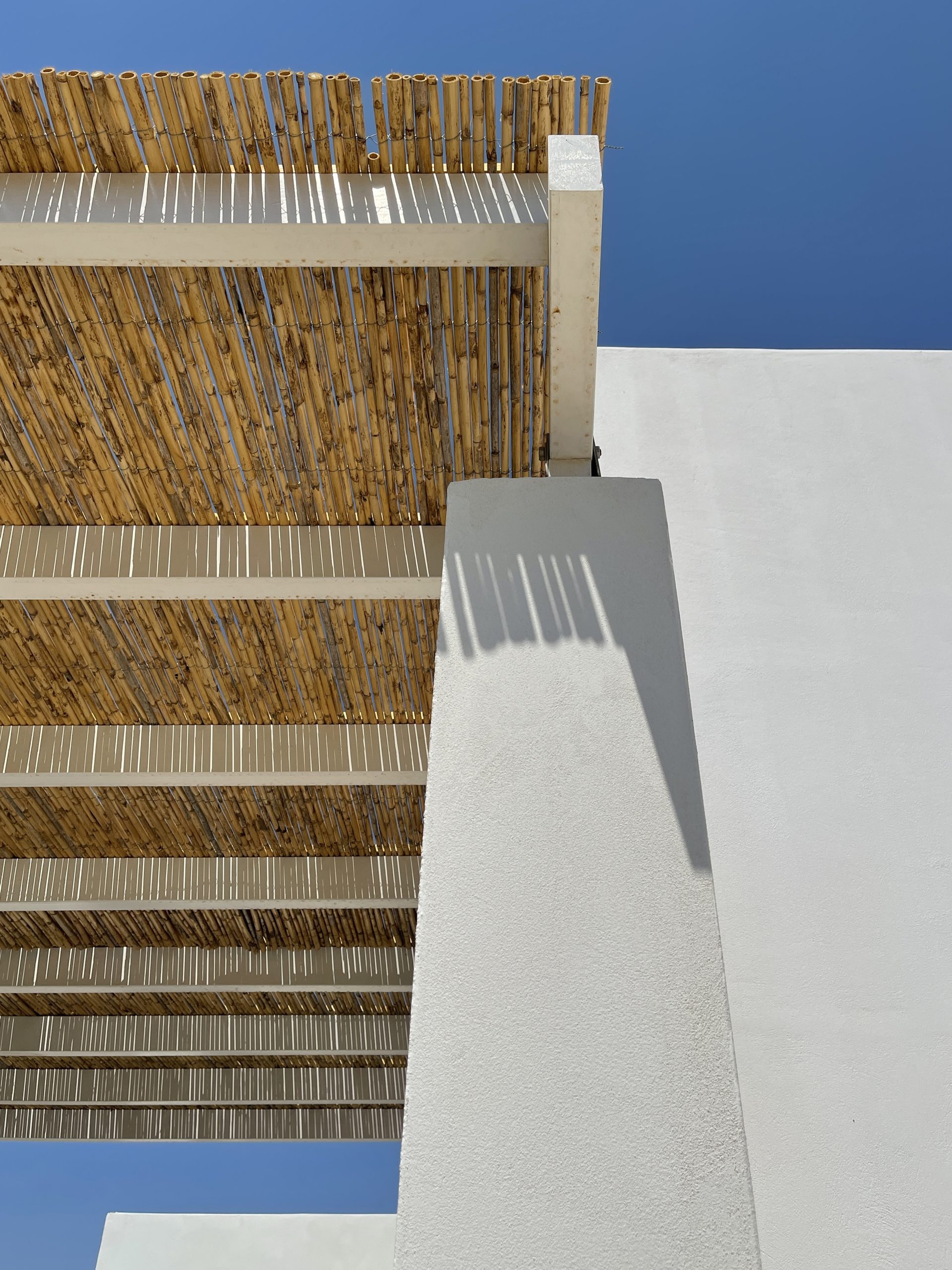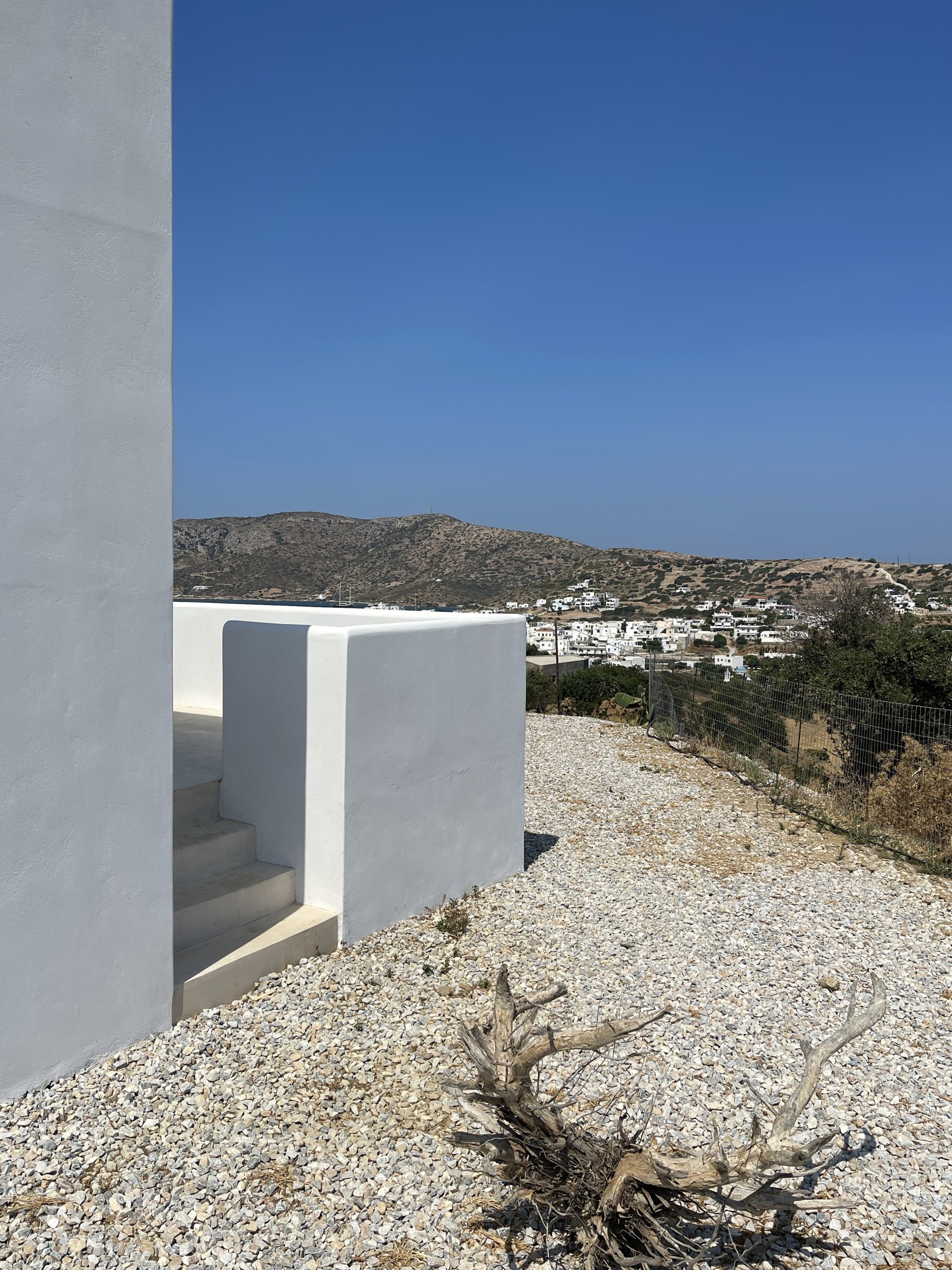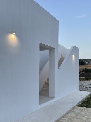 Presupposto fondamentale è stato "l'attento studio dei venti e in particolare del Meltemi che in alcuni momenti dell’anno soffia talmente forte da limitare le attività all’aperto", dice Mauro Rivolta. "Quindi, al nostro normale approccio alla progettazione bioclimatica tipica dello Studio Ecoarch (collocazione all’interno del lotto, esposizione ai raggi solari, rapporto pieni/vuoti, ecc…) abbiamo aggiunto, in questo caso, anche una particolare attenzione nel generare degli spazi aperti come patii e terrazze, ma protetti dai venti", continua il progettista."Gli spazi della casa si espandono quindi all’esterno e incorniciano scorci suggestivi del paesaggio, ma sono al contempo al riparo dal Meltemi, vento che può spirare con particolare intensità per lunghi periodi dell’anno".