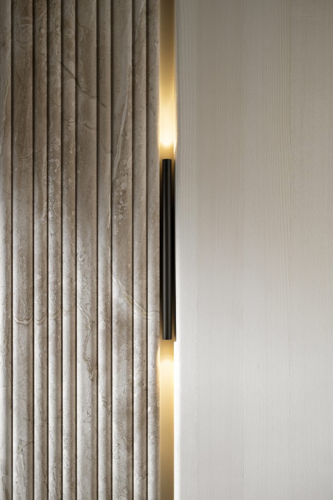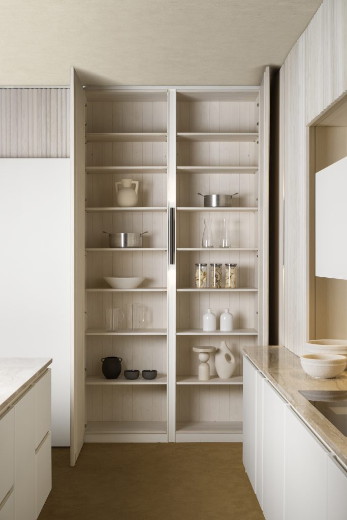 “The aim was to develop a project that would not only convey traditional luxury, but one that would also stand out as an innovative and unconventional solution, capable of creating a harmonious link between the interior spaces of the home and the natural world outside. For Levante I was inspired by the movements of sand on the shoreline, using bleached blond ash to obtain a natural, textured look. This wood, which calls to mind tree trunks stripped of their bark on Mediterranean beaches, is solid European ash, seasoned and dried. The boards are worked to create a wave-like effect and then balanced to ensure the stability of the timber. Finally, a special finish known as Palladio protects the fronts while maintaining the wood's natural quality.”
