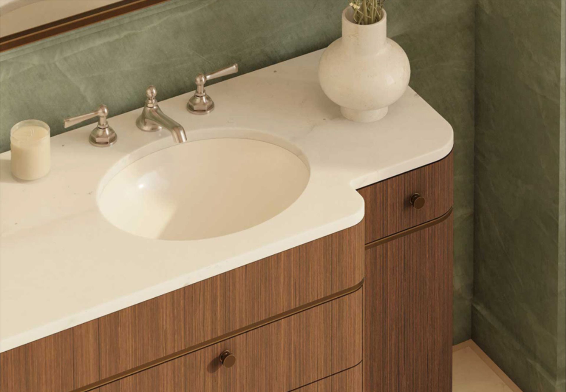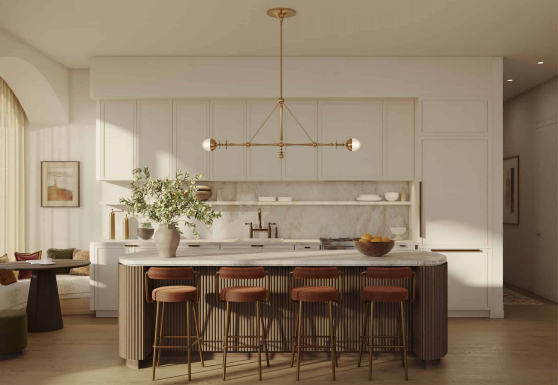 Un materiale è protagonista degli arredi Aran World creati per il progetto 520 Fifth Avenue, a Manhattan: si tratta del legno cannettato, impiegato sia con finitura laccata sia impiallacciata, che connota i diversi ambienti creando un fil rouge materico e visivo. Nelle cucine dalle linee pulite, il legno cannettato si abbina a materiali di pregio come il quarzo per i piani di lavoro e per gli schienali.