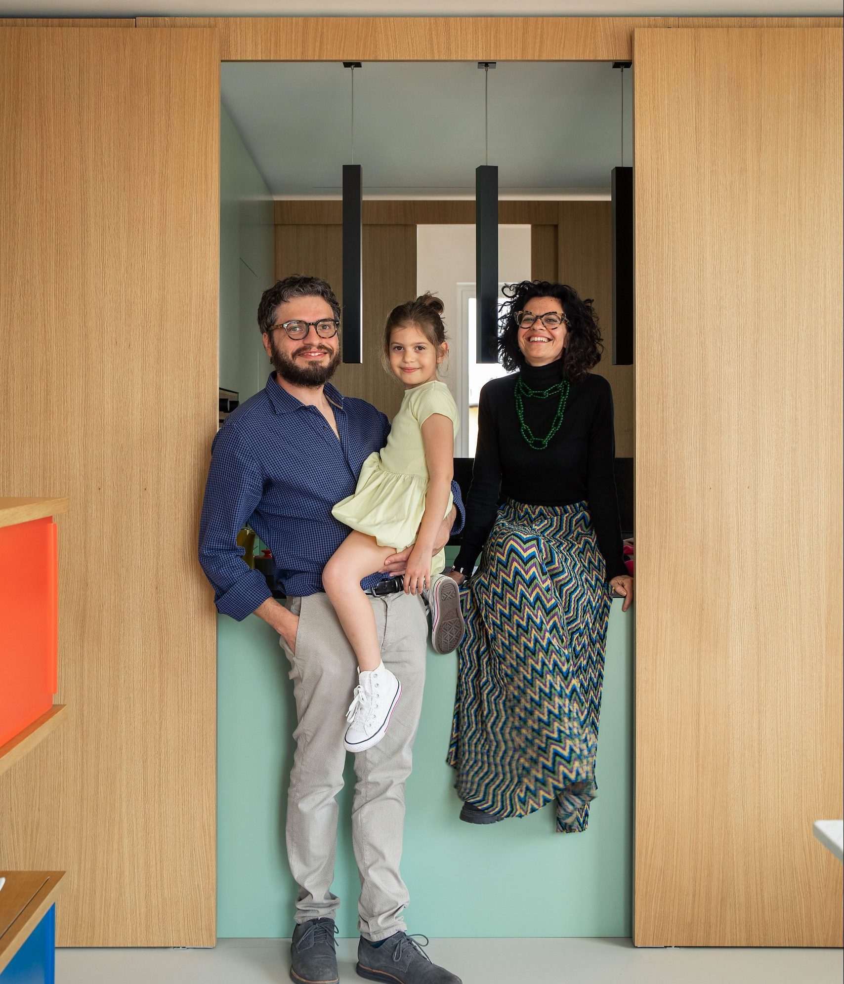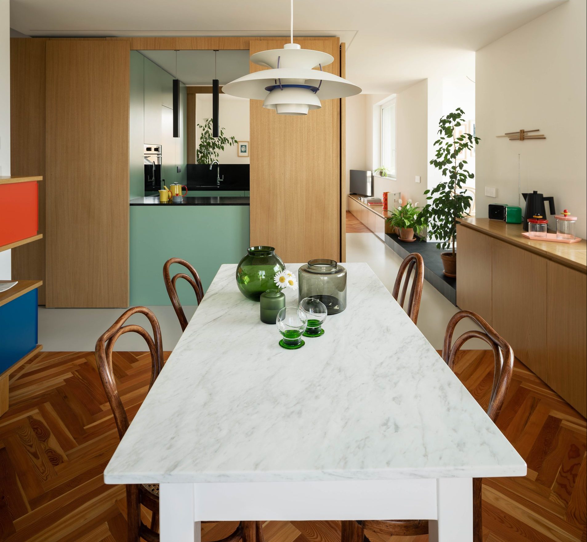 "La cucina e i bagni invece sono stati piastrellati con le medesime ceramiche posate però in modo diverso, così da da creare un differente gioco geometrico. I cromatismi pavimenti e cucina si ispirano a quelli delle cucine anni ’50, per enfatizzarne i rimandi".