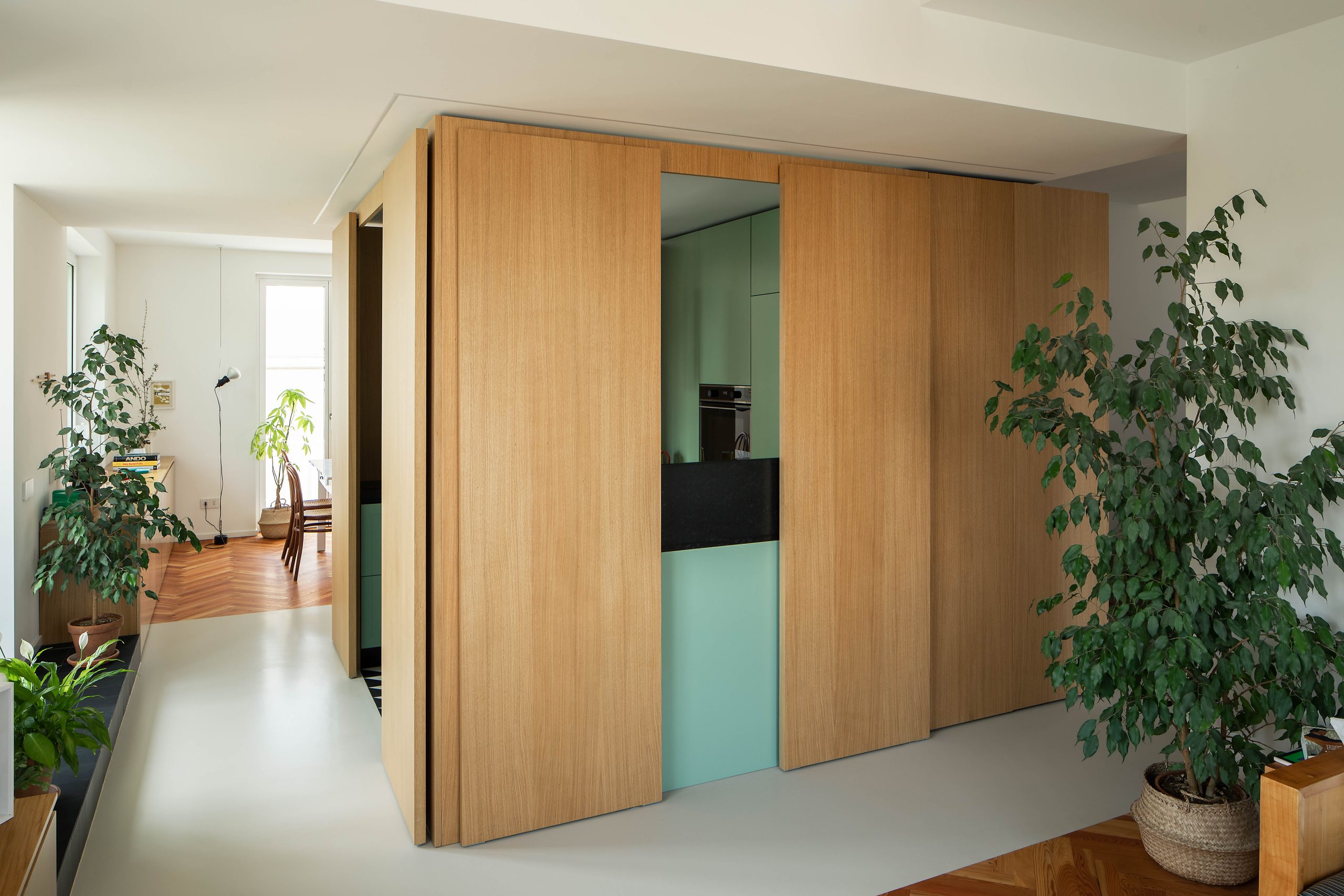 Un'idea originale e di forte resa estetica, dunque, quella di creare un blocco-cucina richiudibile e indipendente. "La cucina è un ambito funzionalmente separato dal resto del living, ed è richiudibile quando necessario", continua l'architetto Bosio. "Quando però le ante della scatola si aprono, l’effetto è quello di una cucina ad isola, strettamente in relazione con l'area pranzo da un lato e il soggiorno dall’altro". Posto esattamente al centro della zona giorno, il cubo che contiene la cucina è costituito da pareti e da ante scorrevoli che arrivano al soffino realizzate in legno di rovere; è circumnavigabile e rappresenta anche un elemento di partizione/connessione spaziale.